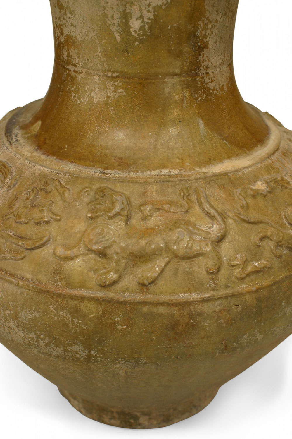 Asian Chinese (Han Dynasty 206BC-220AD) amber glazed pottery vase (jar) with a band of animals in relief raised on a modern 2½" high base.