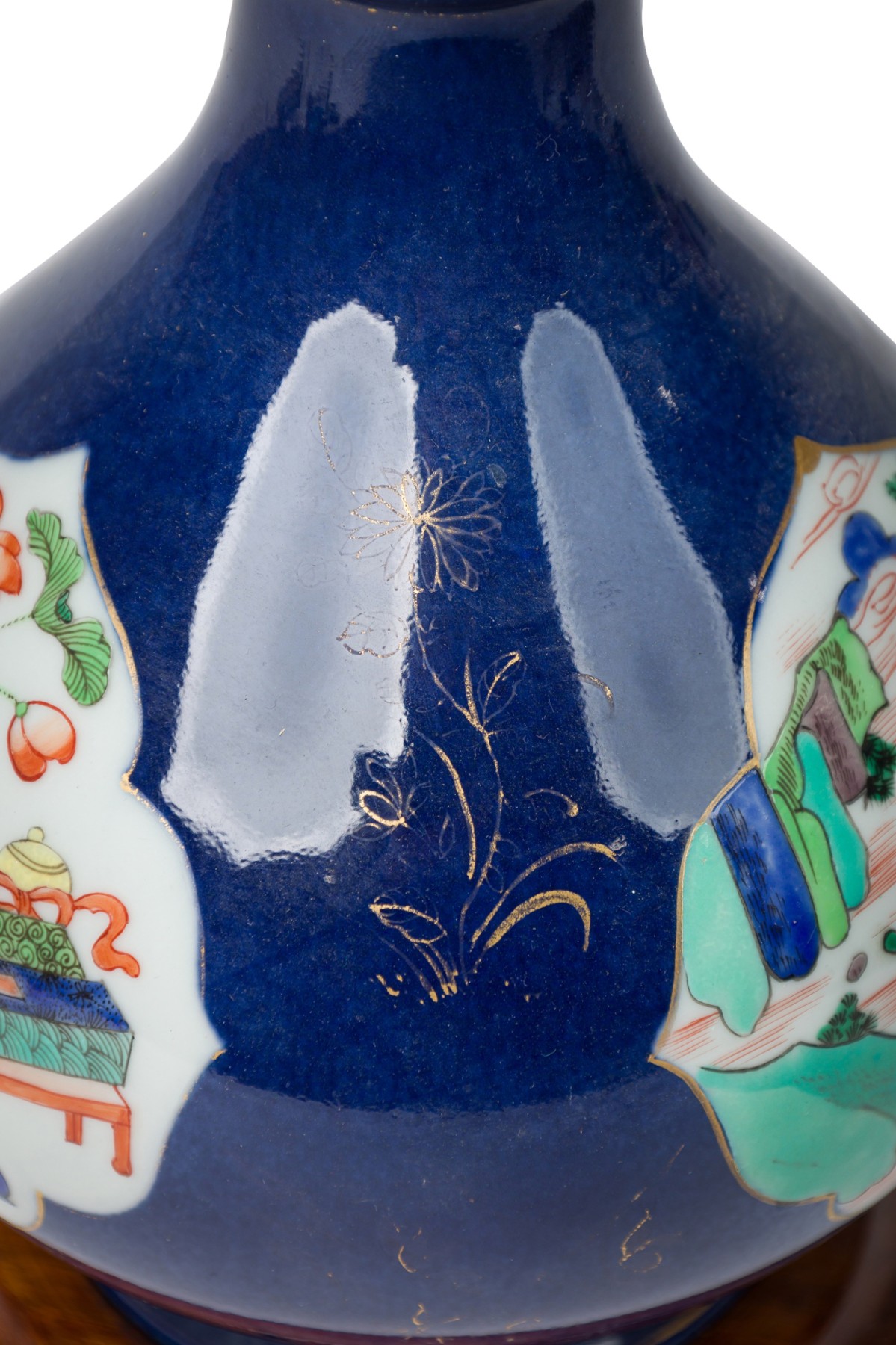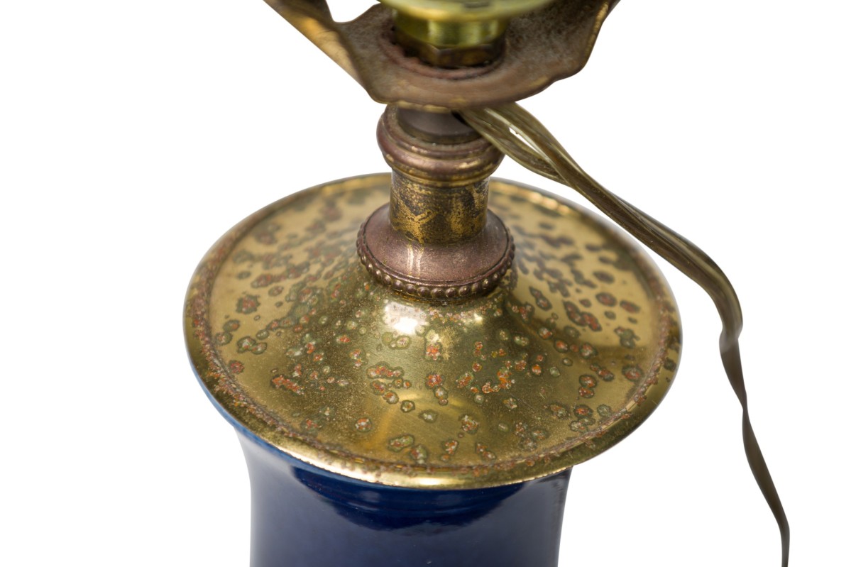 Chinese hand painted landscape and floral motif cobalt blue porcelain table lamp mounted on a wooden base with a brass stem