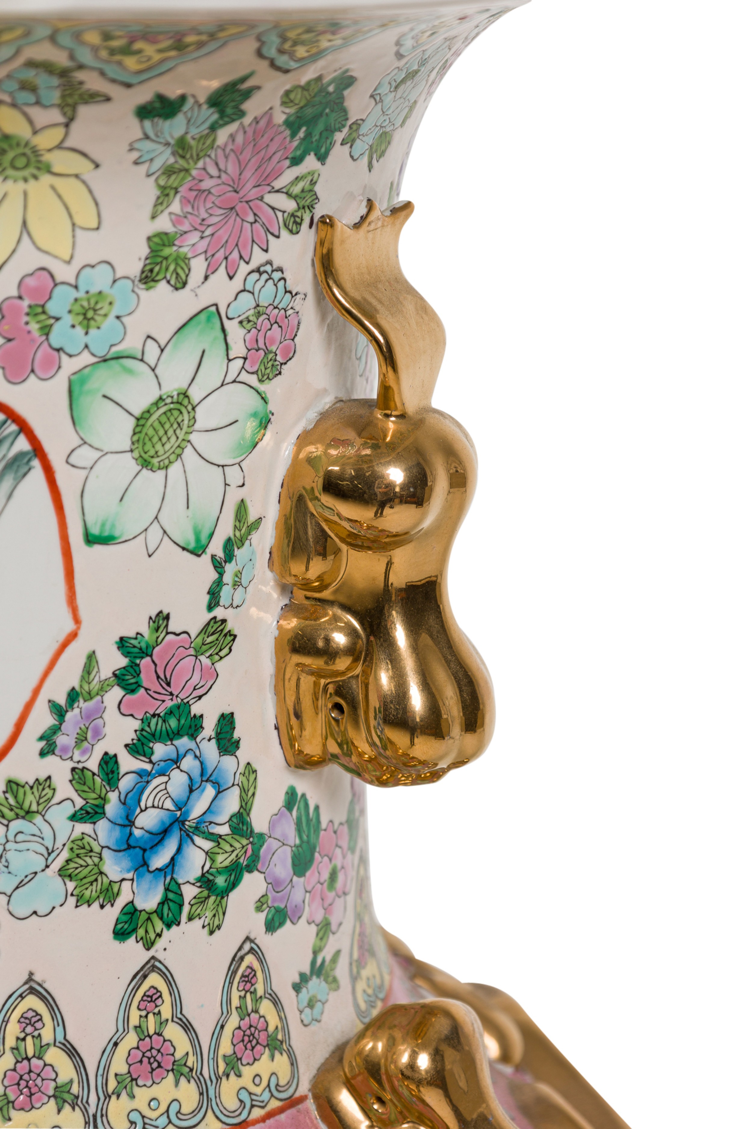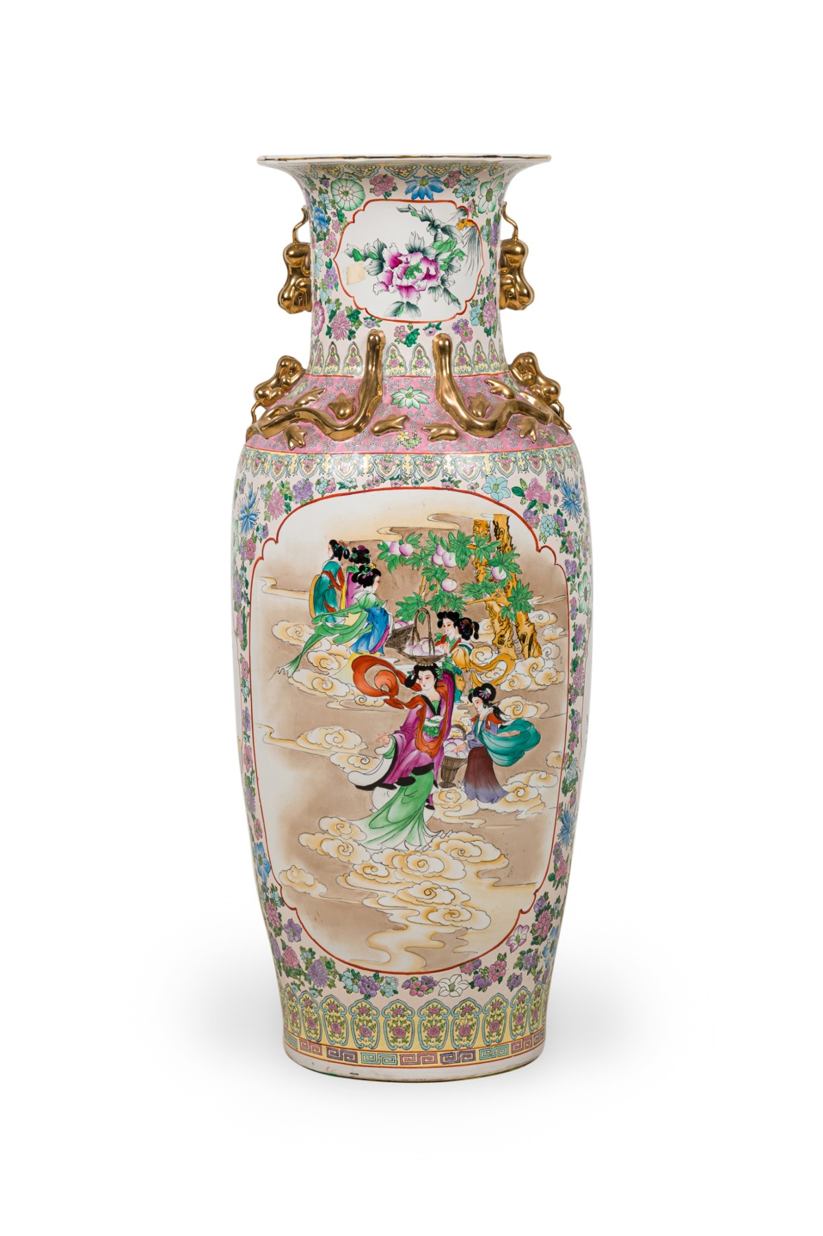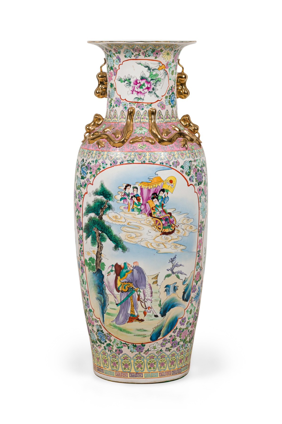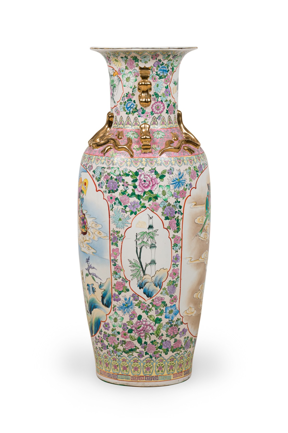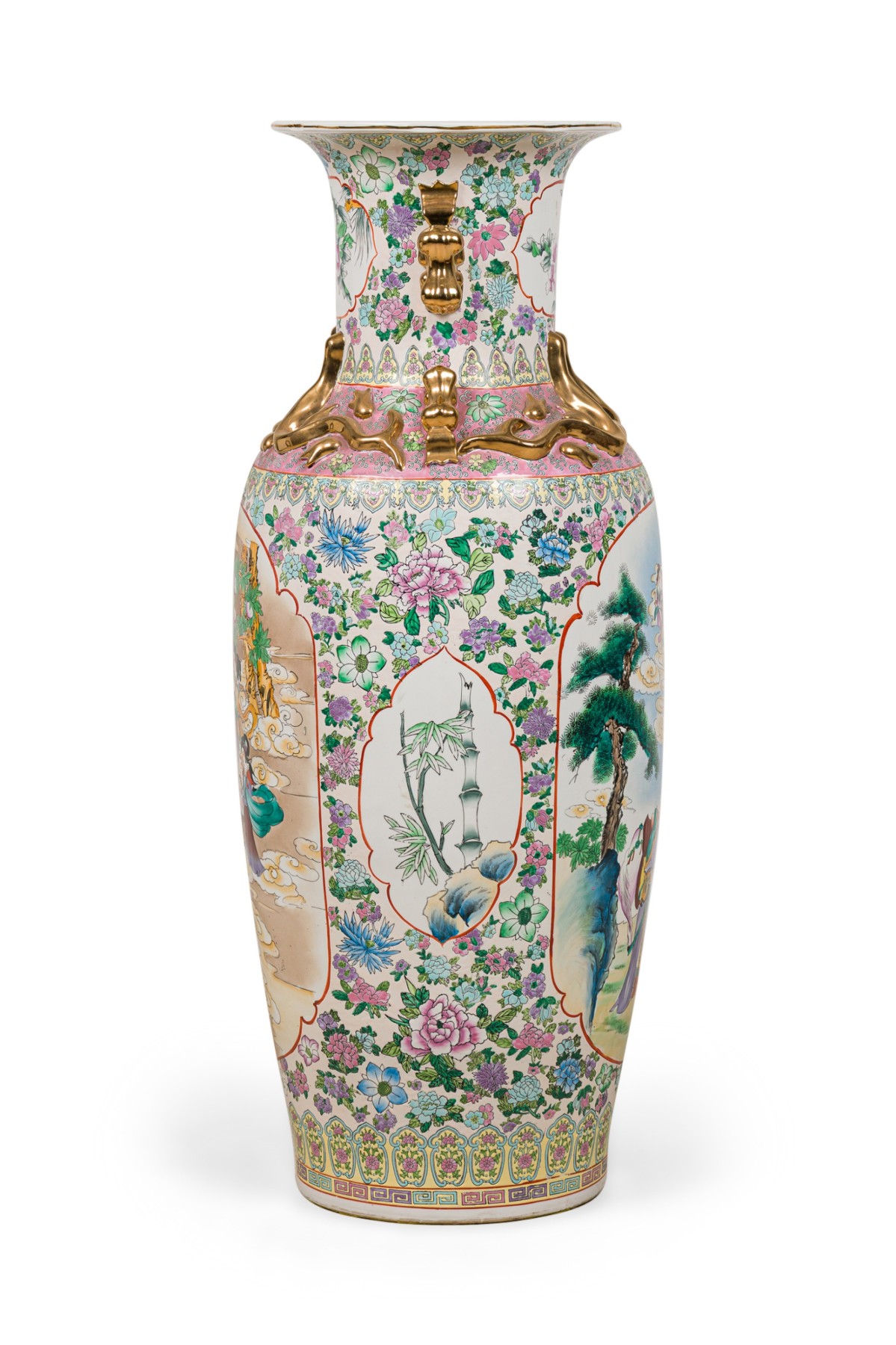 Chinese large floor vase with a central scenic depiction decorated by floral designs with gilded relief design on the neck, a round mouth standing on a round base.