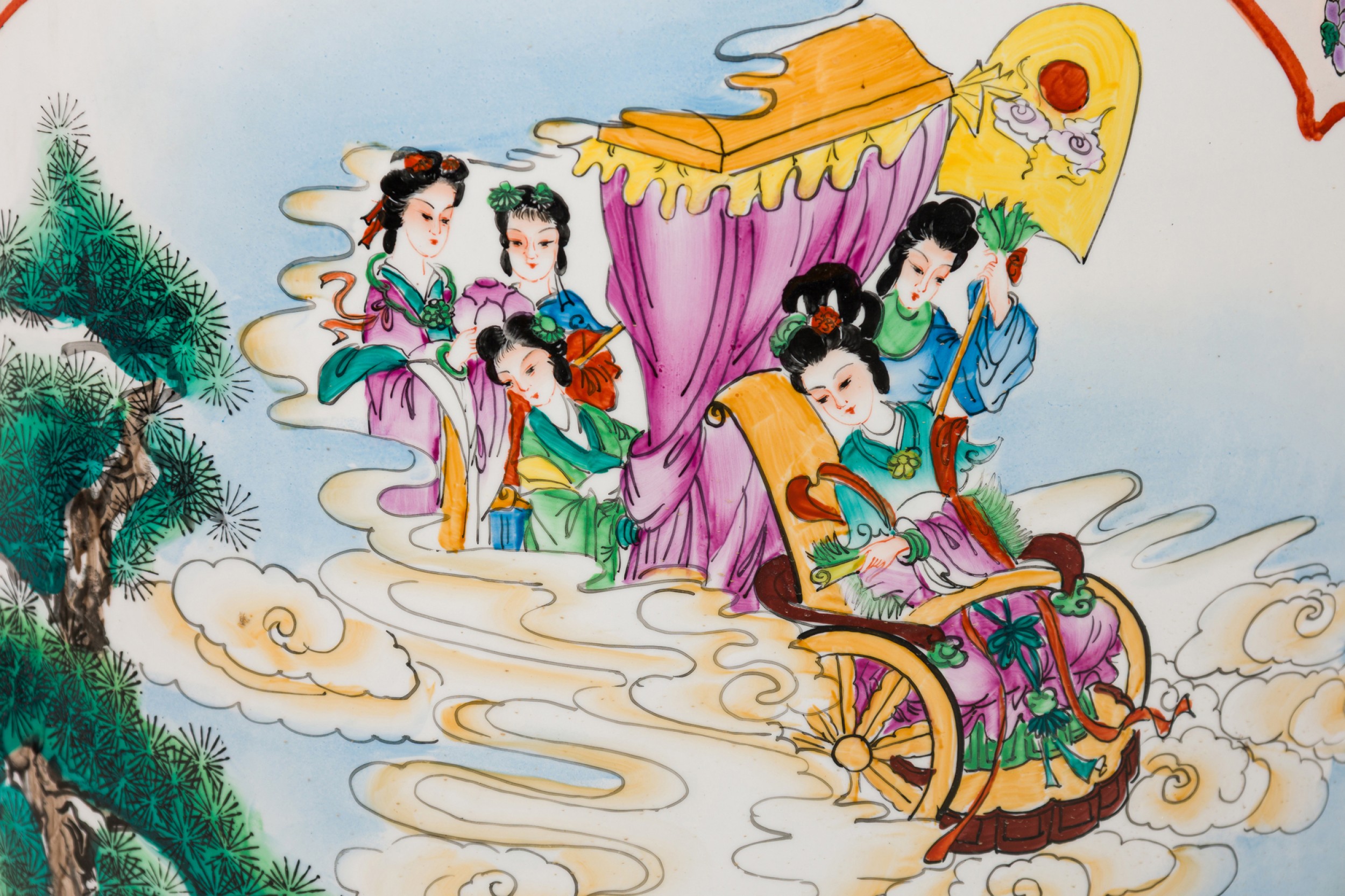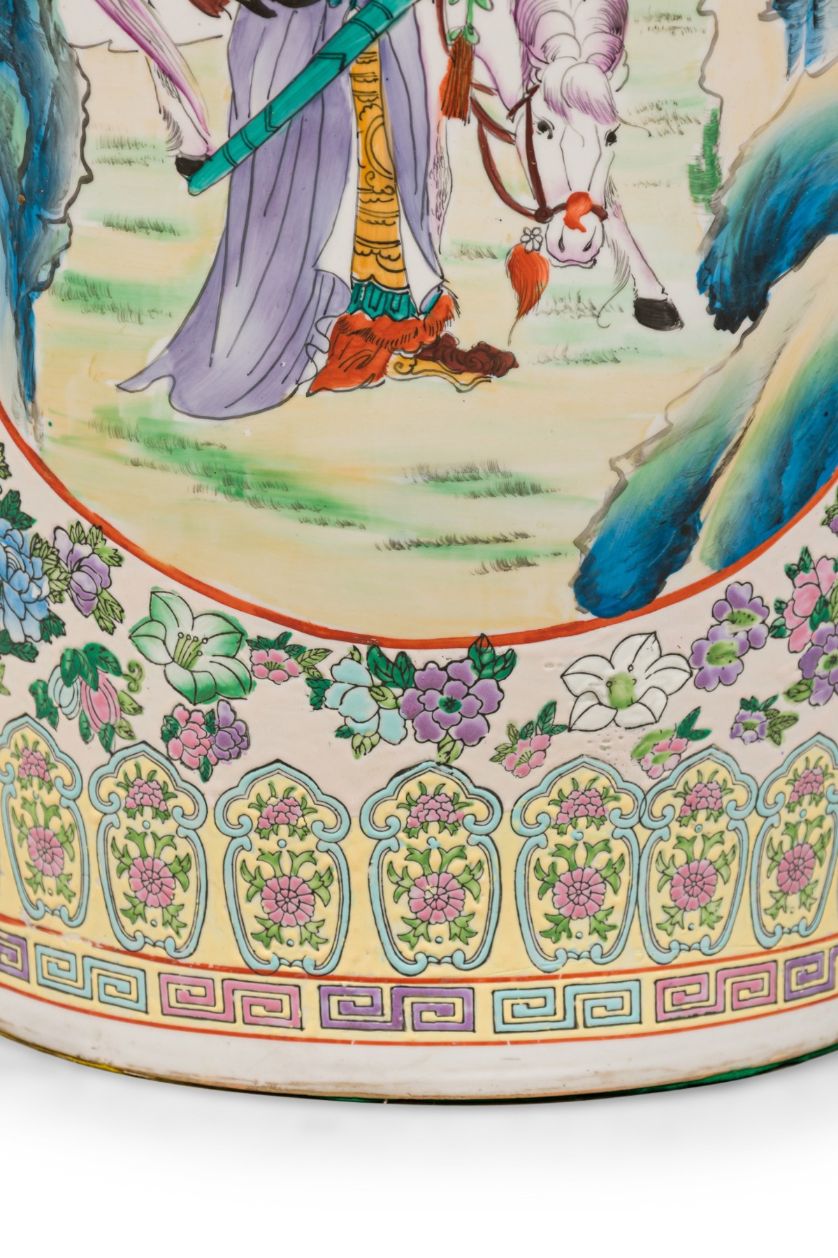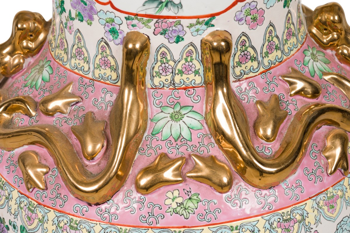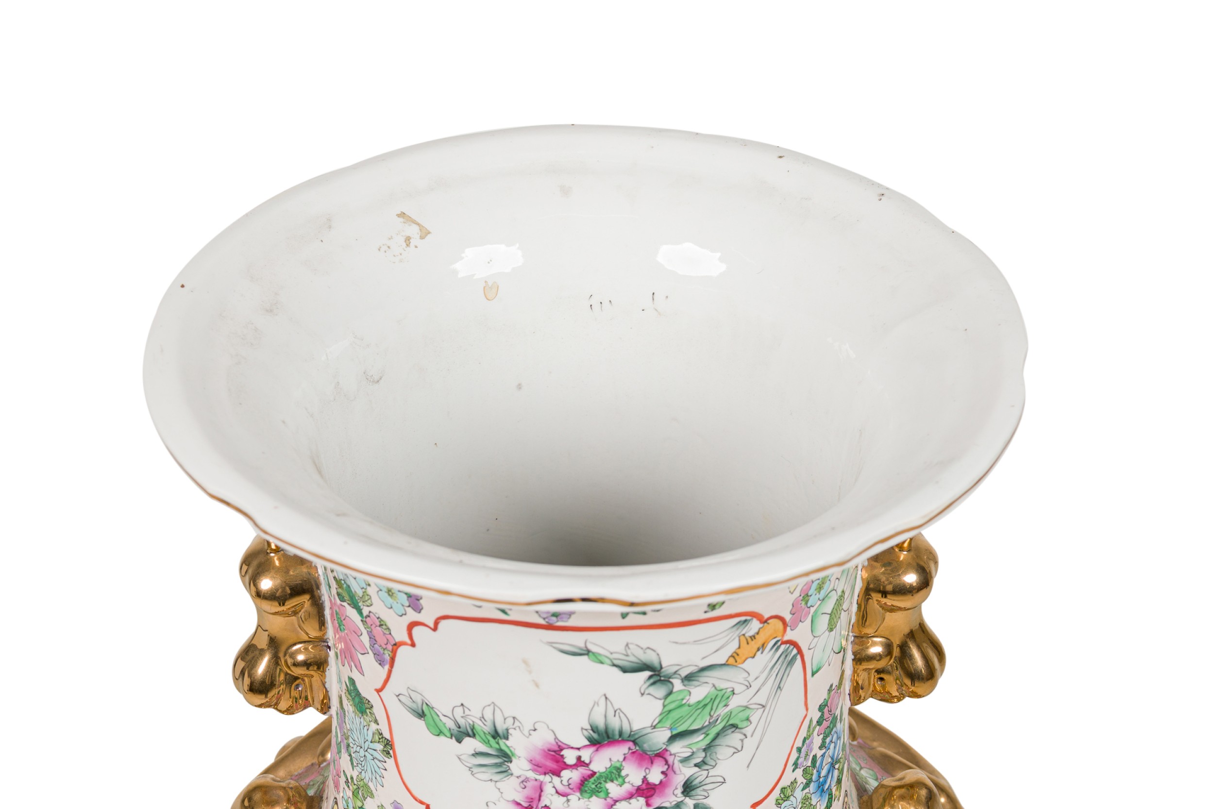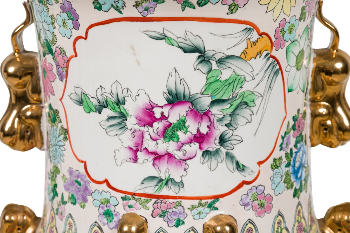 Chinese large floor vase with a central scenic depiction decorated by floral designs with gilded relief design on the neck, a round mouth standing on a round base.