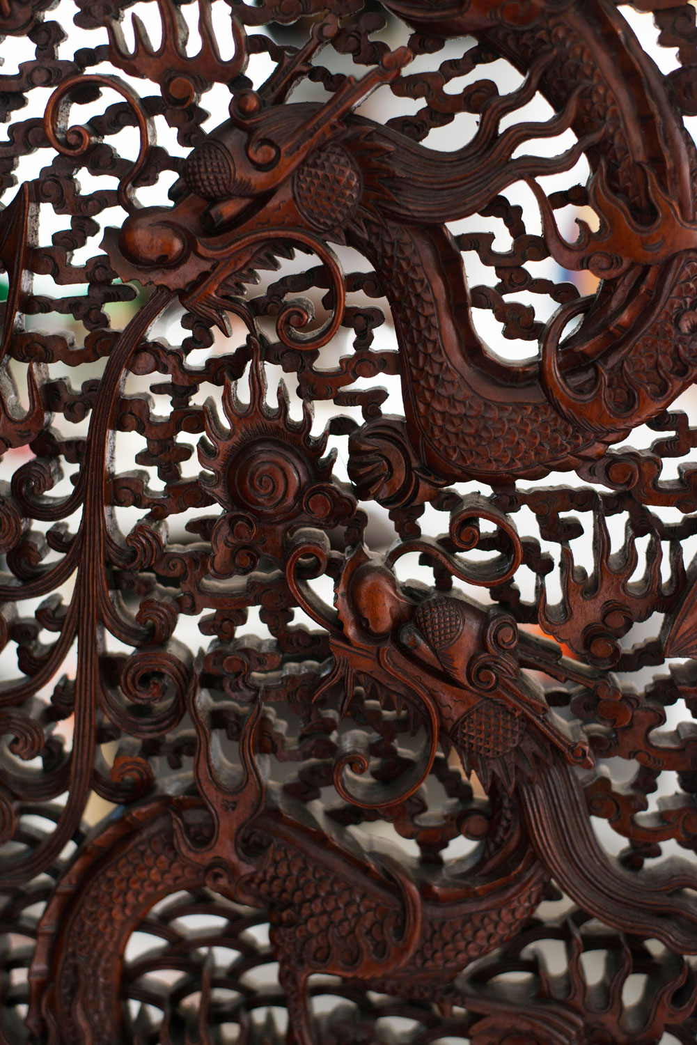 Asian Chinese style (19th Century) carved mahogany filigree 4 fold screen with satinwood inlay.