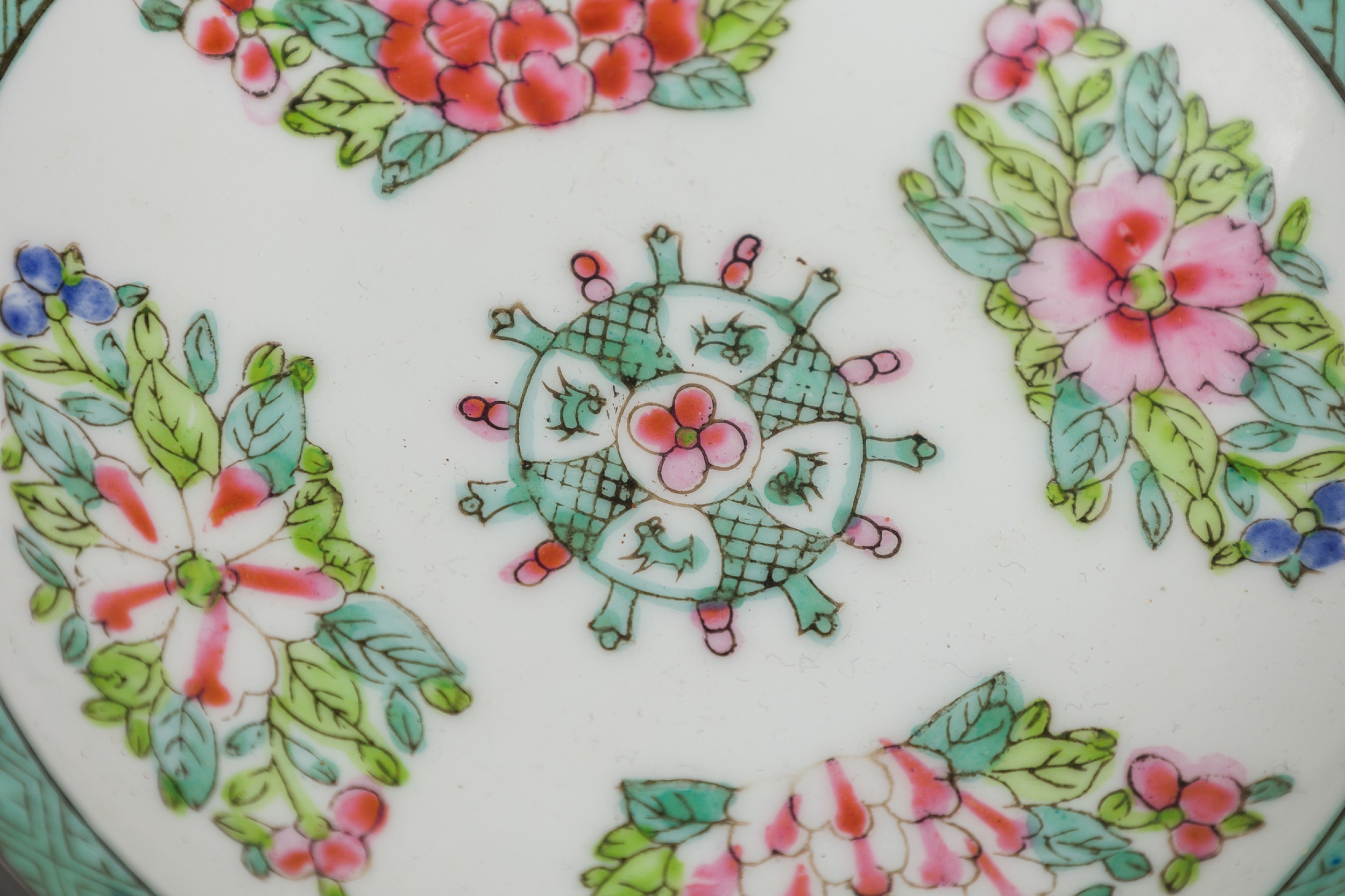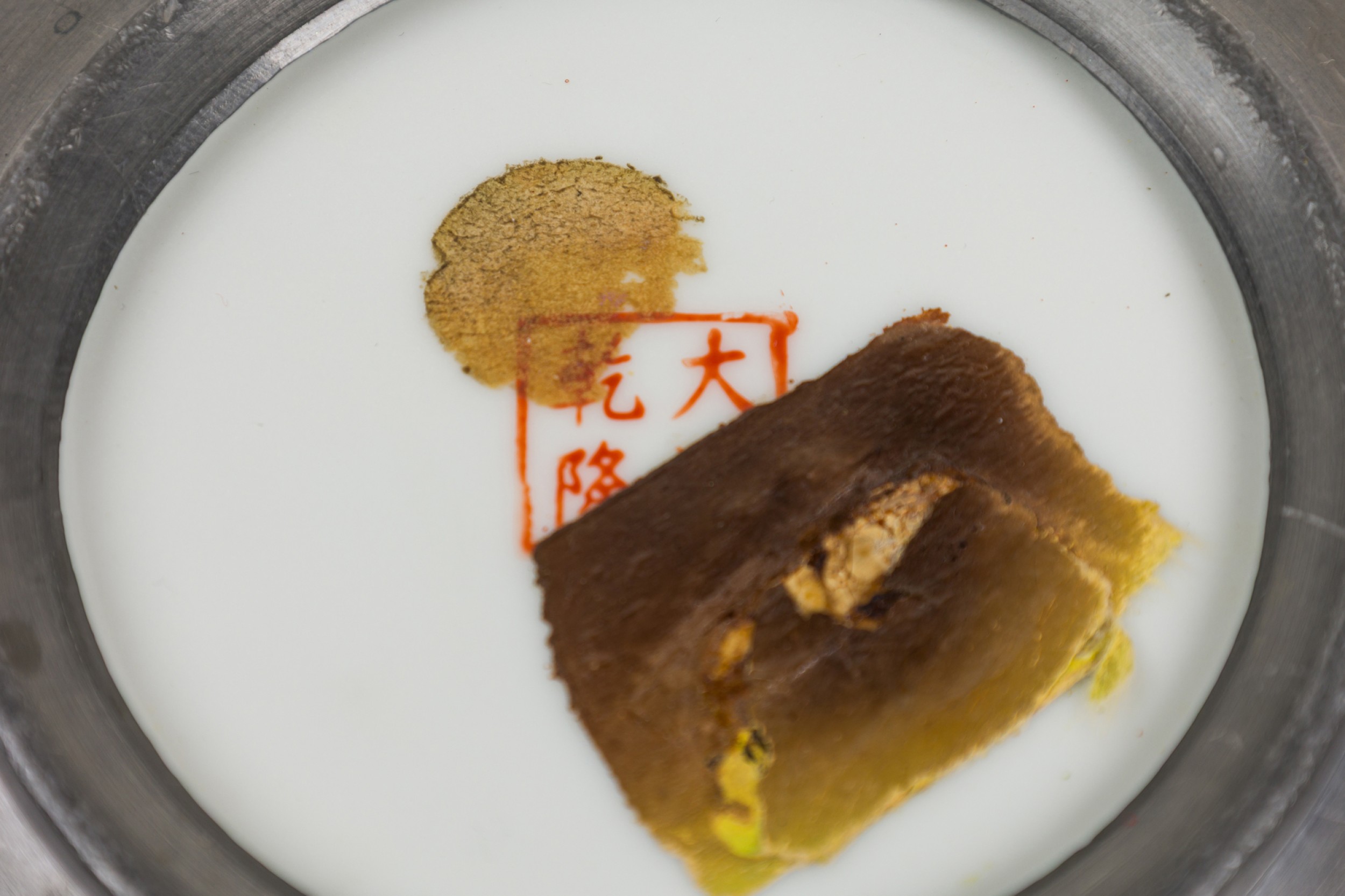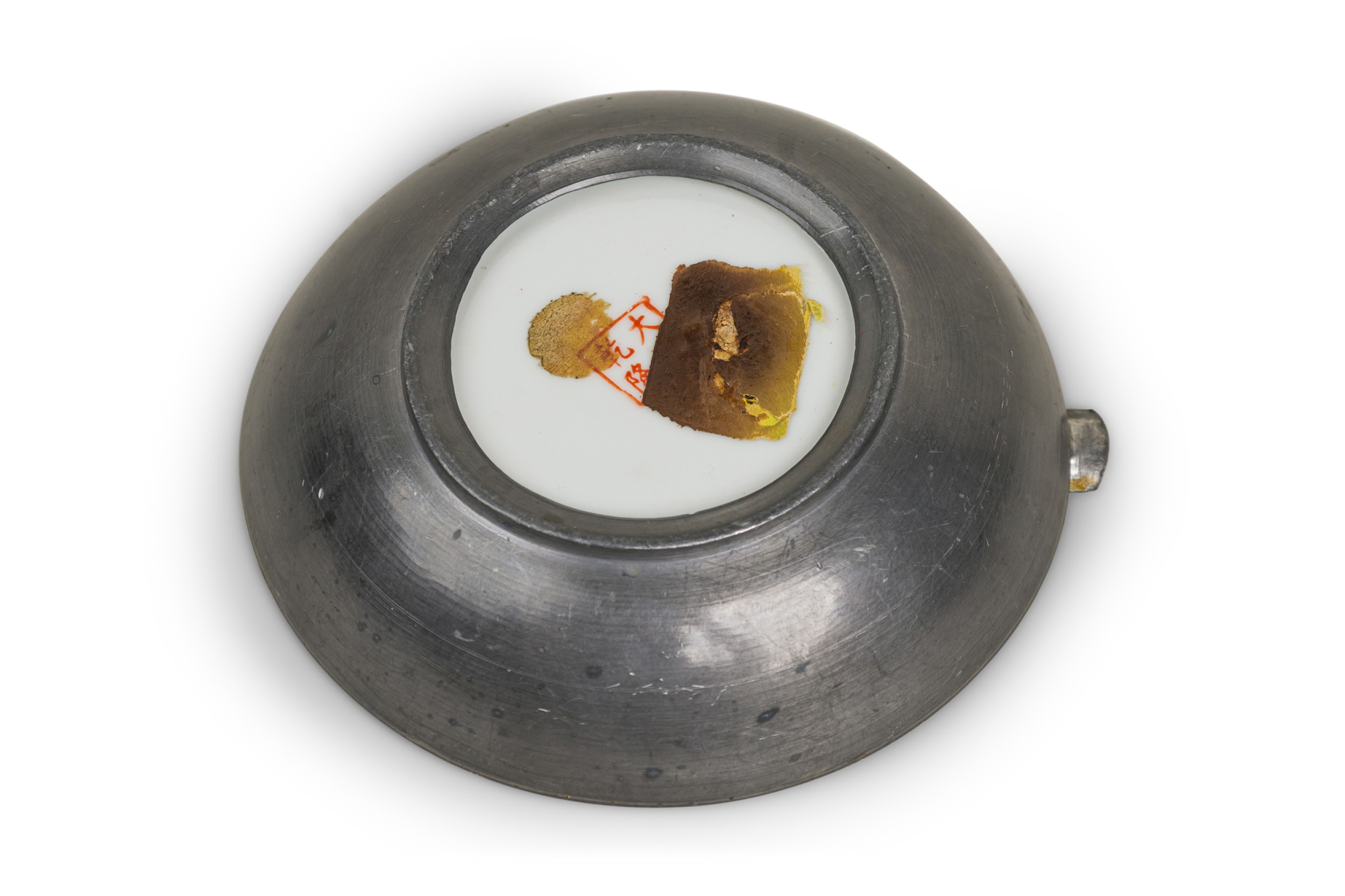 Asian Chinese style Mid-Century blue/green and white porcelain and pewter clad ashtray bearing floral details and geometric border with an elegantly placed cigarette holder