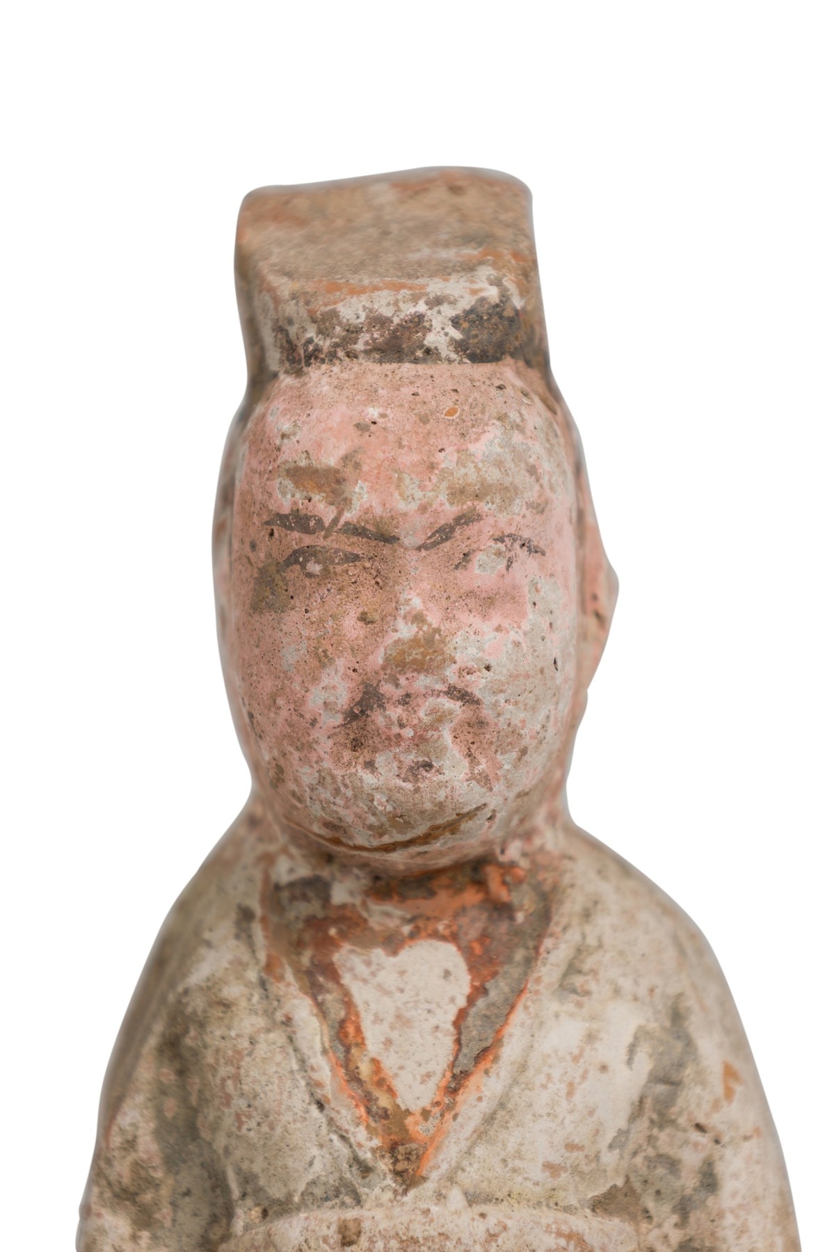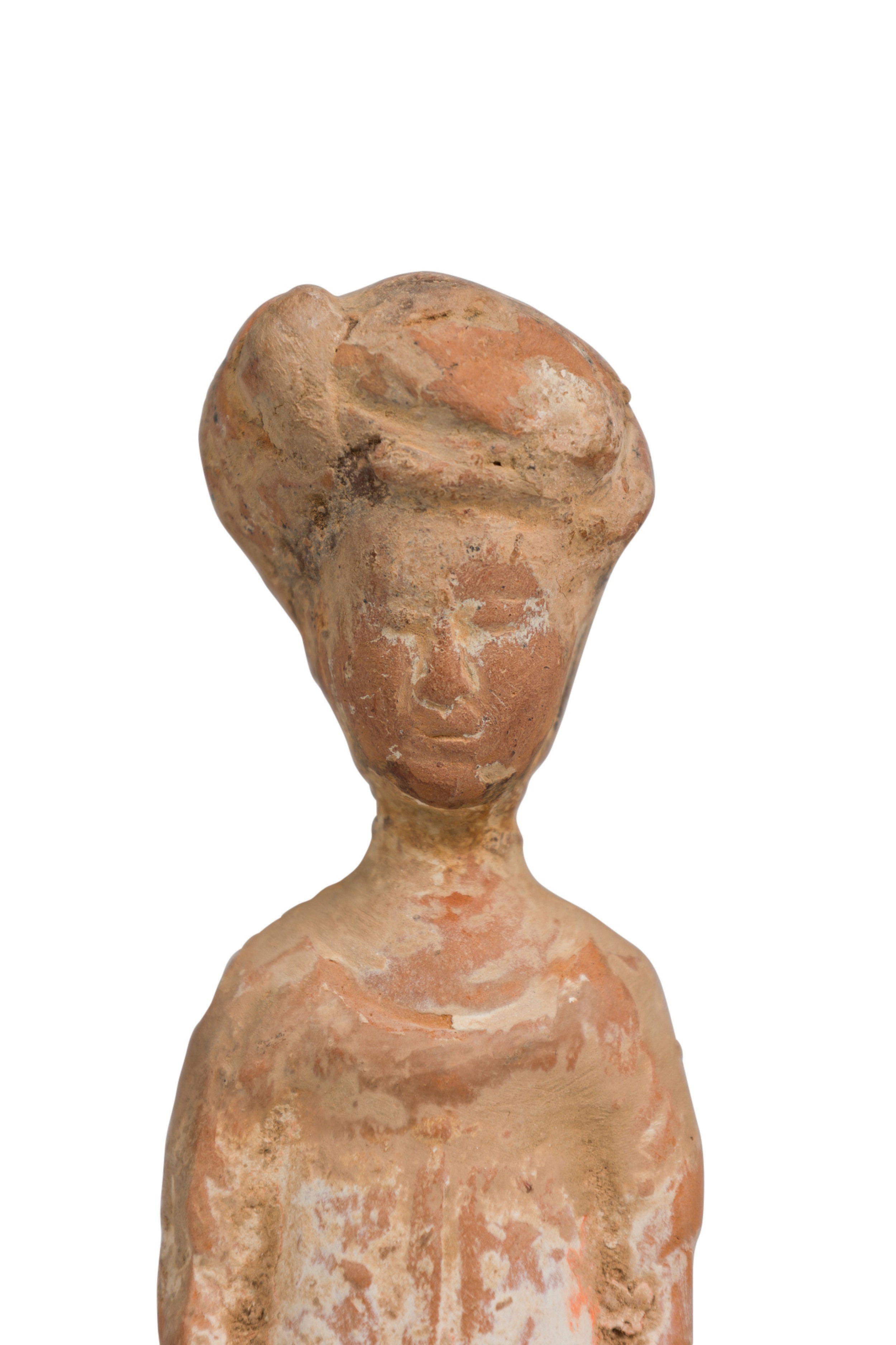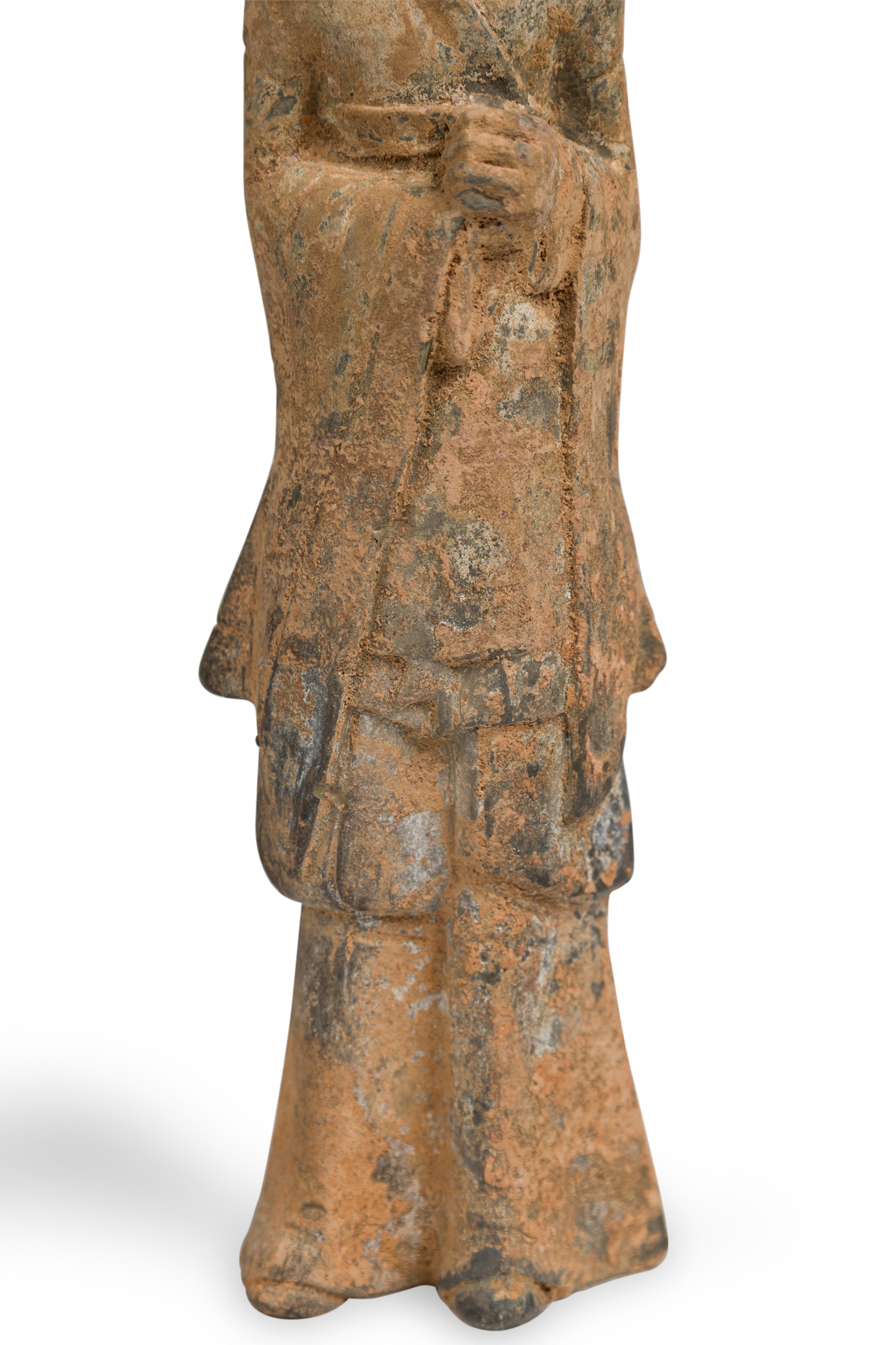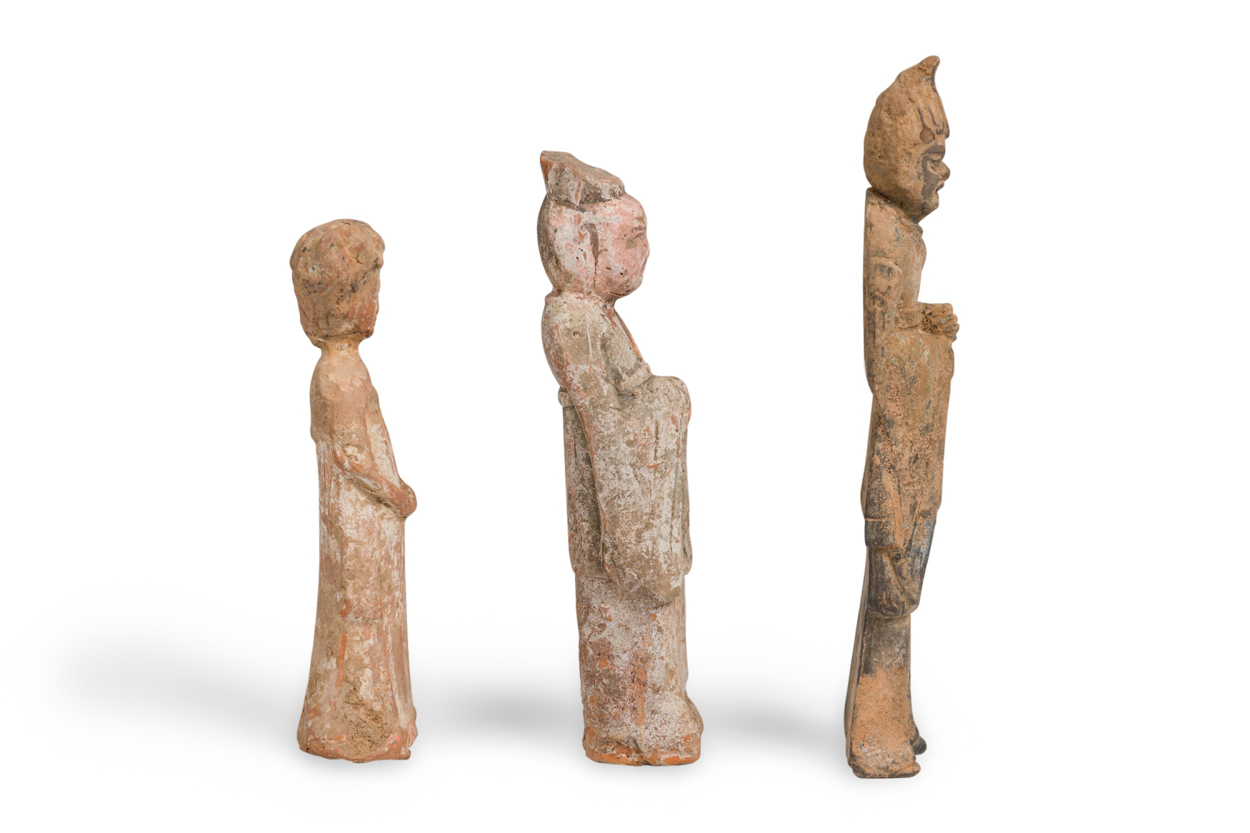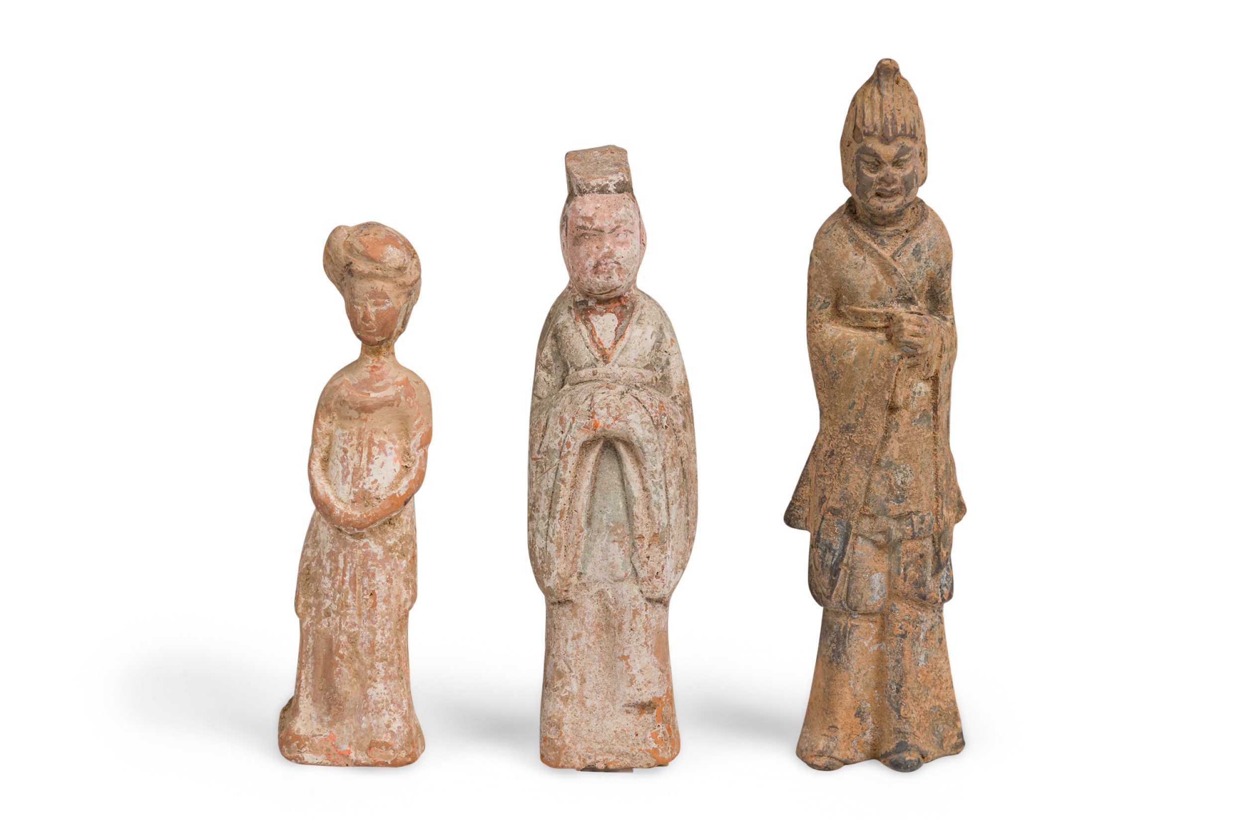SET of 3 Chinese terracotta standing figurines in the style of Tang dynasty tomb figures (in graduated heights: woman, man, warrior) (PRICED AS SET)