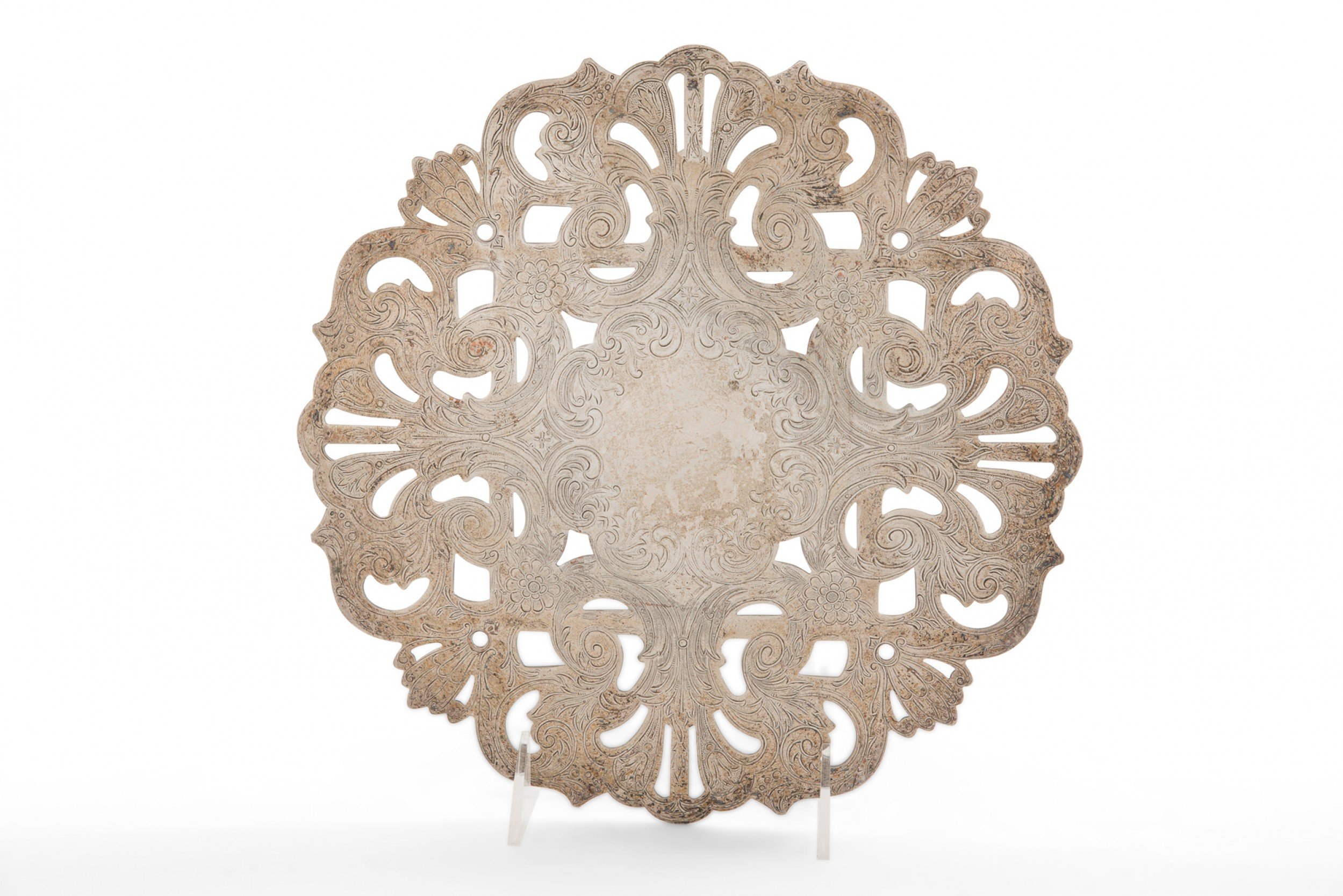 Circular patinated silver plated trivet with cut out pattern and 4 round silver feet