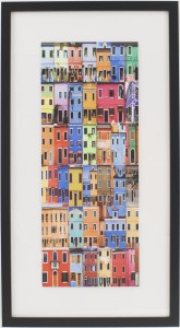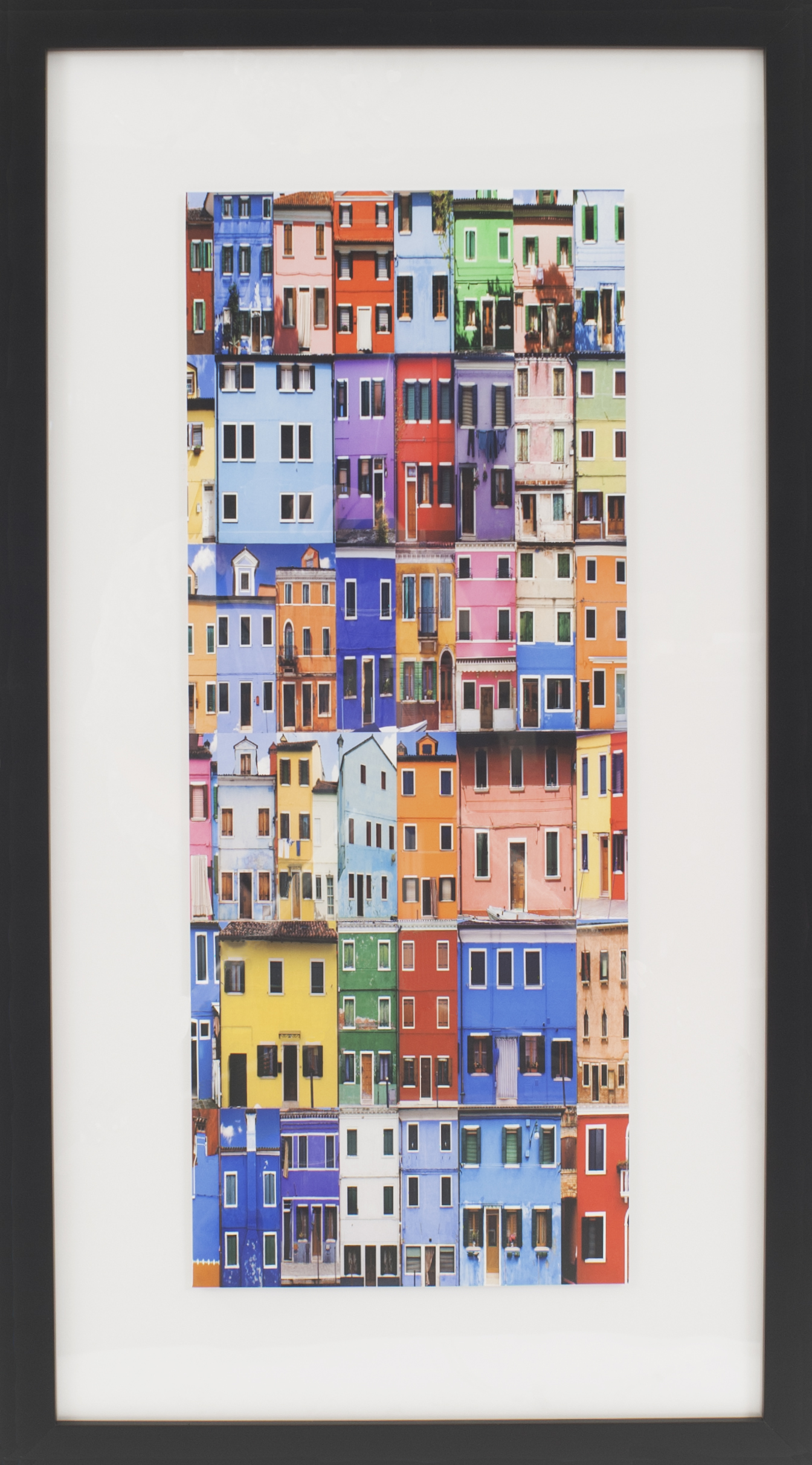 Contemporary photograph of buildings in rainbow colors titled, "City Scene I," in white matting and a rectangular black frame (Companion piece: 061713)
