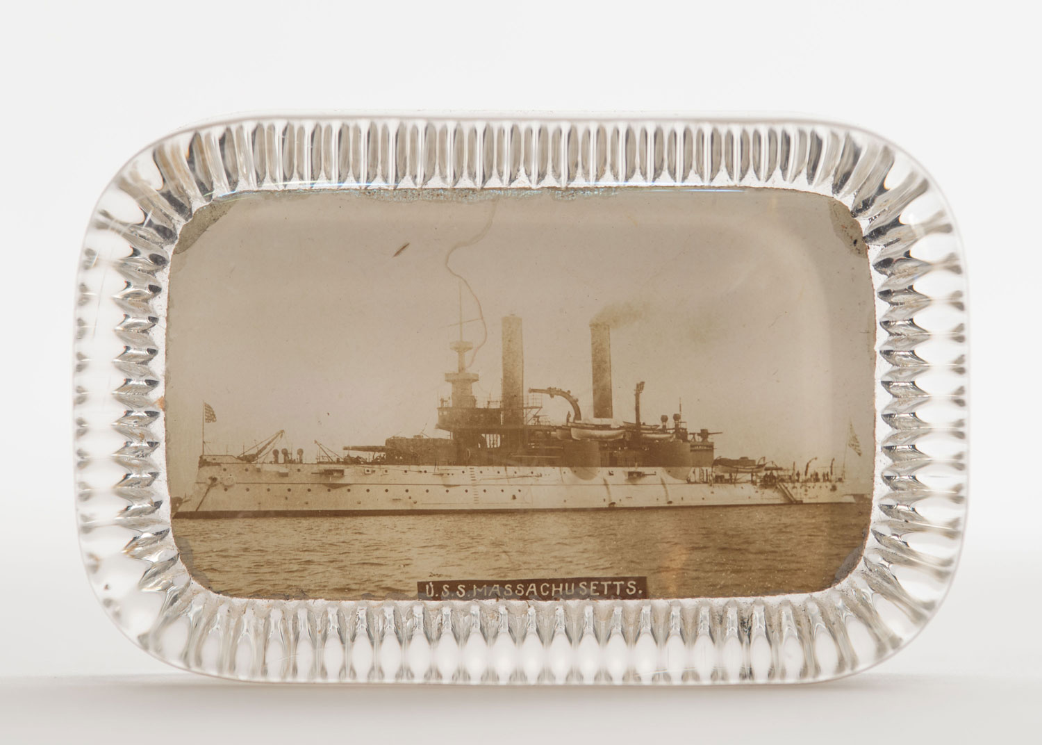 Vintage rectangular clear glass paperweight with rounded corners and a photograph of battleship USS Massachusetts