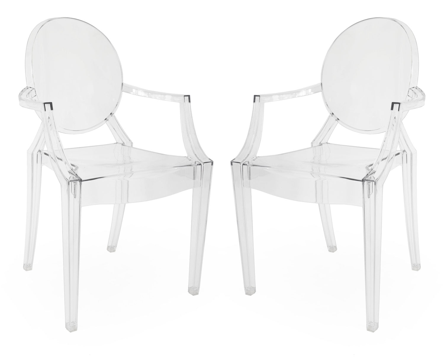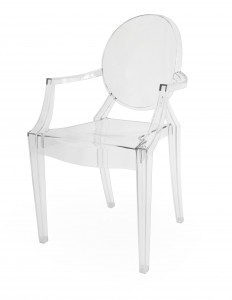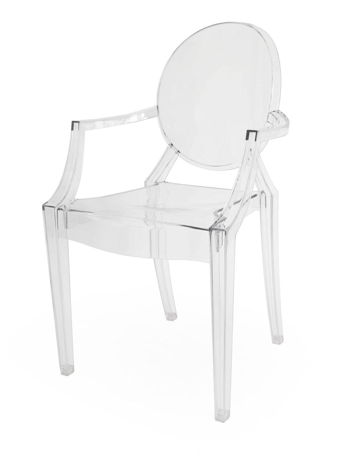 6 Translucent CLEAR "phantom" arm chairs consisting of injected molded translucent polycarbonate with a circular backrest. (Also available in blue: JPB014, or without arms: JPB014B) (PRICED EACH)
