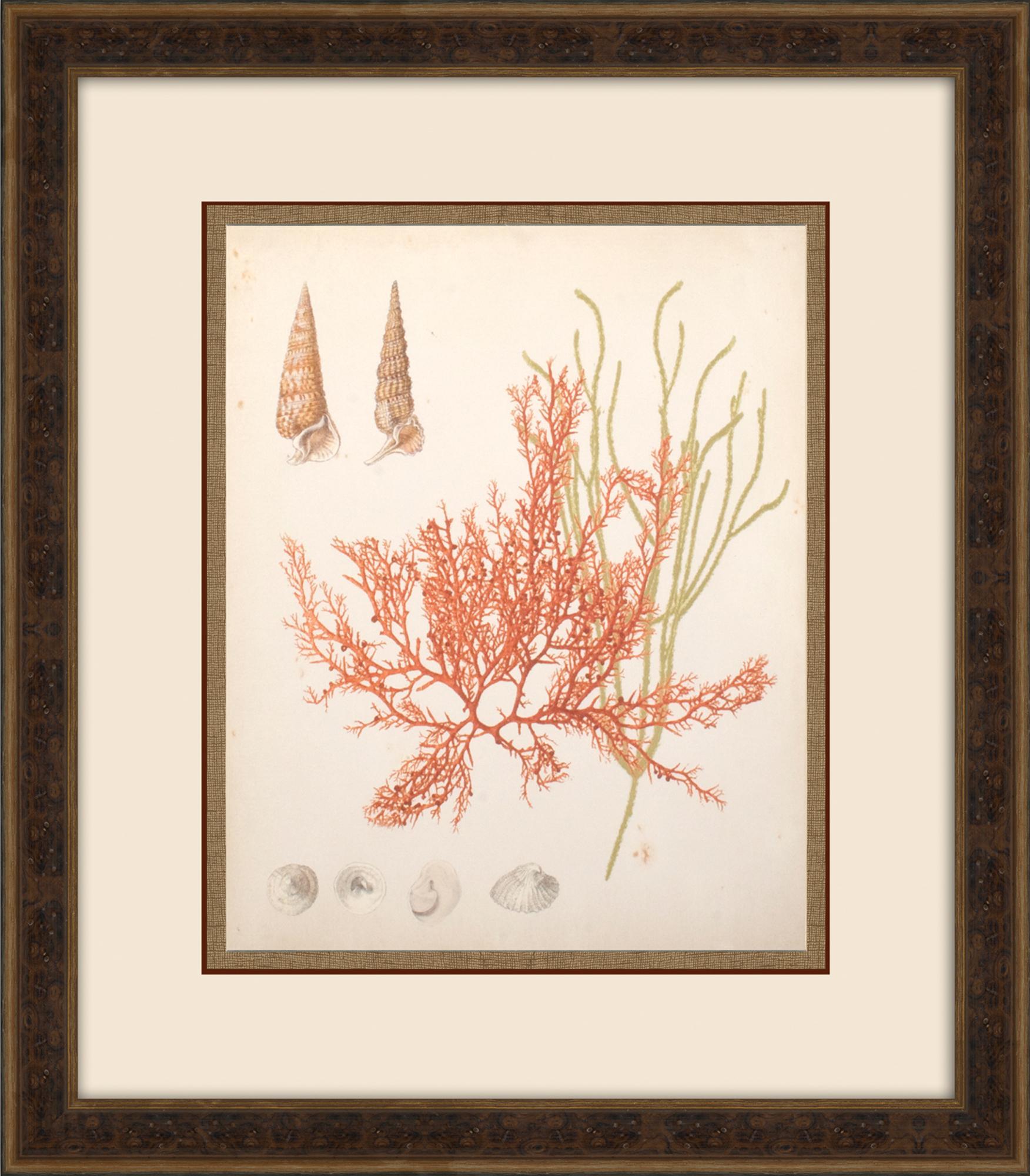 "Coastal Relic III", Scientific illustration of corals and seashells, Art print triple matted and framed in a faux wood resin frame (See also: 060756A, 060756, 060758)