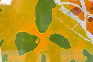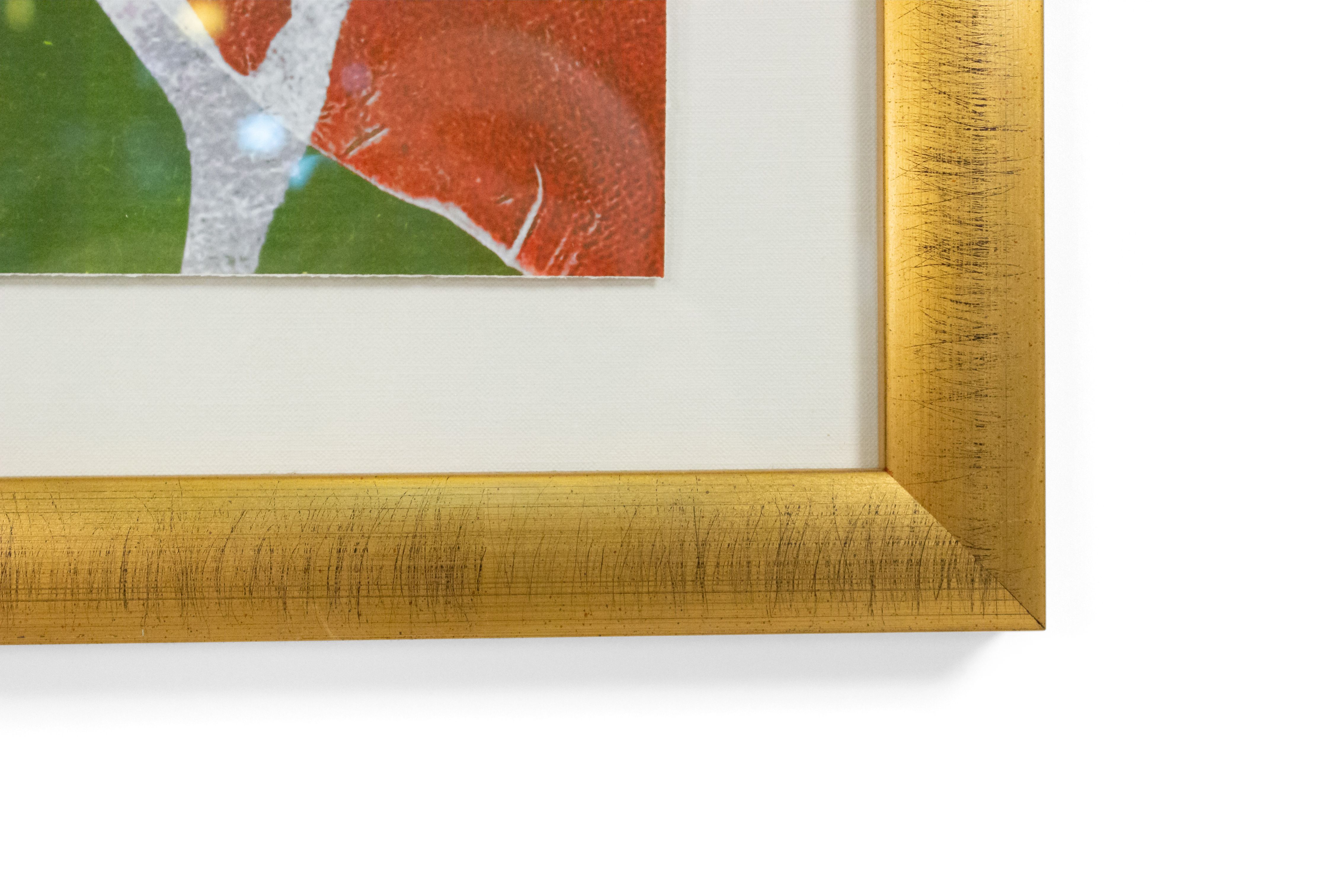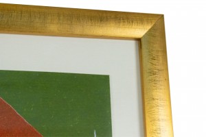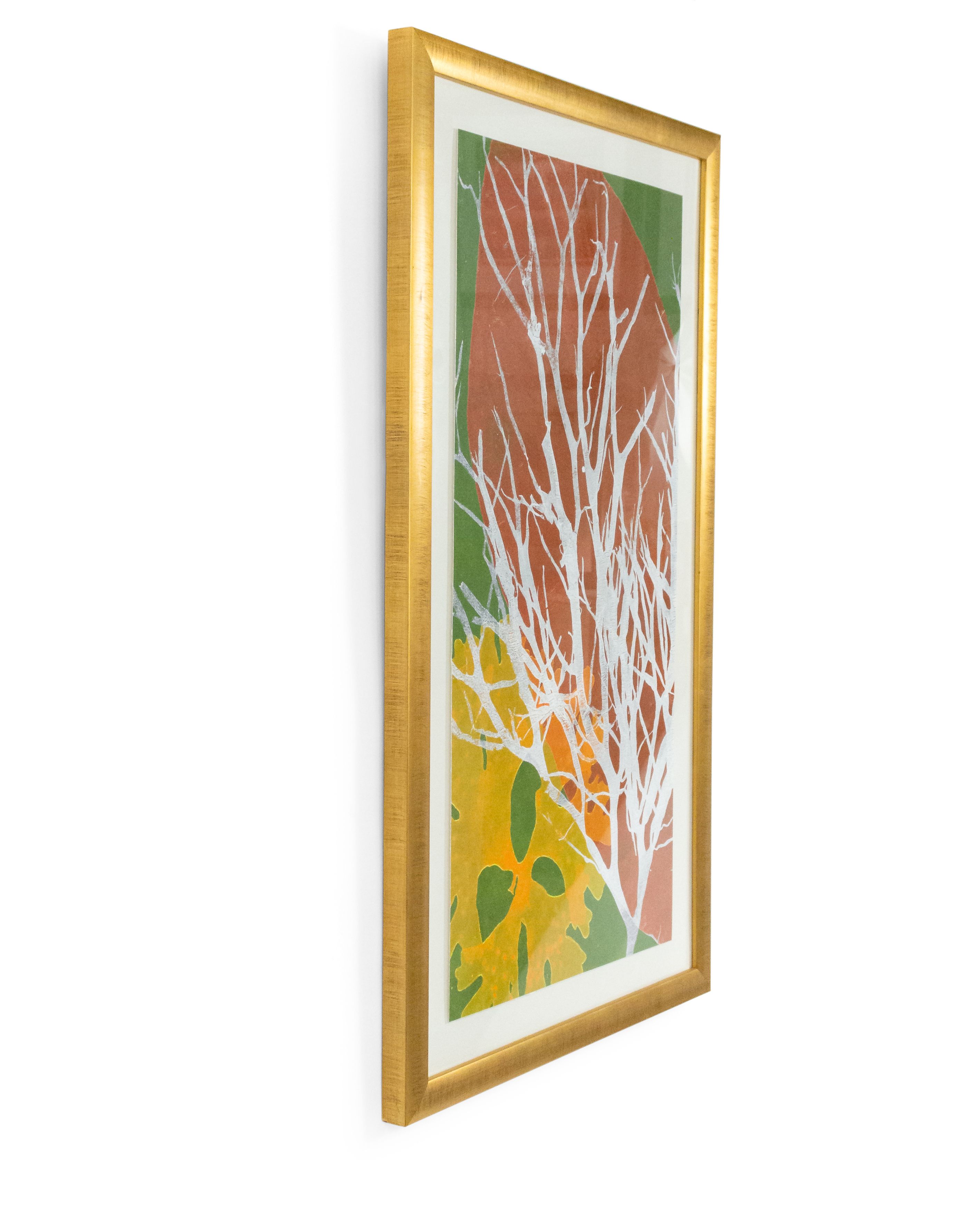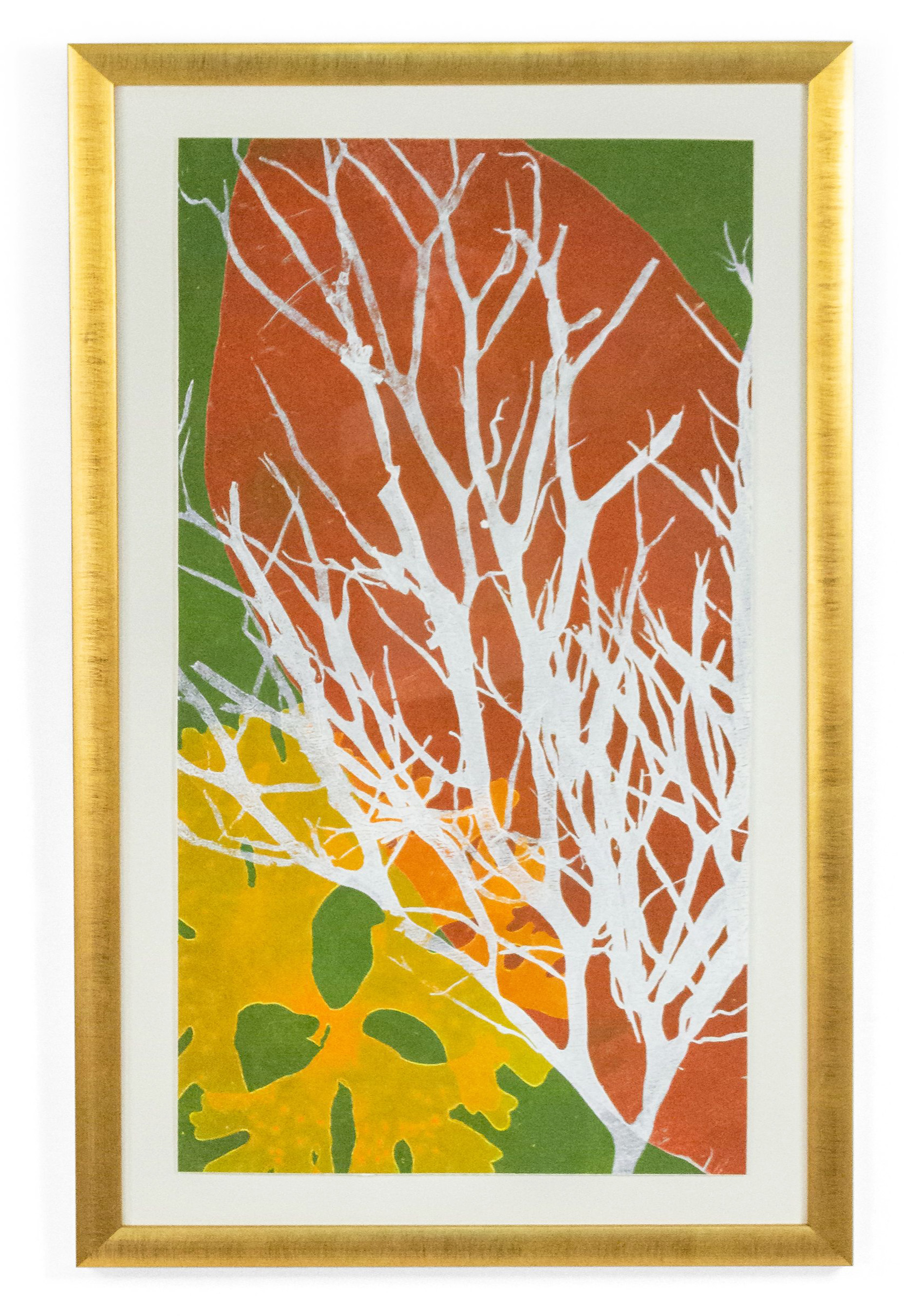 Abstract art print of a white piece of coral on a green, red, and orange background titled "Colorful Reef 1" in a beige mat with a tan frame (companion piece: 061039)