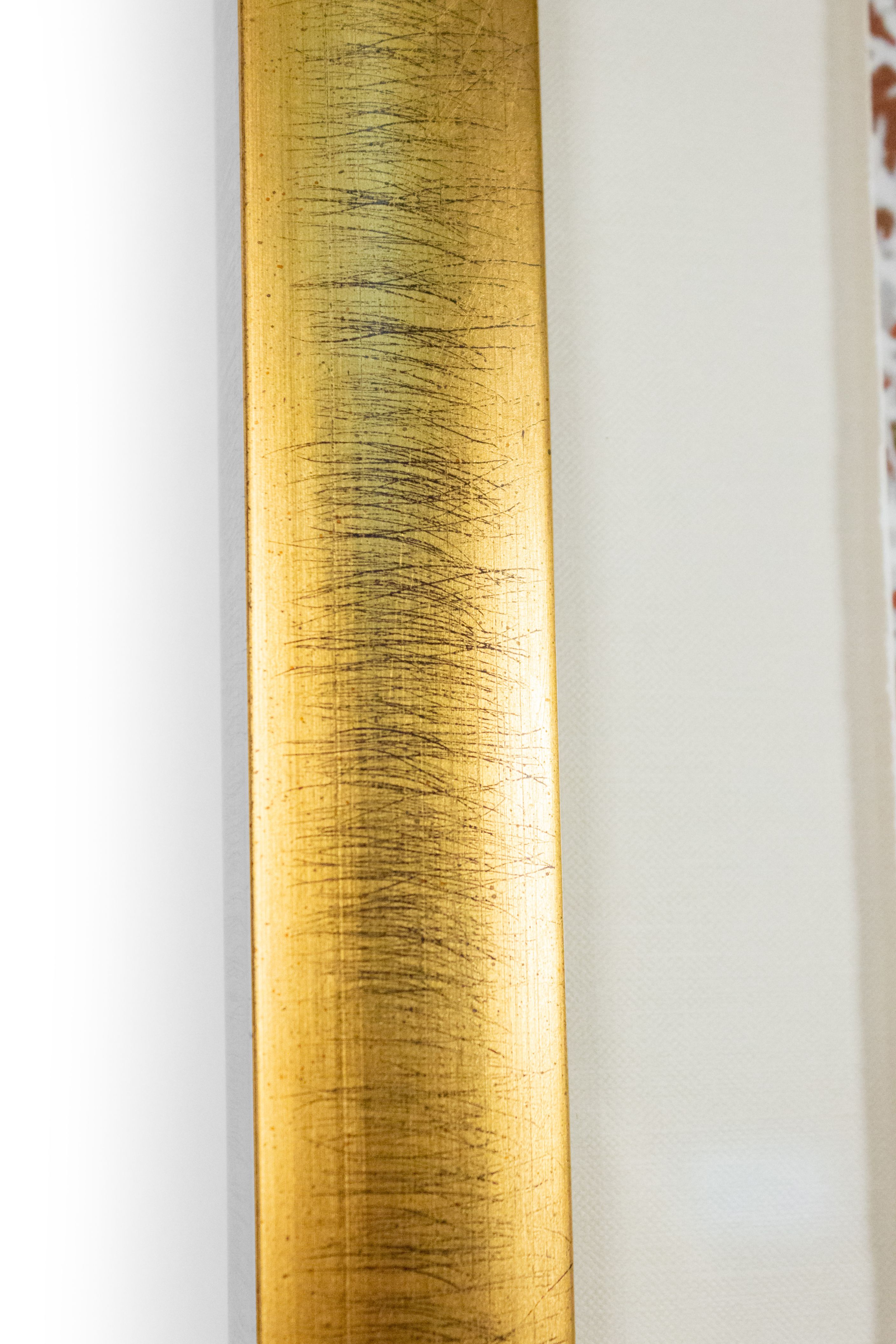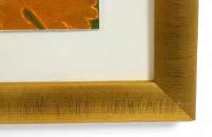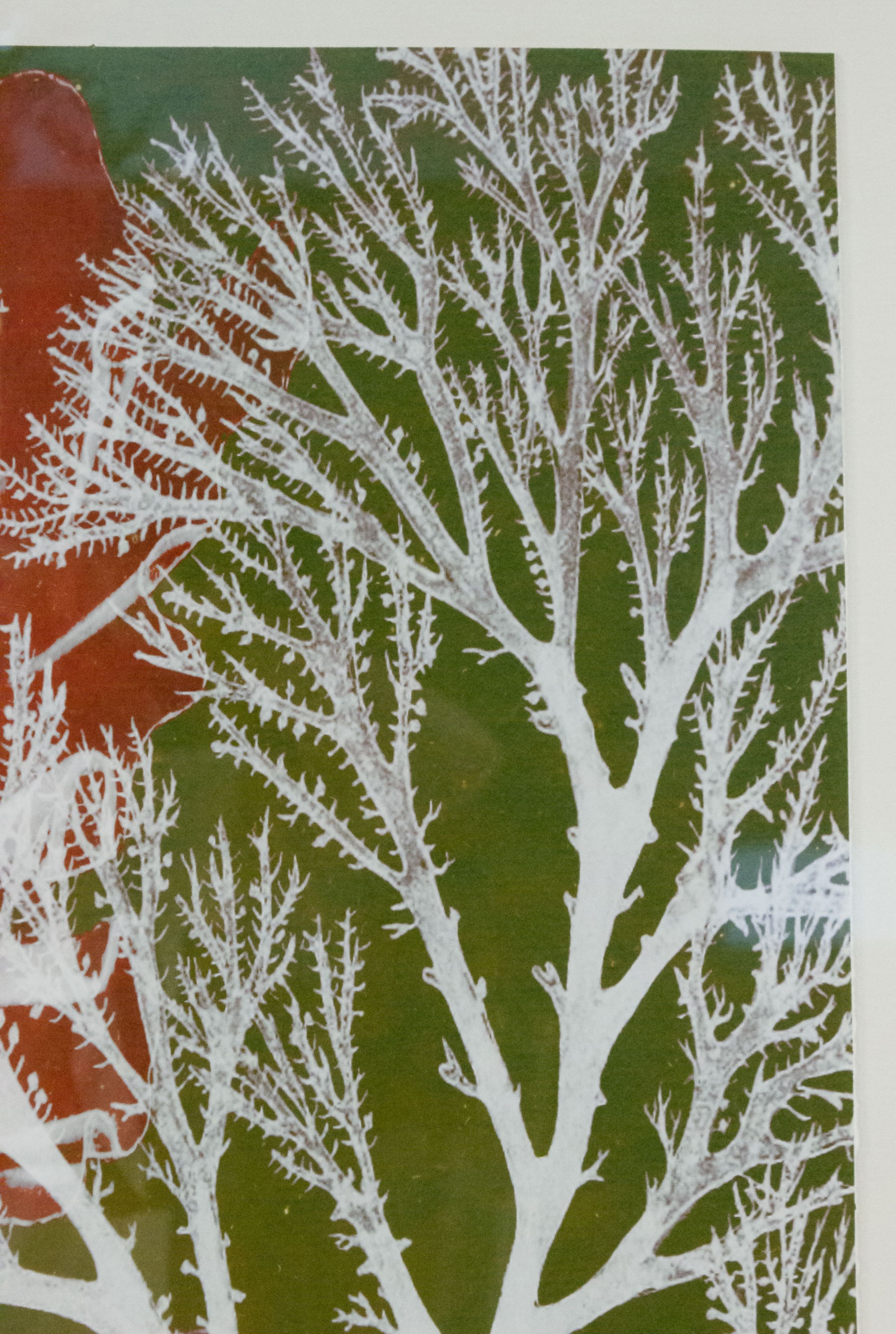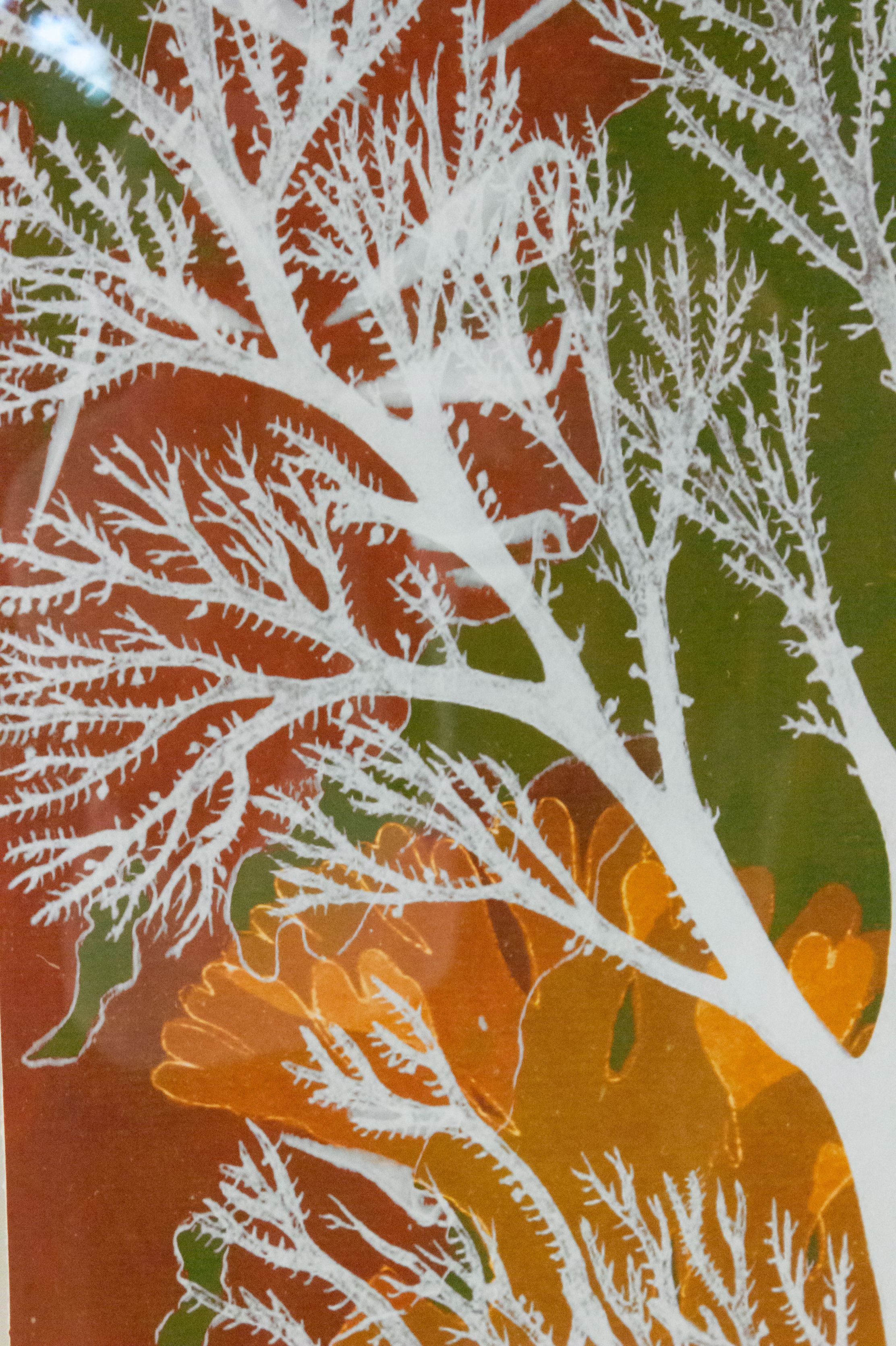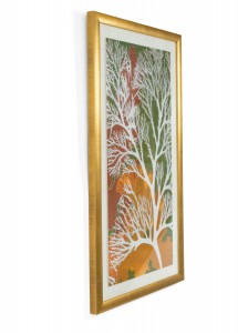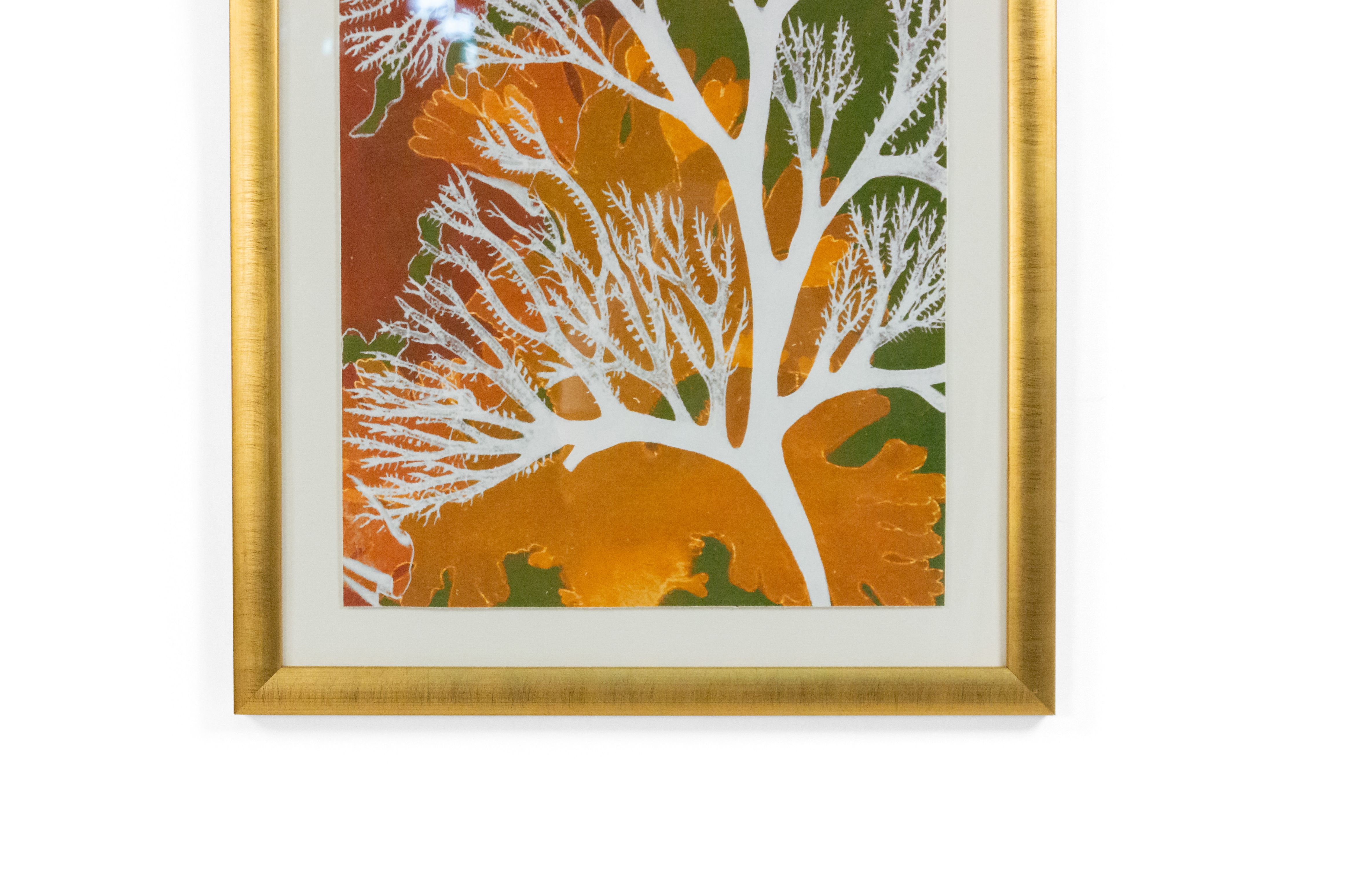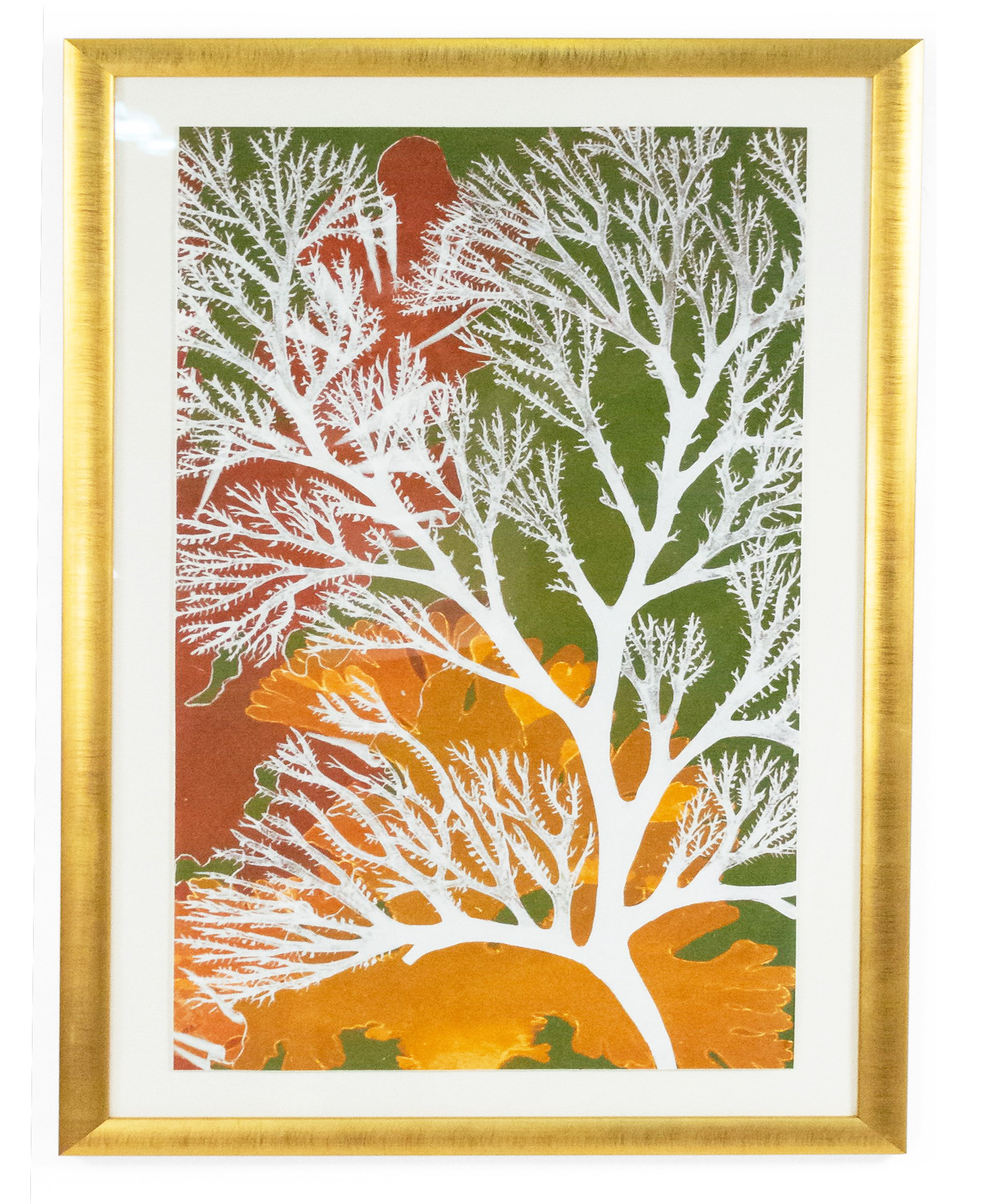 Abstract art print of a white piece of coral on a green, red, and orange background titled "Colorful Reef 2" in a beige mat with a tan frame (companion piece: 061040)