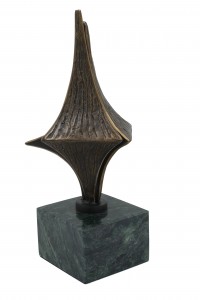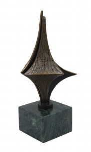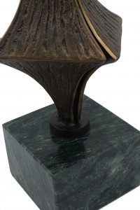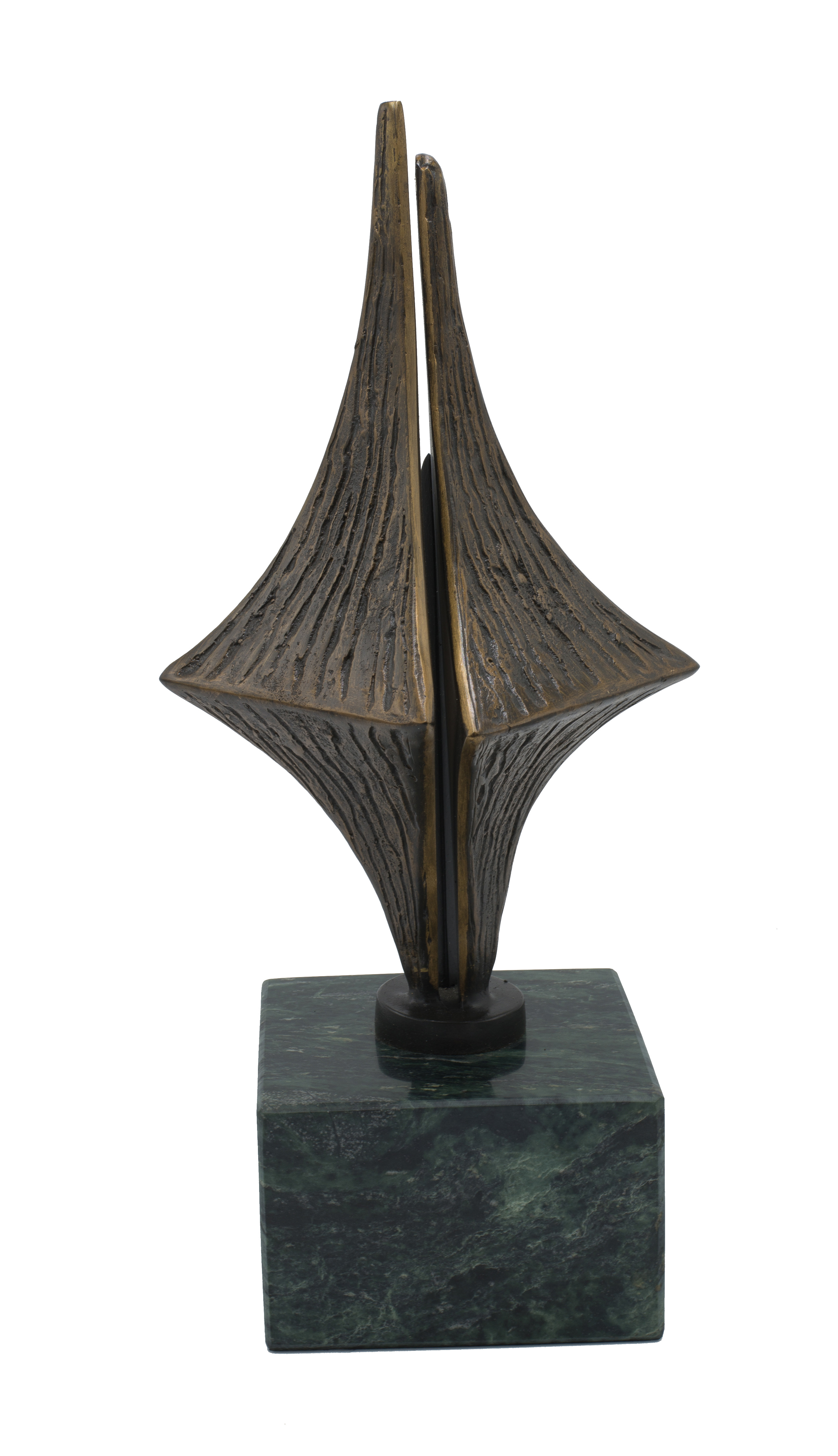 Contemporary abstract metal sculpture of interlocking diamond shapes on a green marble cube base