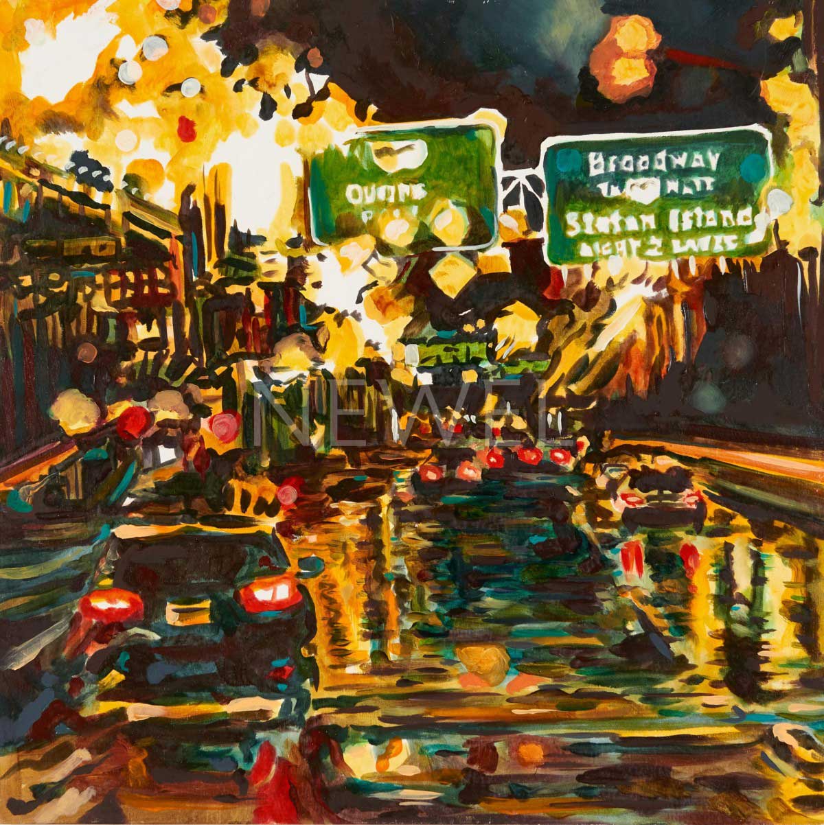 Contemporary abstract painting of a street scene in the rain titled, "47th St." (Companion pieces: AAP166, AAP167)