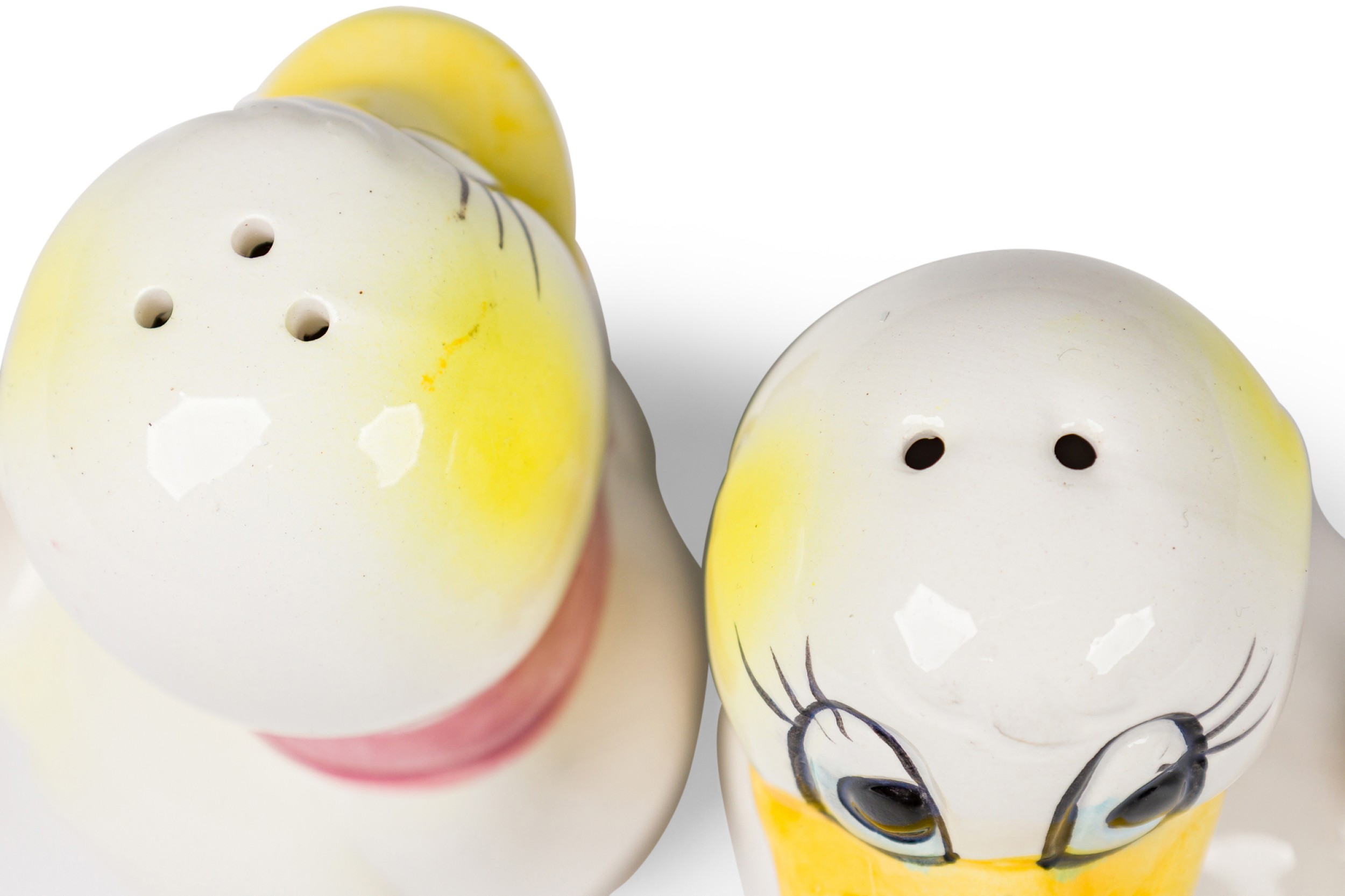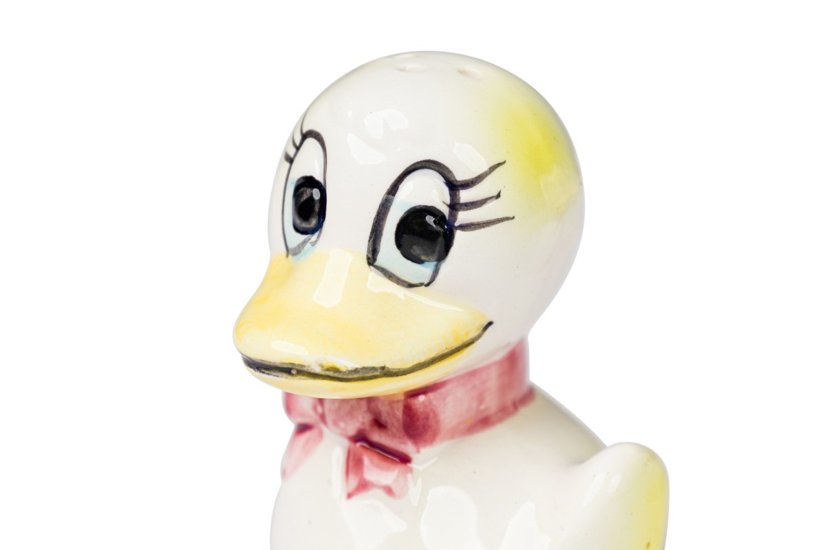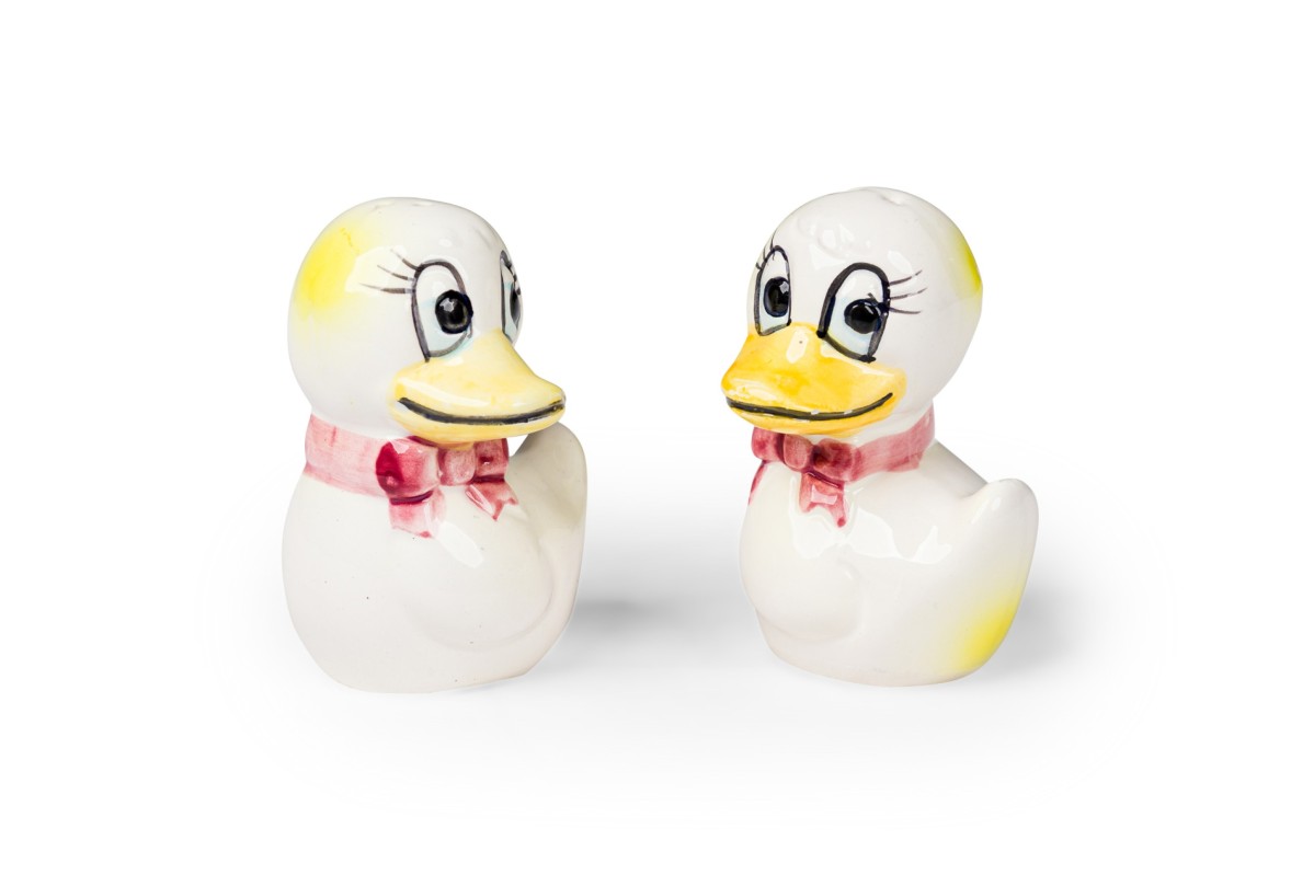 American Contemporary bow tied duck figurine salt & pepper shakers on a circular base
