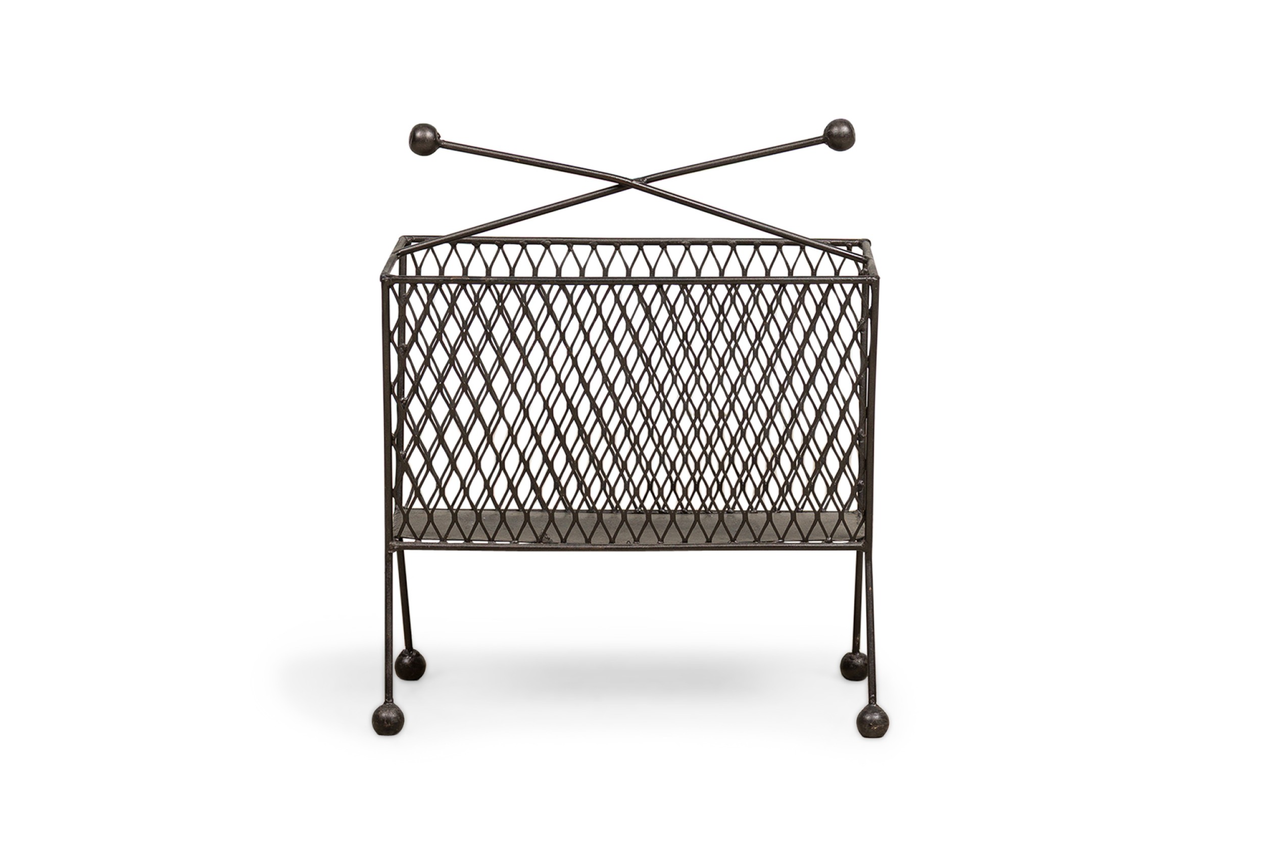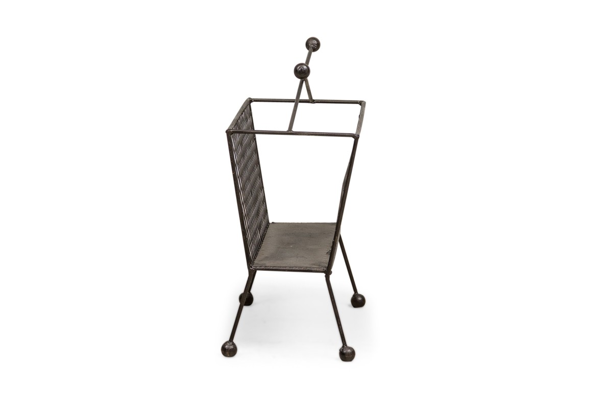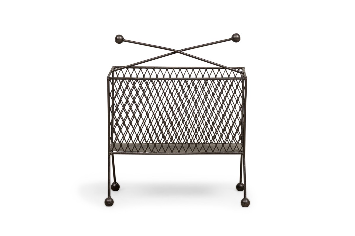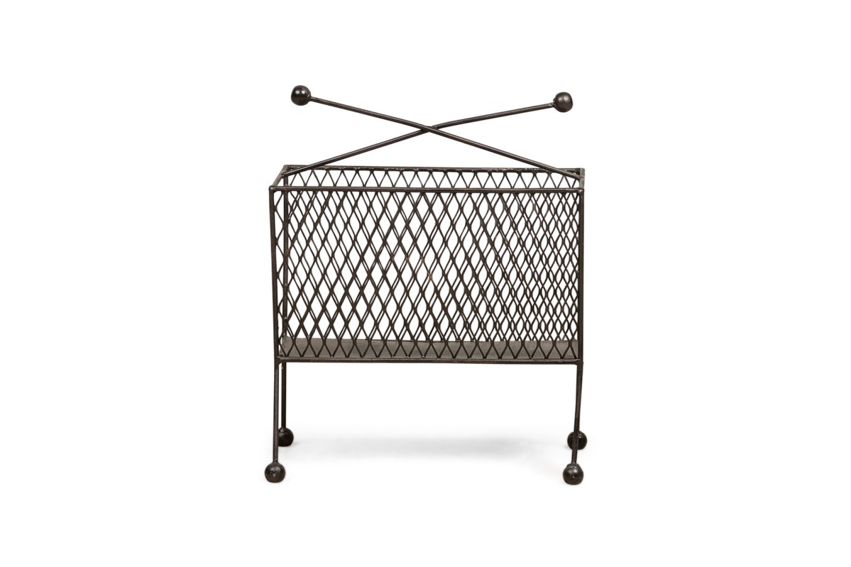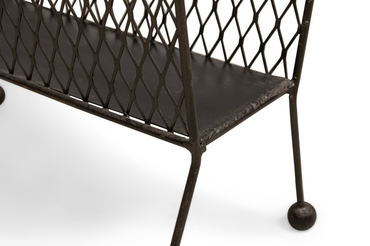 Contemporary American magazine rack bearing a netted body ending on four metal legs with round feet