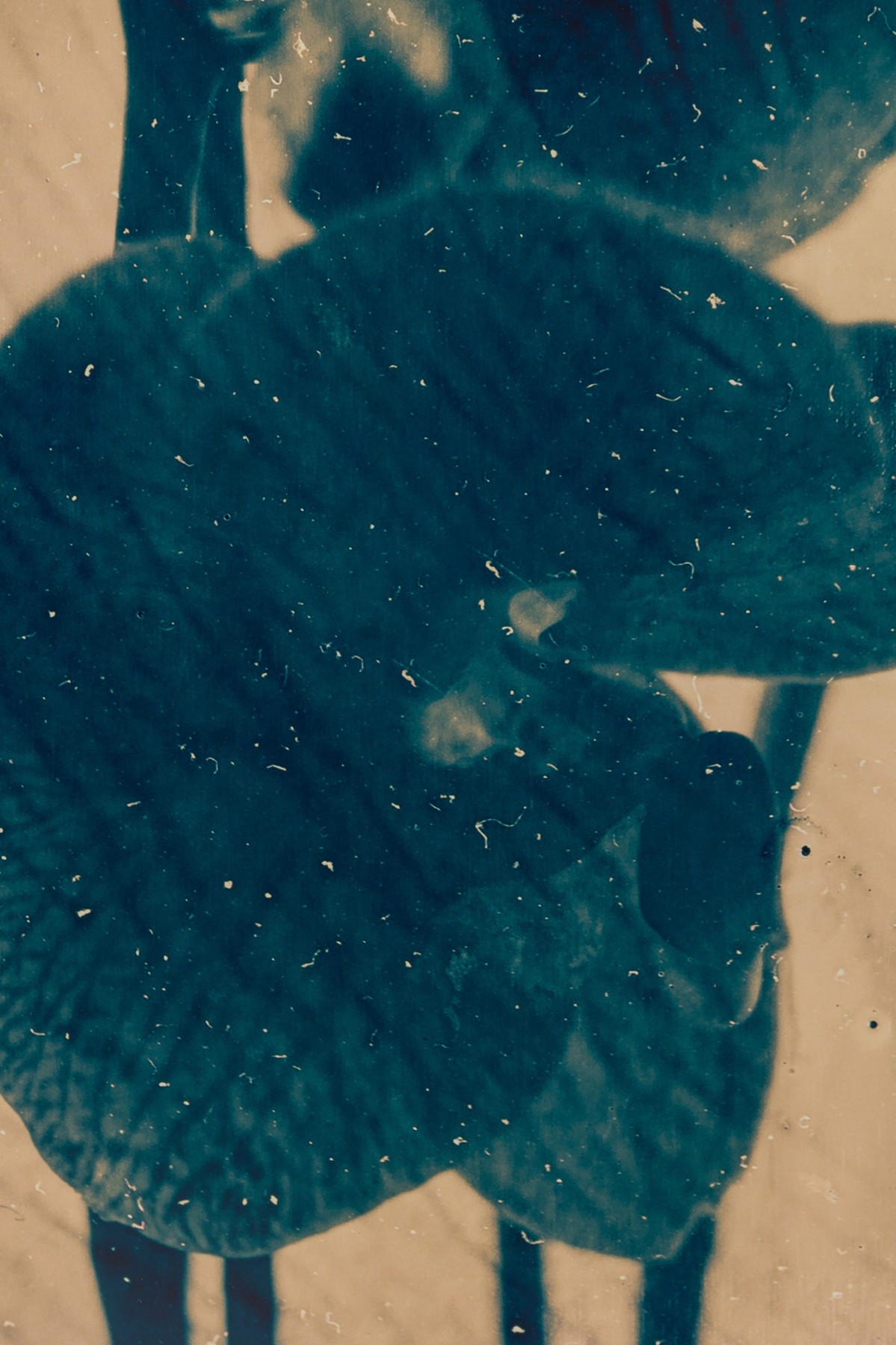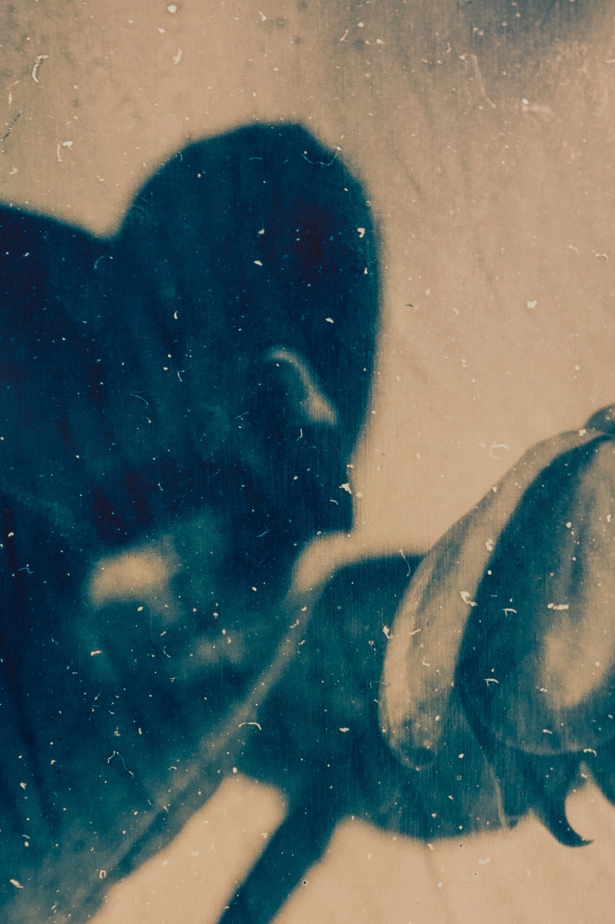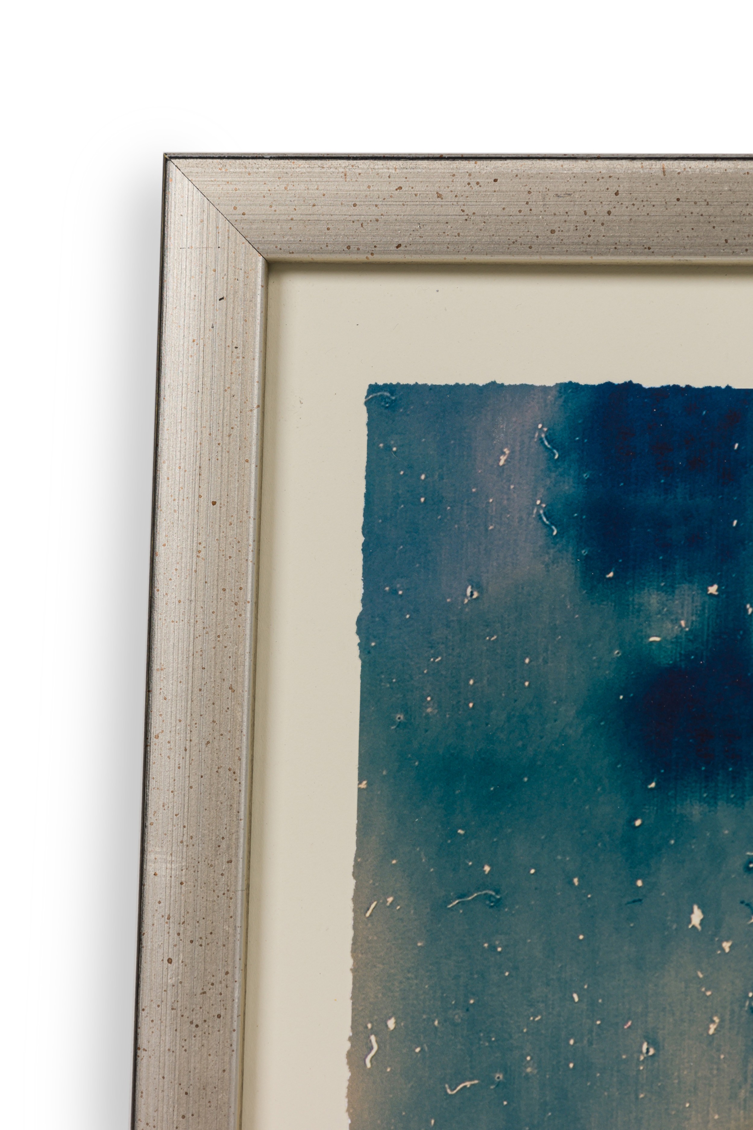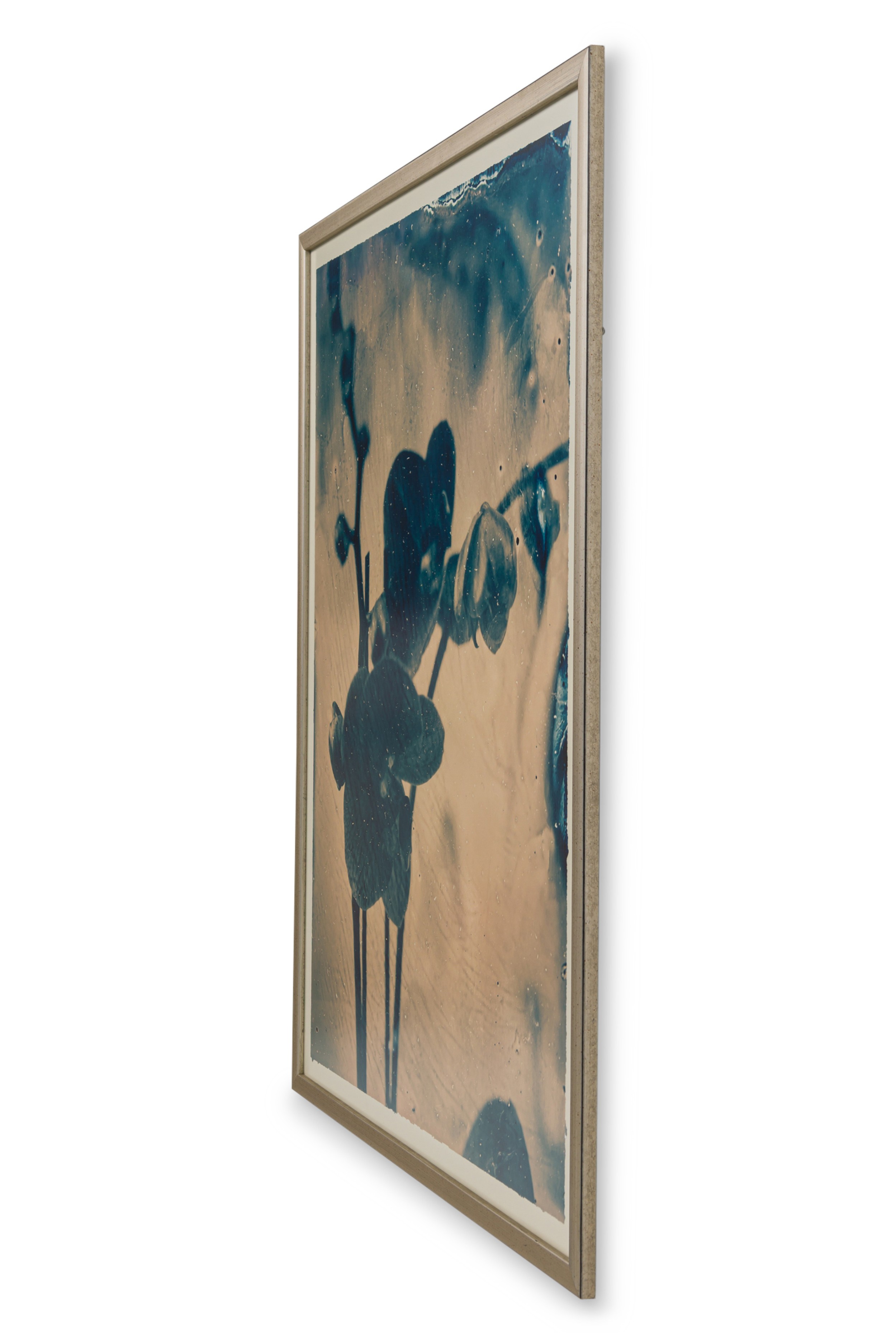Contemporary botanical photographic print in blue and sepia tones depicting an orchid silhouette. Framed in a brushed silver frame.