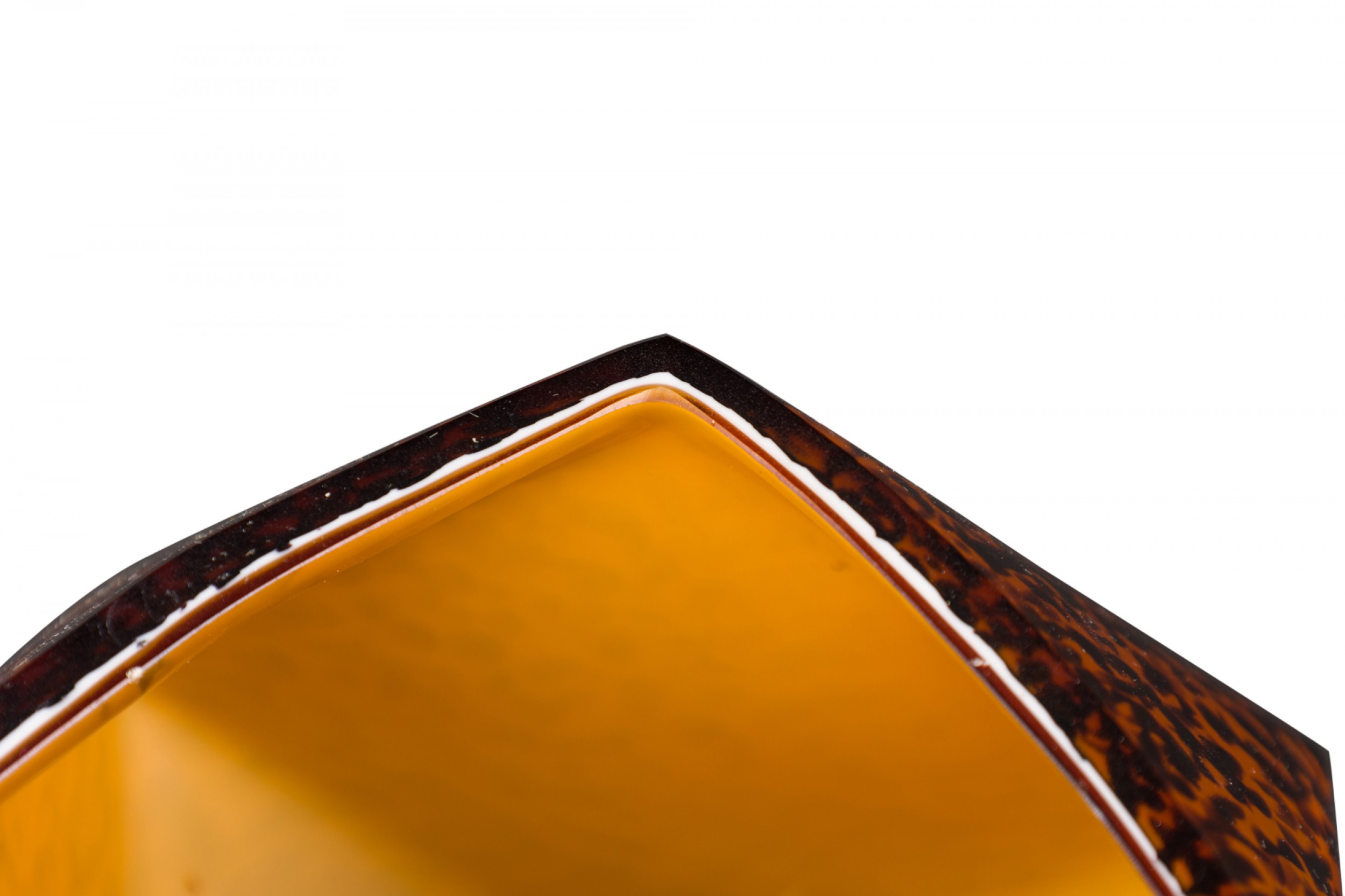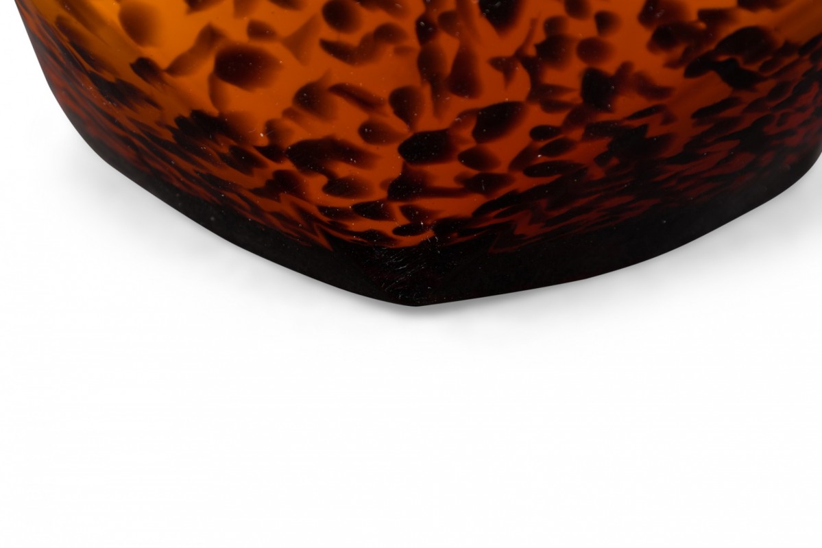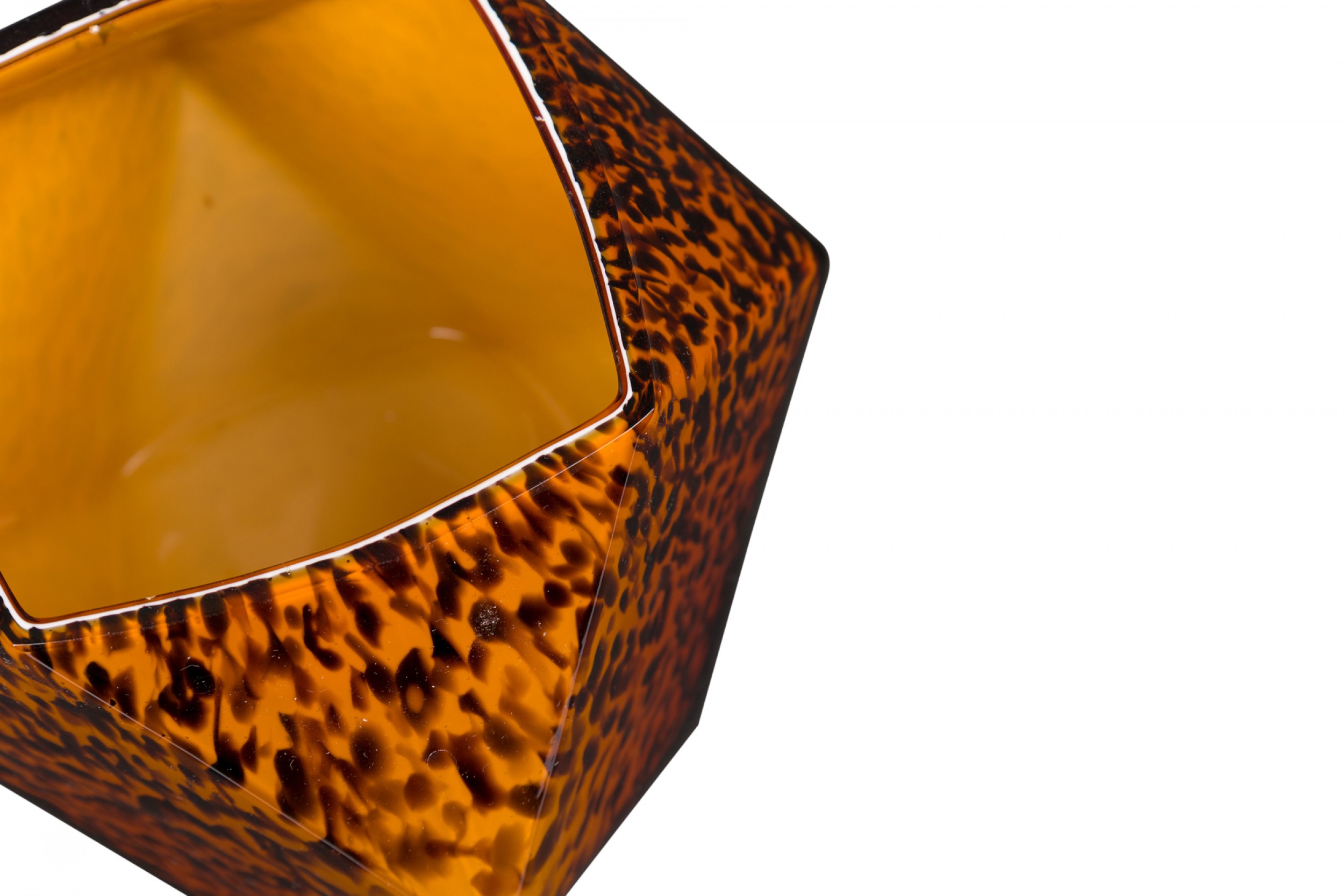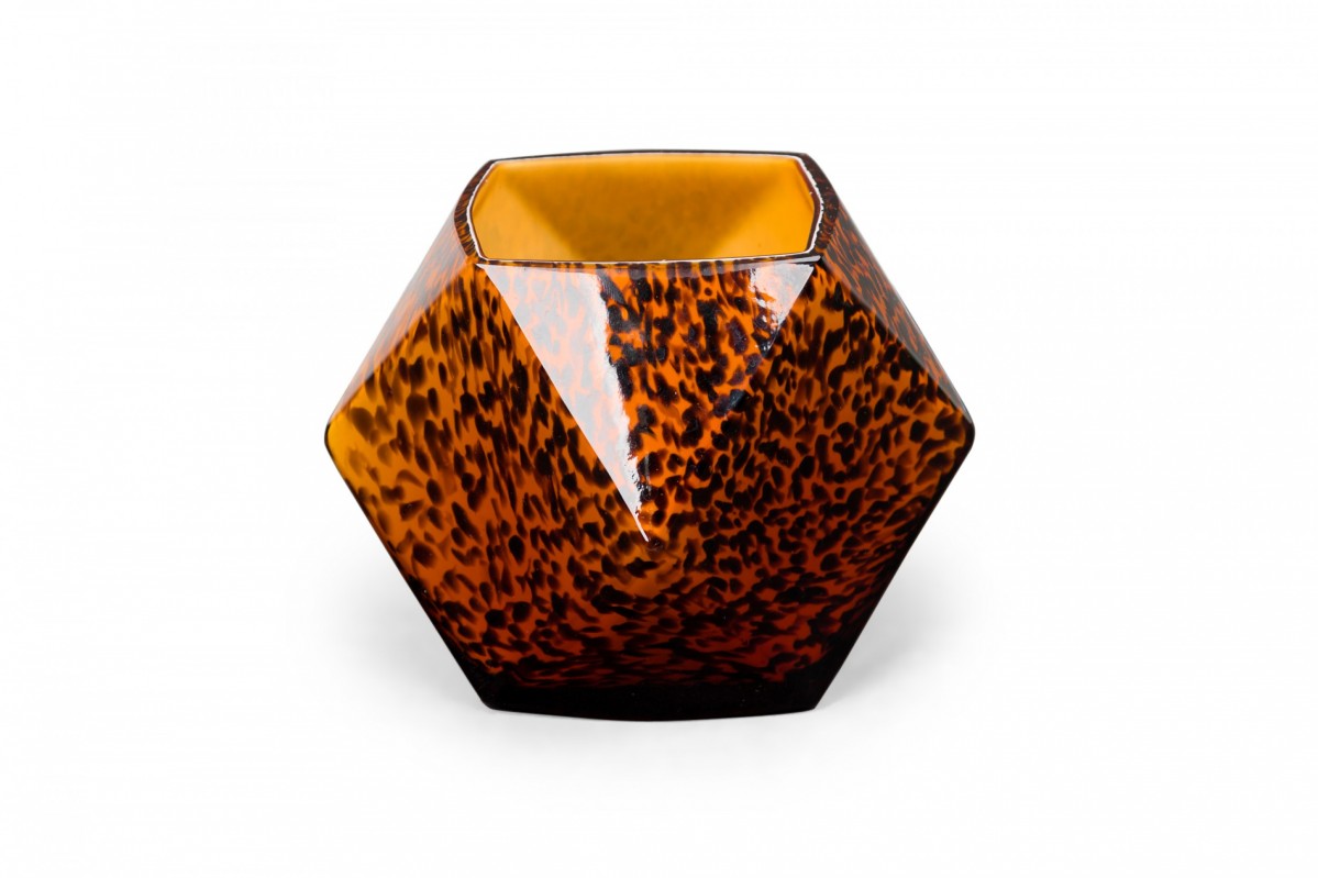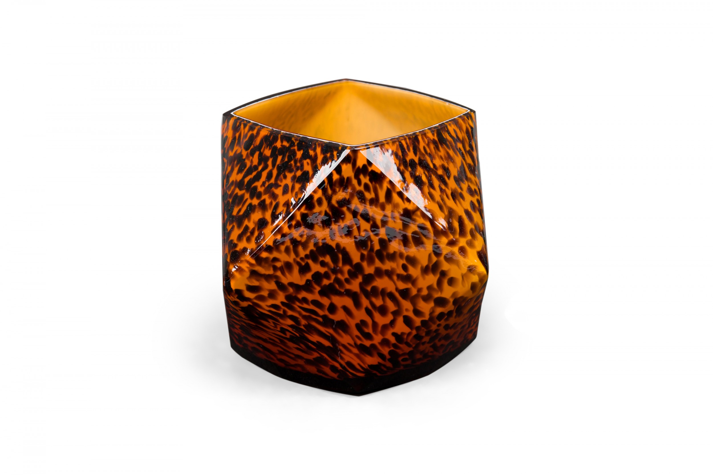 Contemporary American Vintage art glass polyhedral vase with a leopard-like pattern of brown speckles against a golden orange ground.