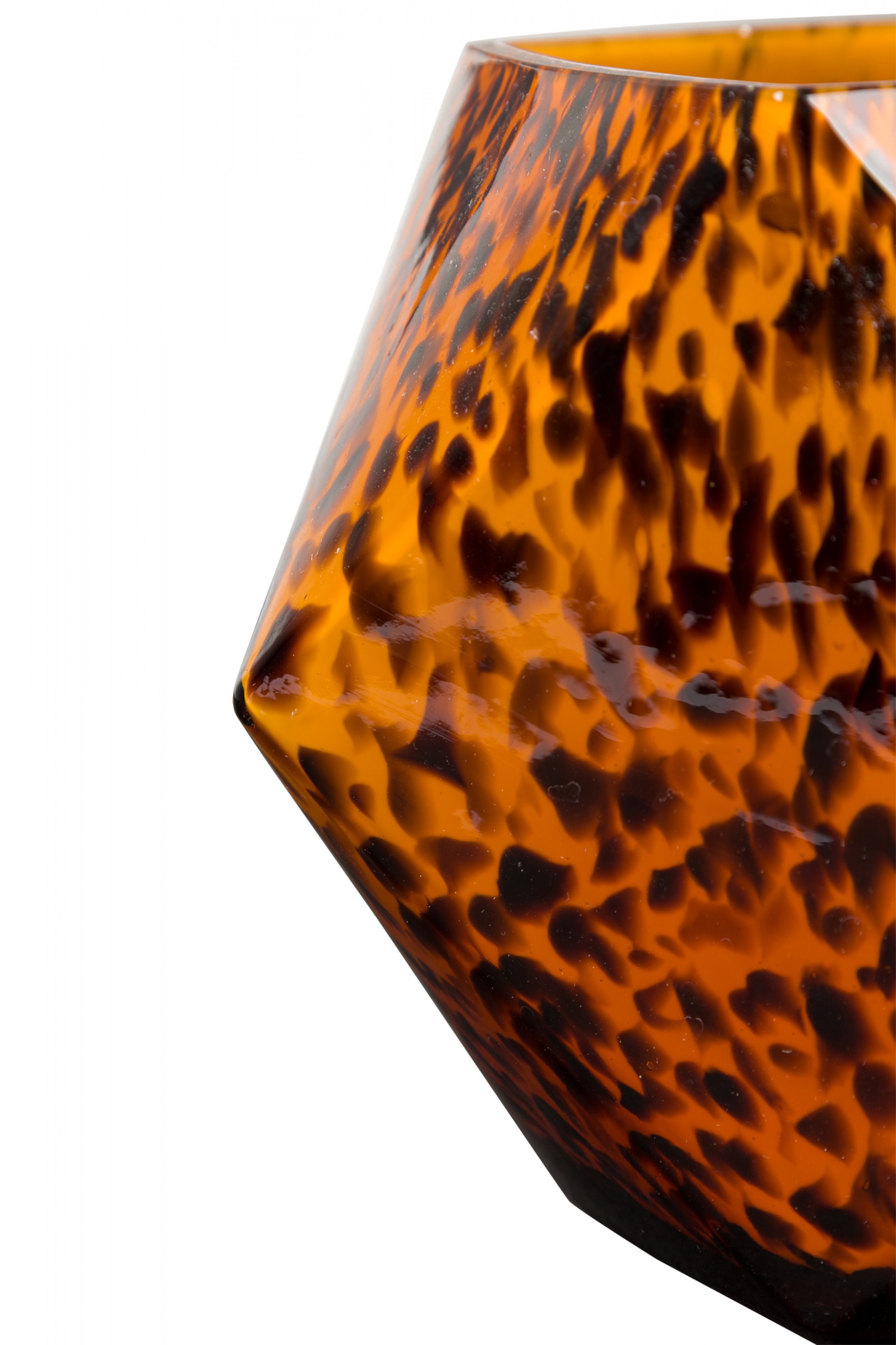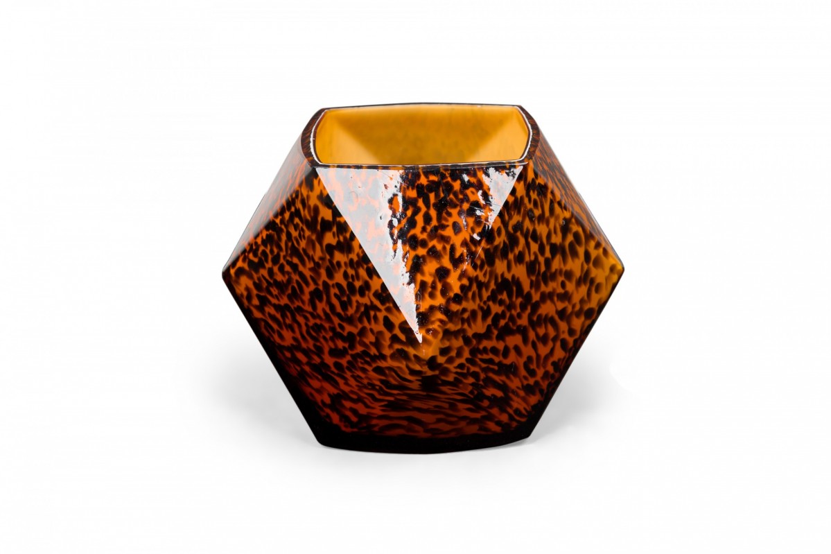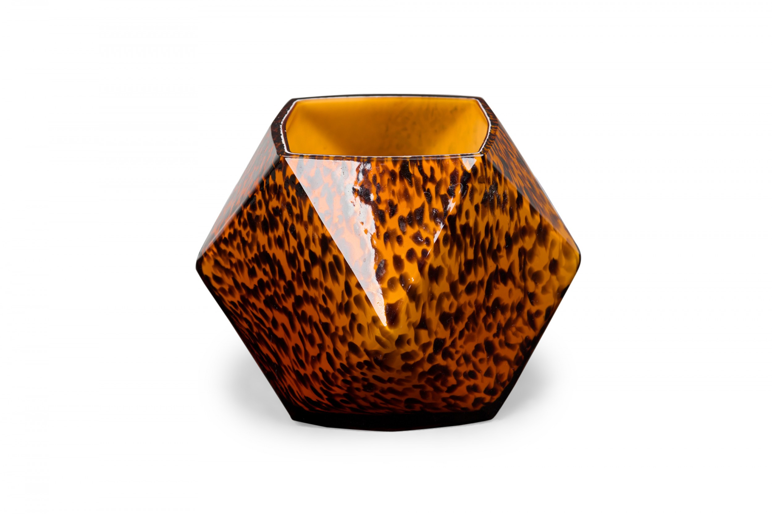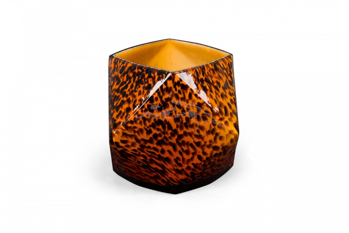 Choose one of the options below.Contemporary American Vintage Brown and Orange Leopard Speckled Polyhedral Glass Vase