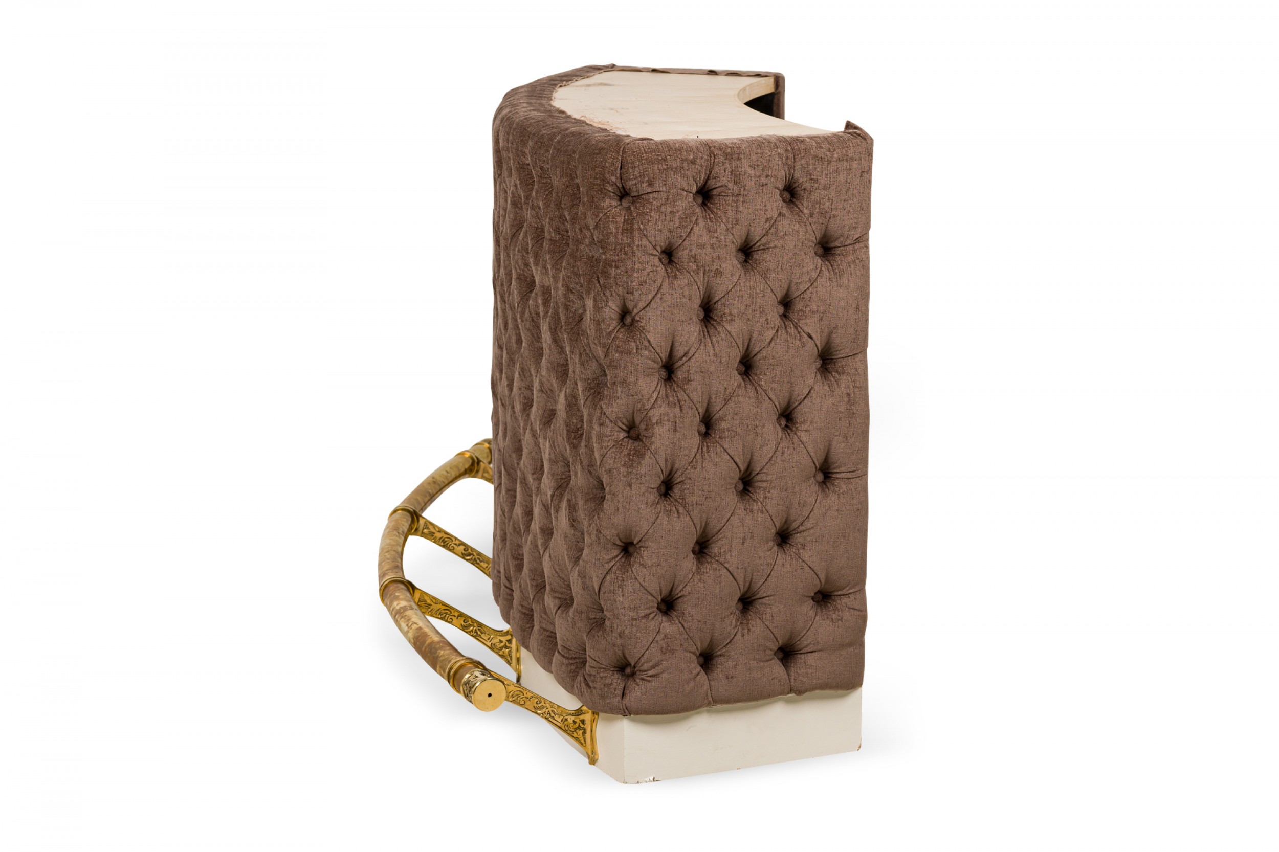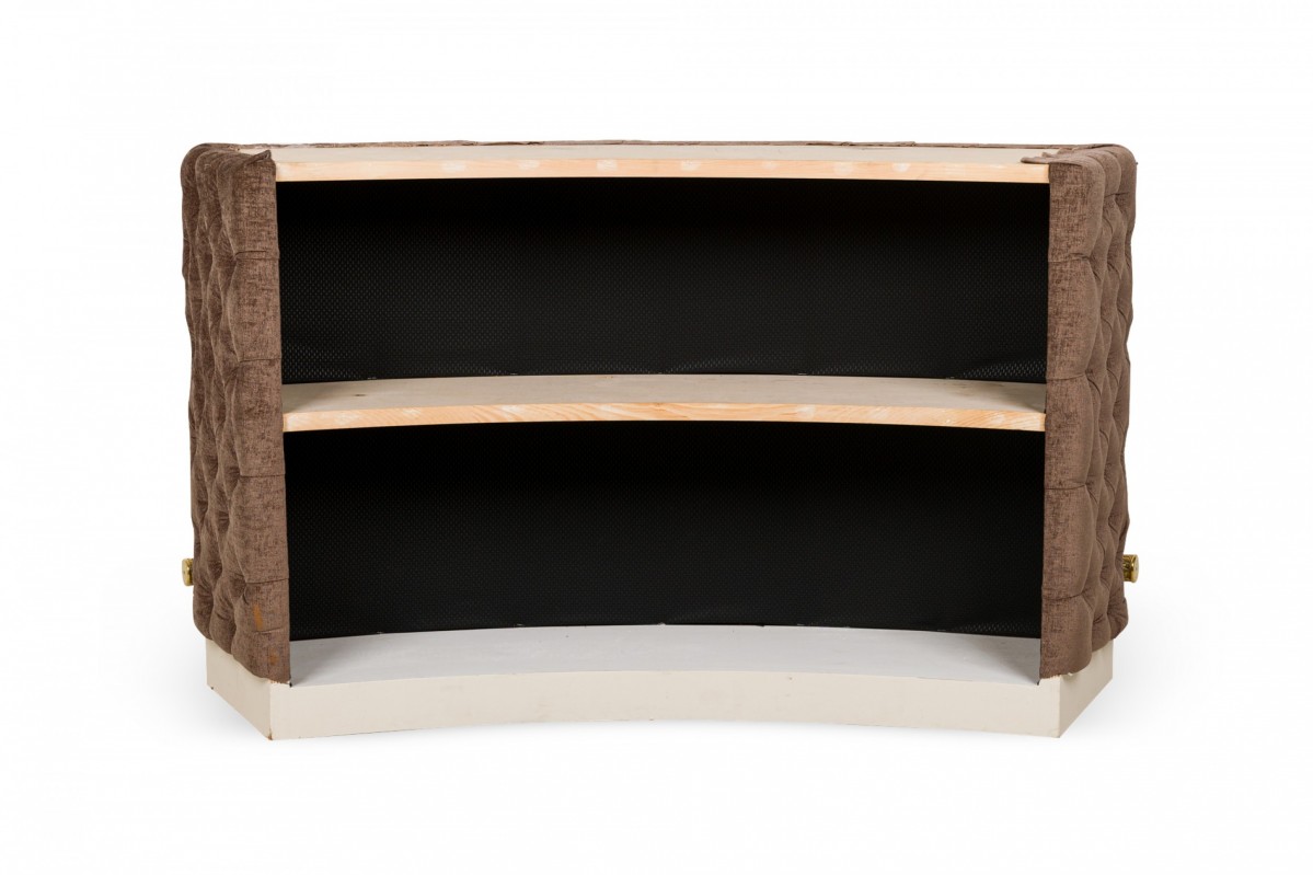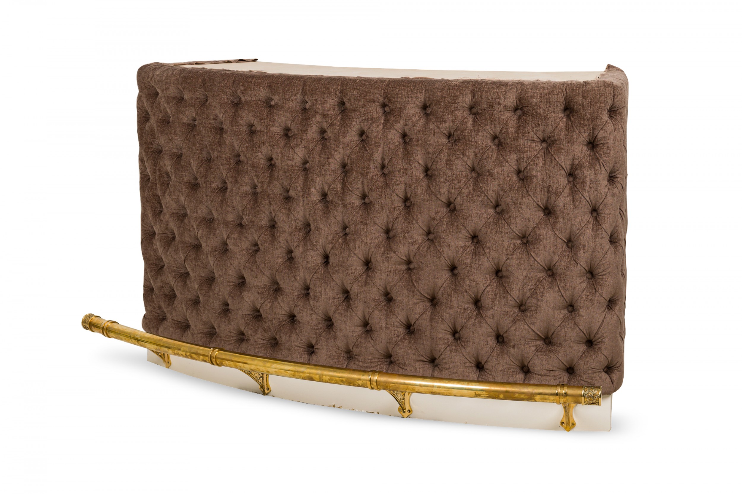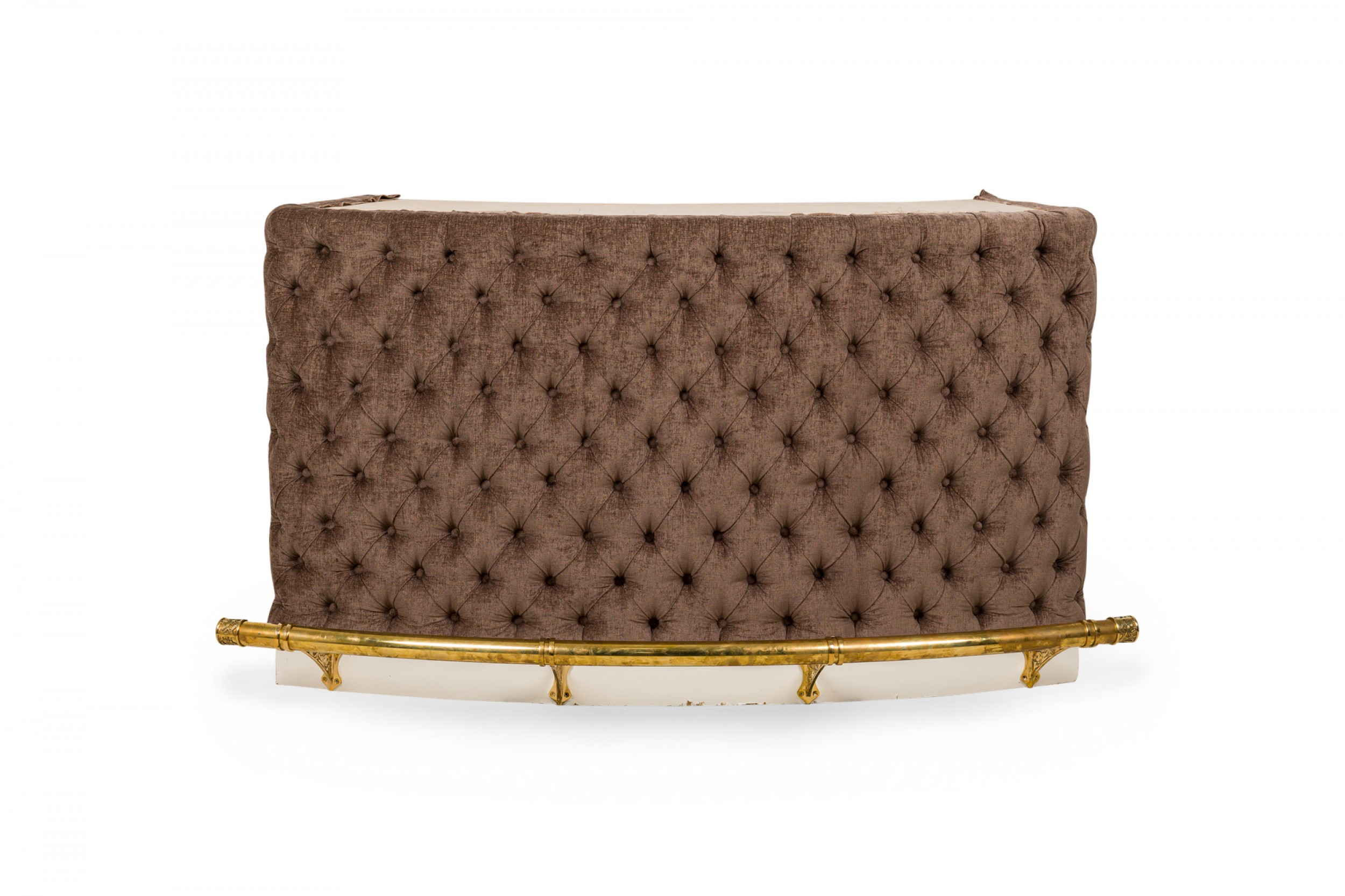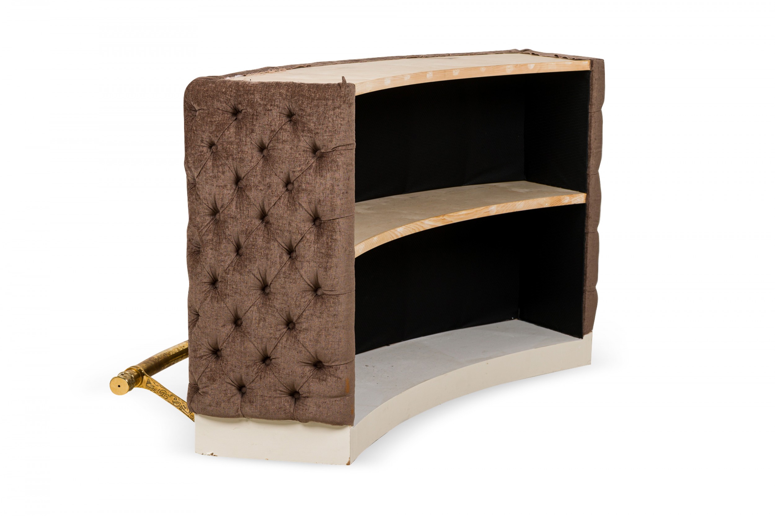Contemporary bar in curved form featuring three back shelves, the front and sides upholstered in a firm taupe button tufted chenille fabric and a brass foot rail with scroll & foliate embellishments, anchored by four upwardly angled supports. (NOTE: NO TOP - NEEDS TO BE FABRICATED)