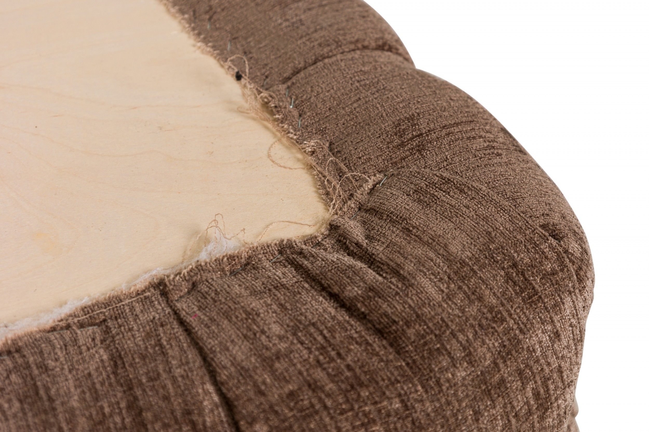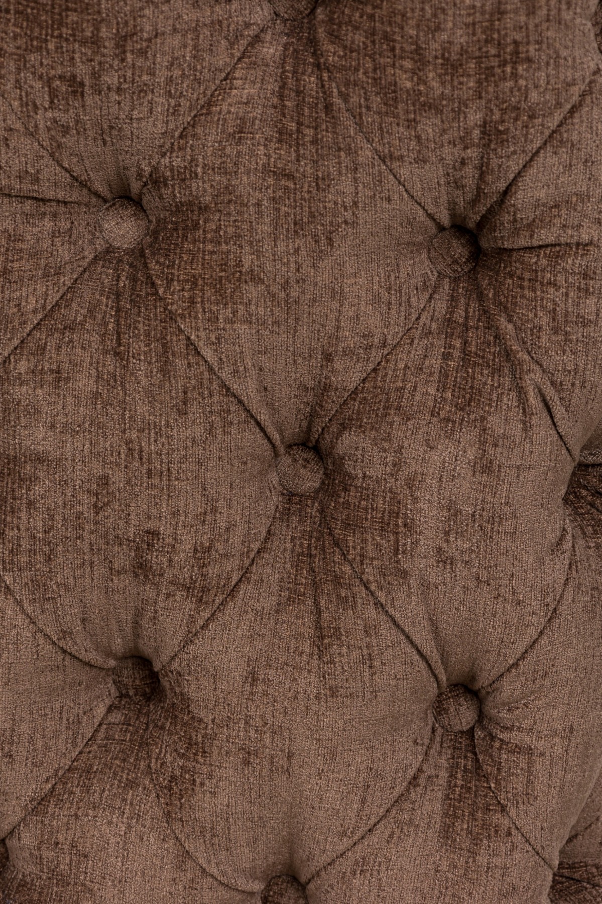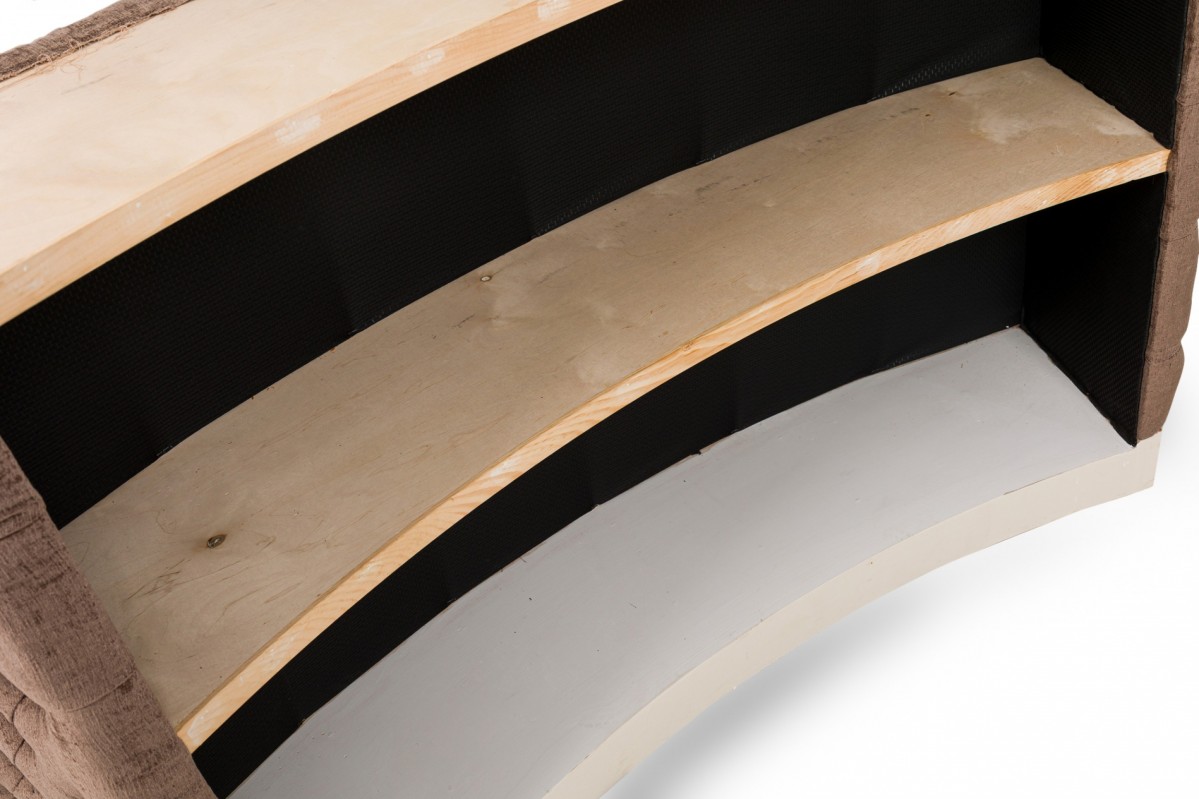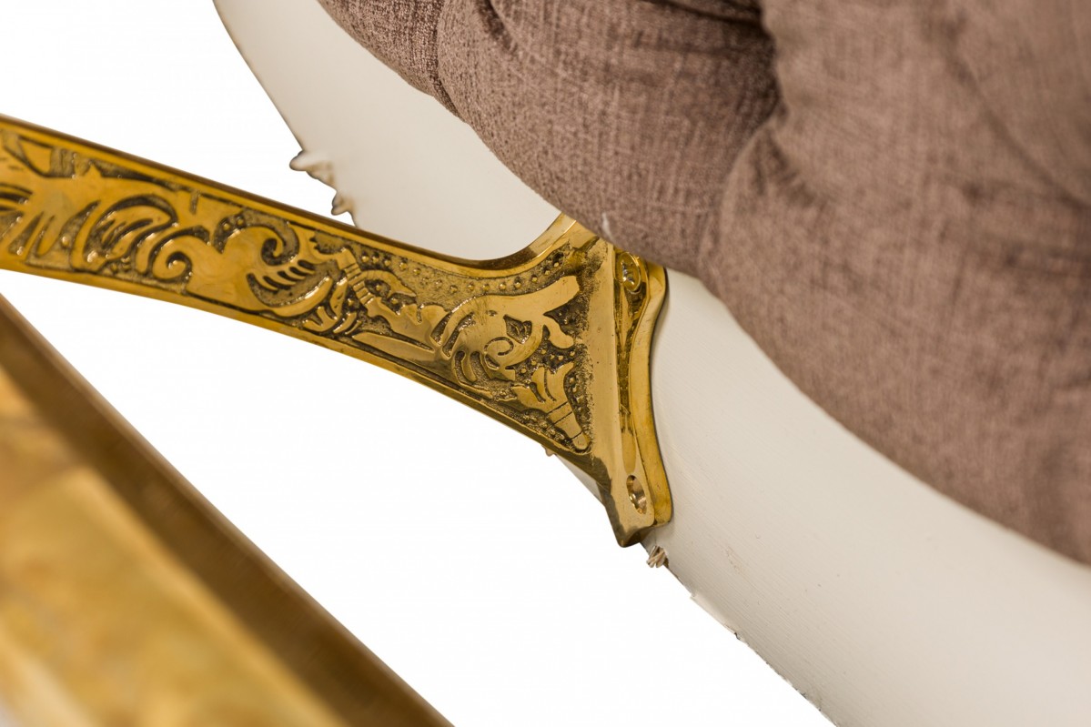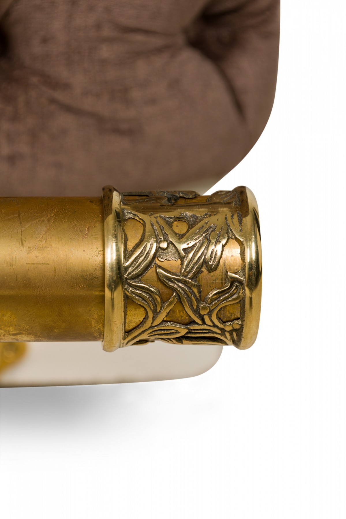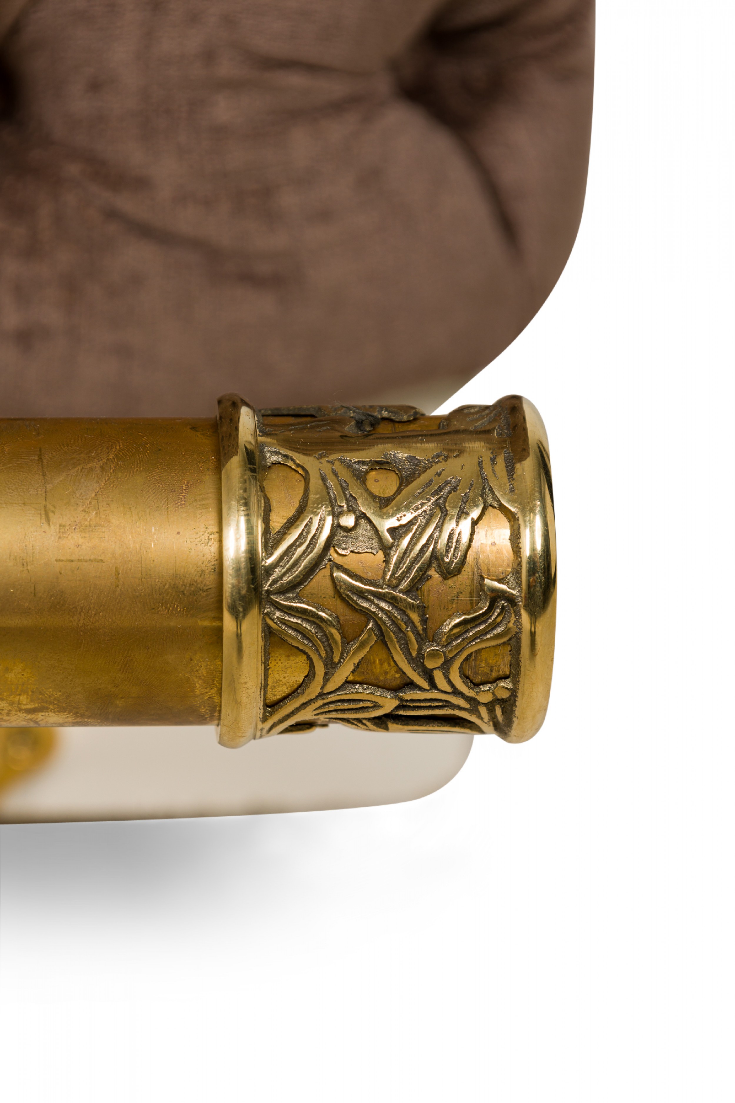 Contemporary bar in curved form featuring three back shelves, the front and sides upholstered in a firm taupe button tufted chenille fabric and a brass foot rail with scroll & foliate embellishments, anchored by four upwardly angled supports. (NOTE: NO TOP - NEEDS TO BE FABRICATED)