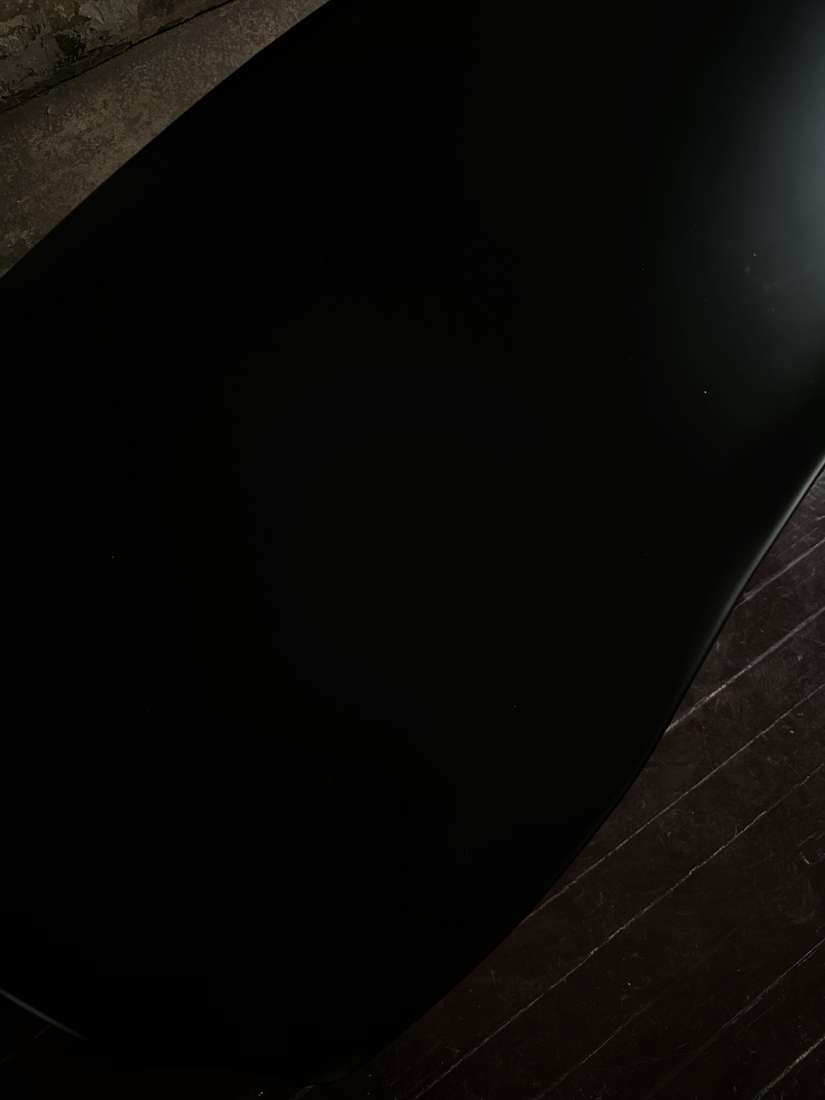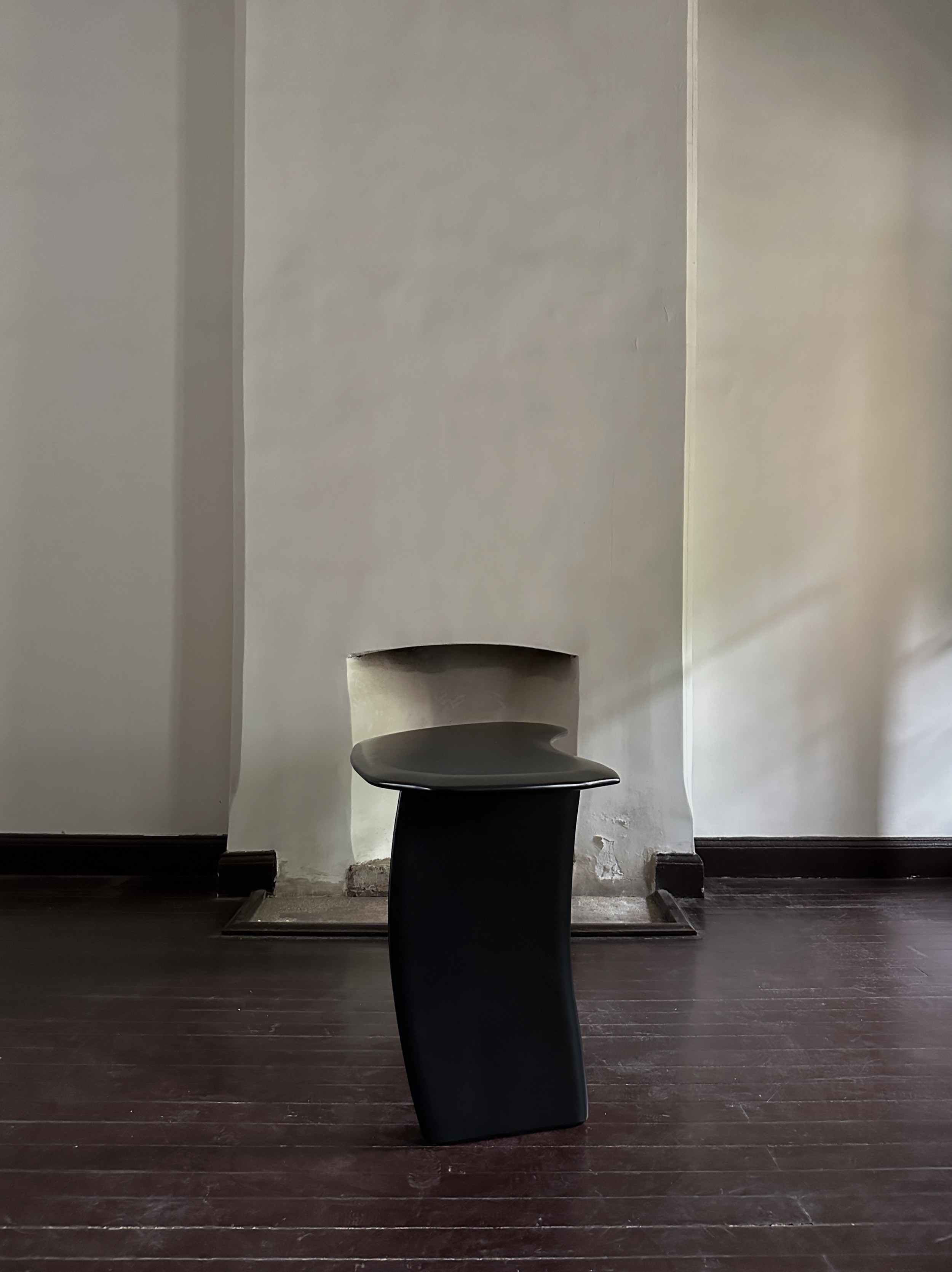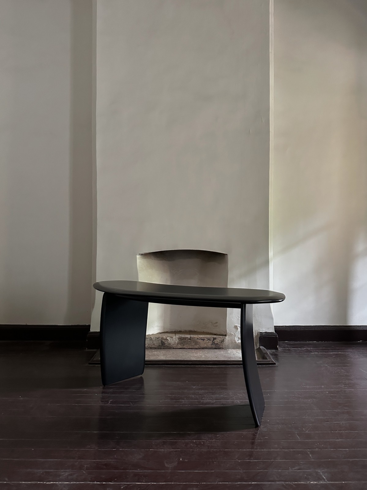 Contemporary Oracle desk featuring an organic shape made of lacquered ash wood with beveled edge, ending on two slab style legs