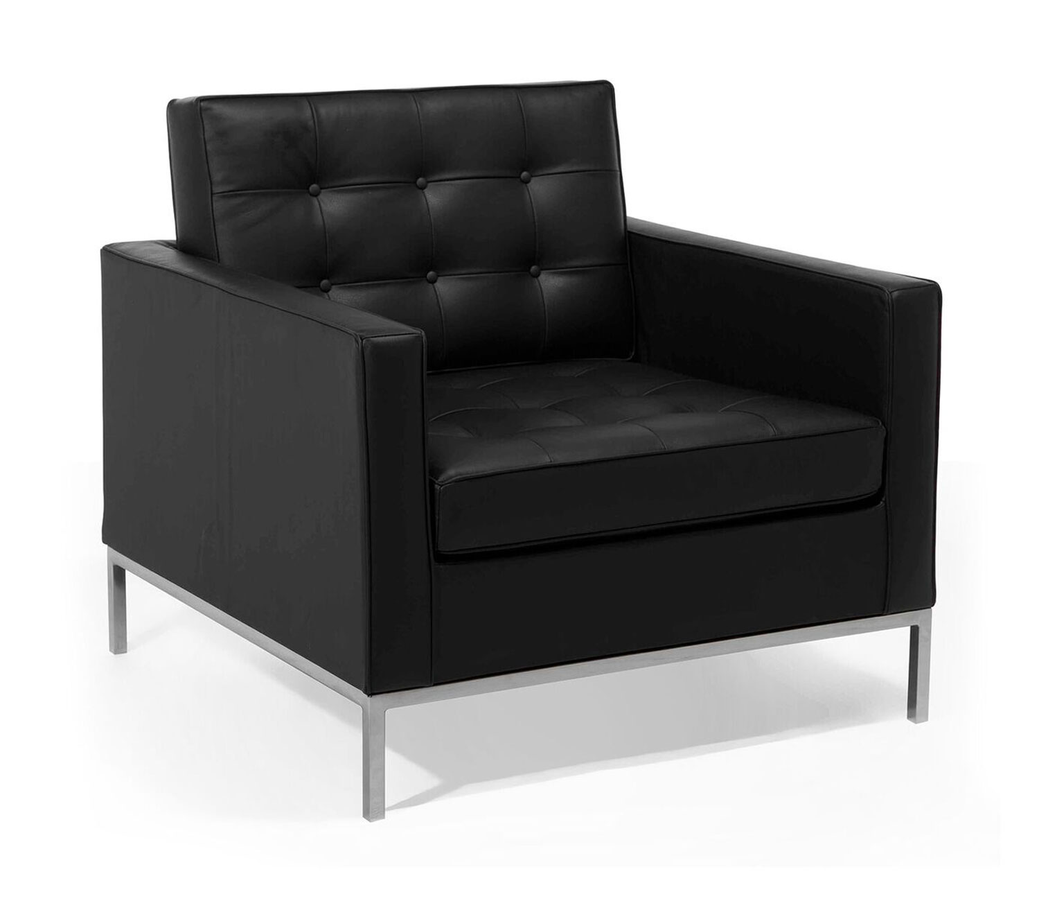 Contemporary black leather armchair with a hardwood frame, back cushion and removable seat cushion made of multi-density foam, stainless steel seat support frame, and button-tufted detailing.