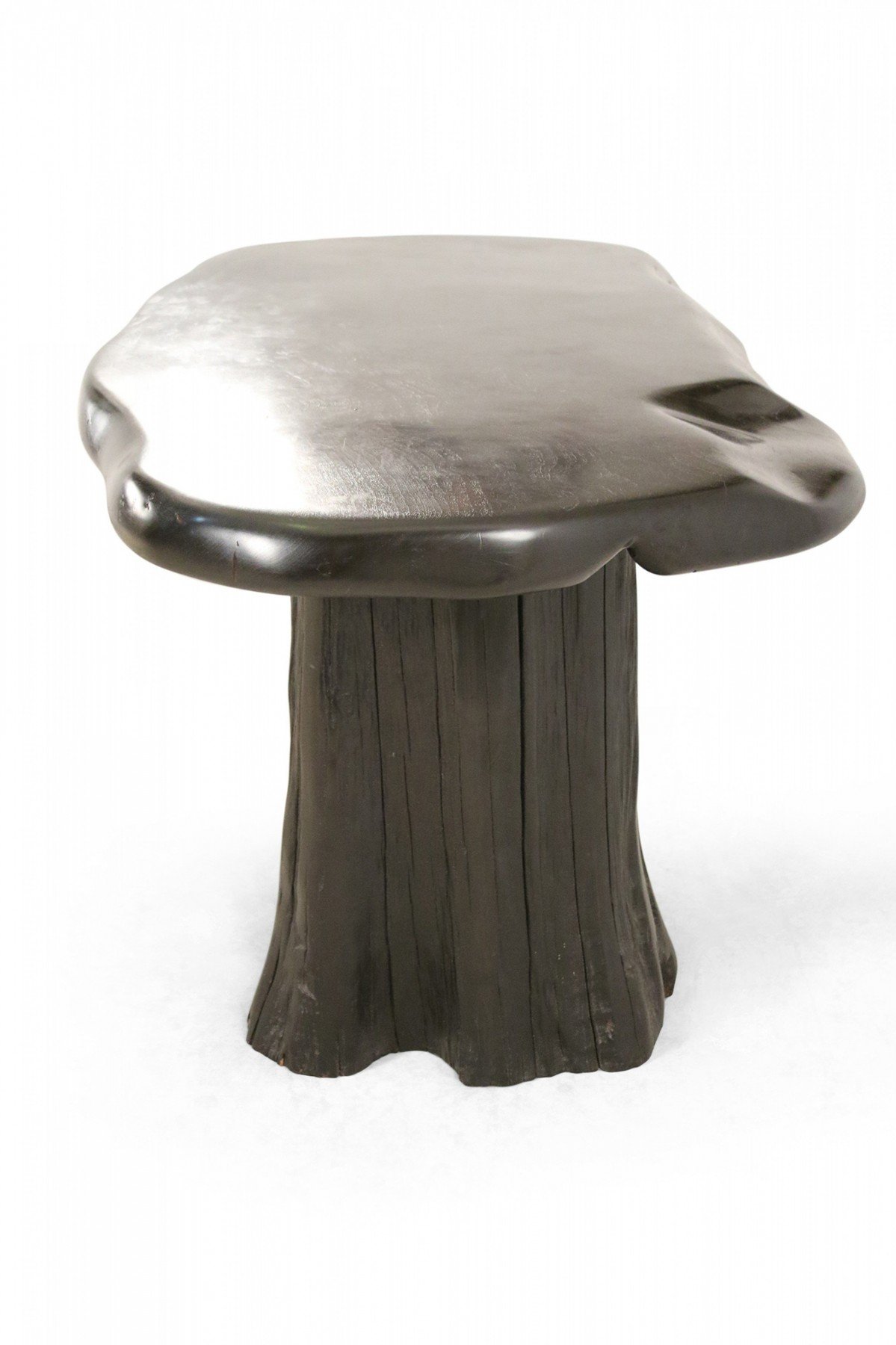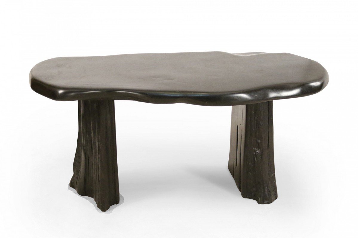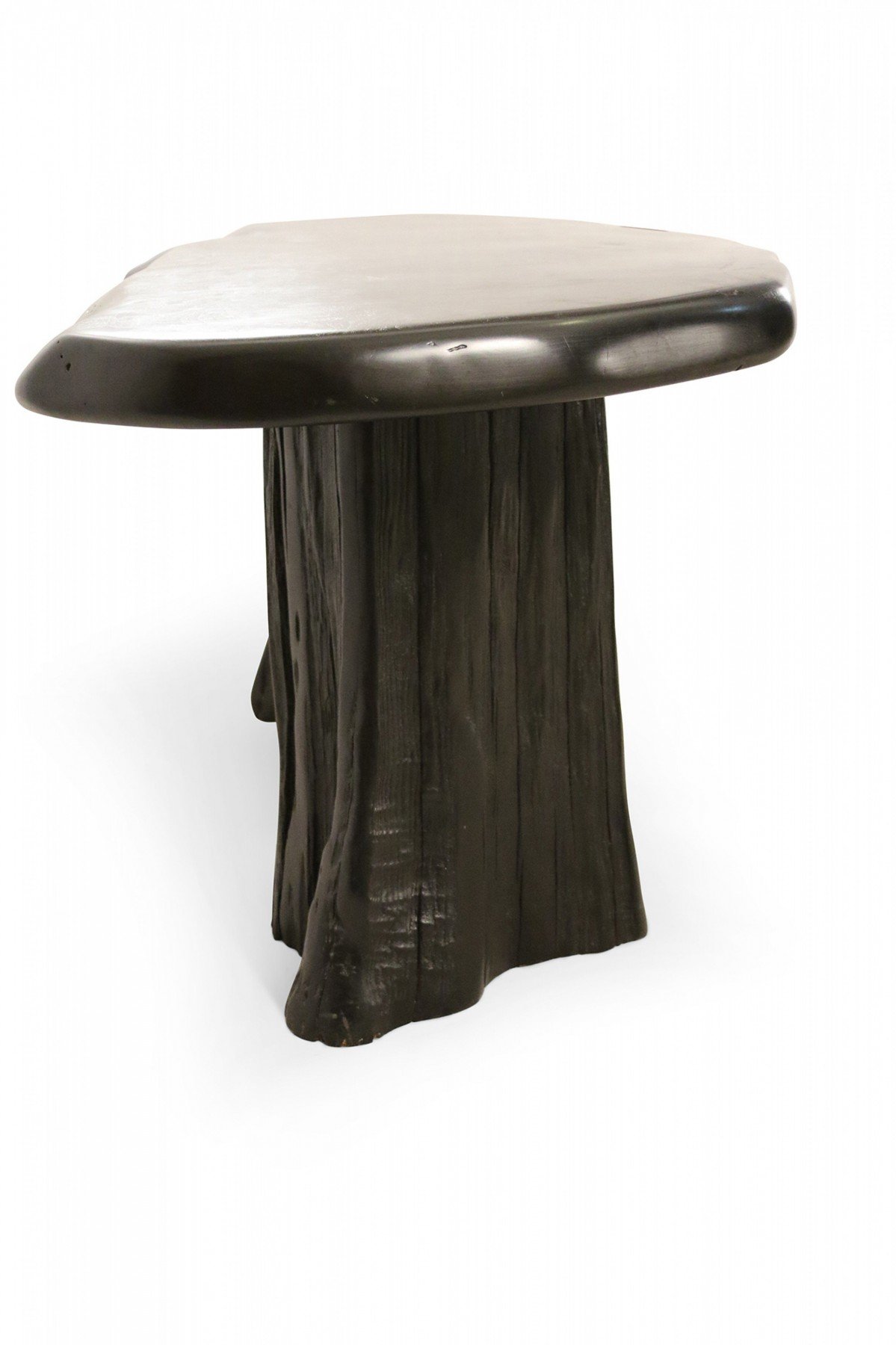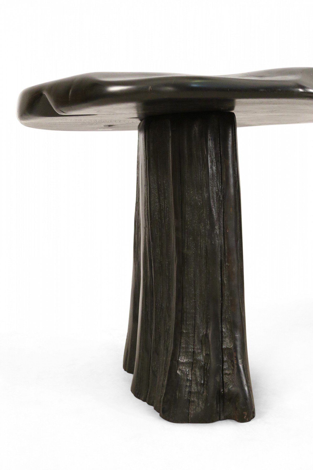 Contemporary black painted desk / console with an irregularly shaped table top on two carved legs with a tree trunk design.