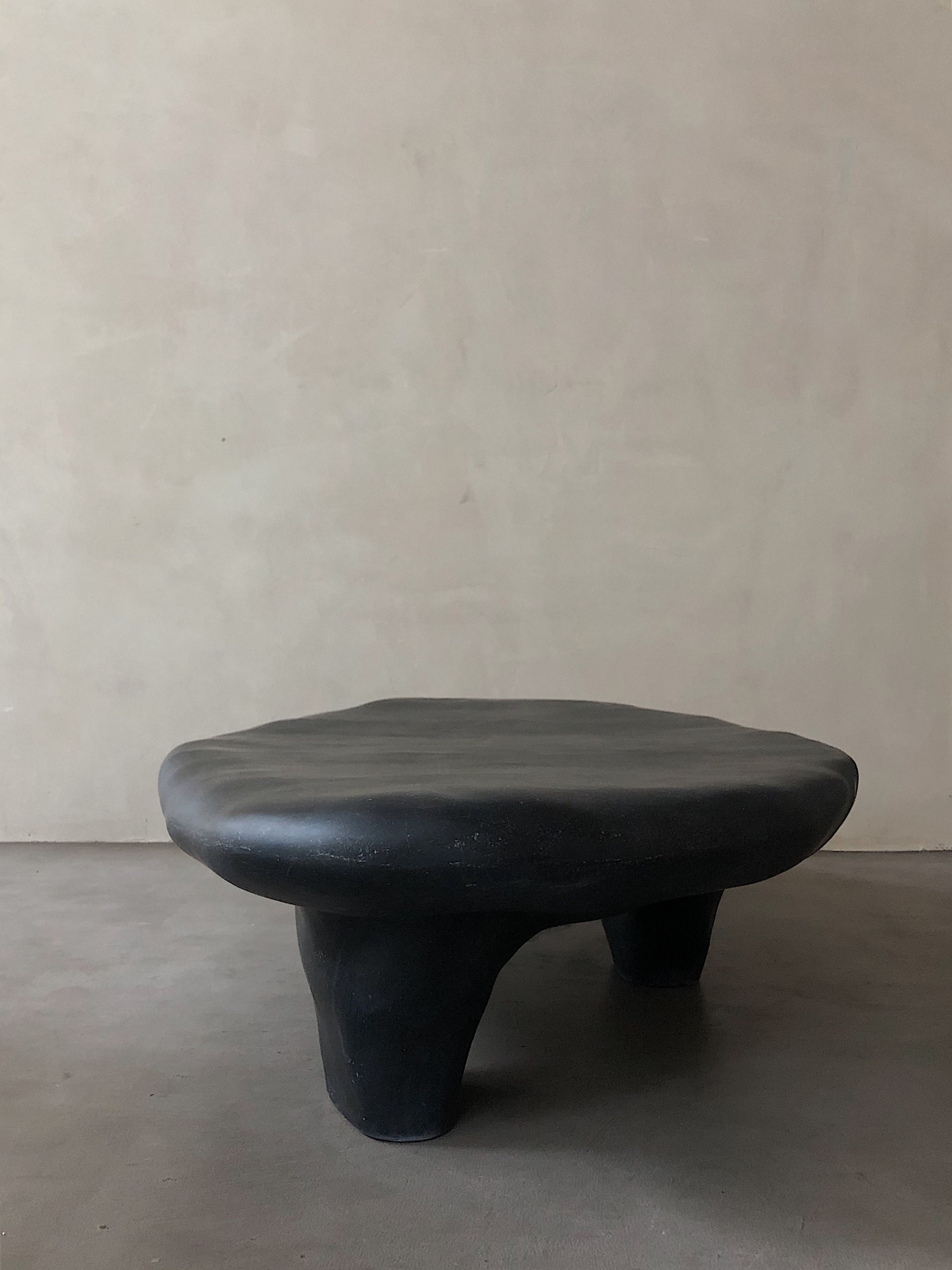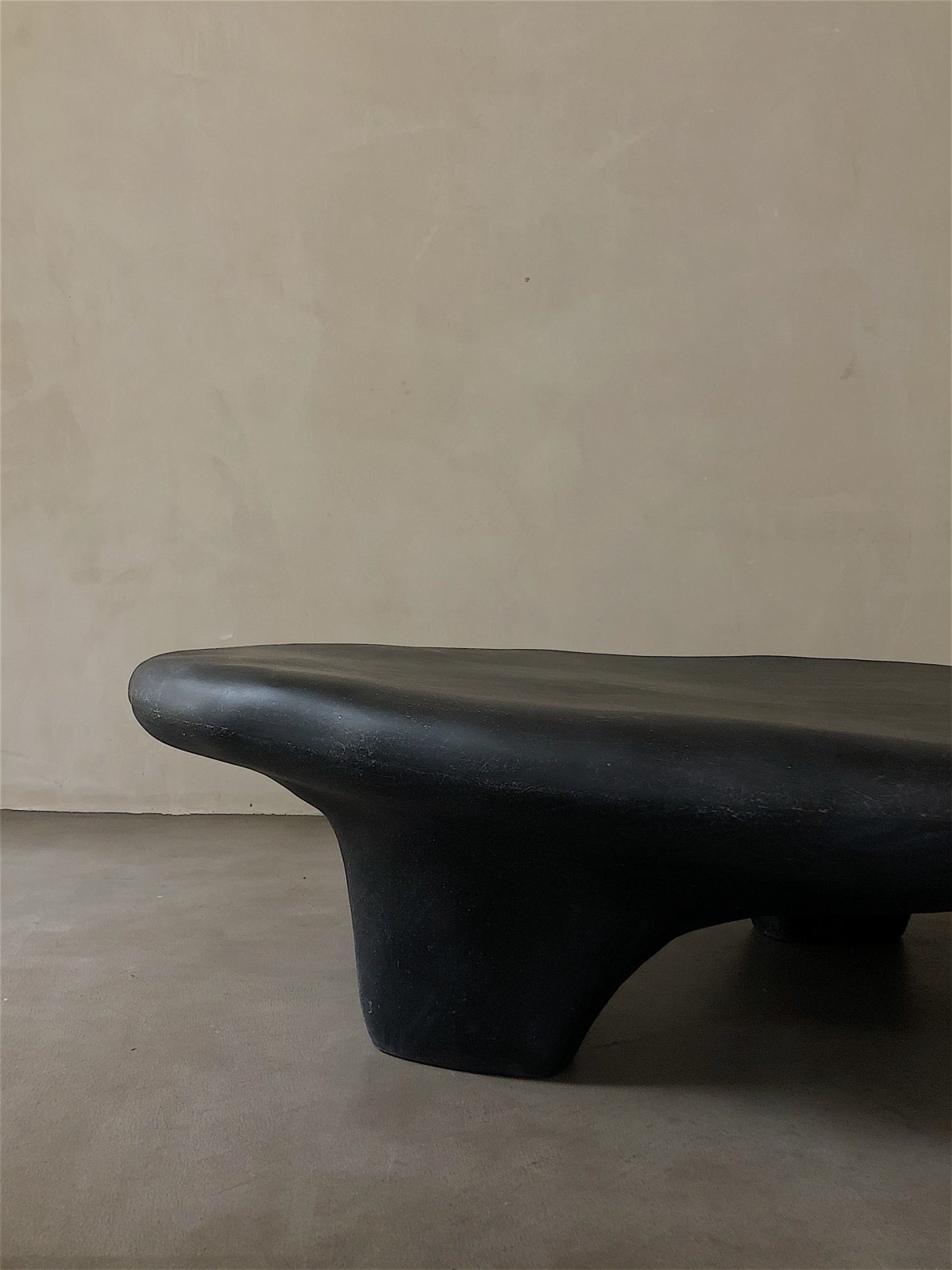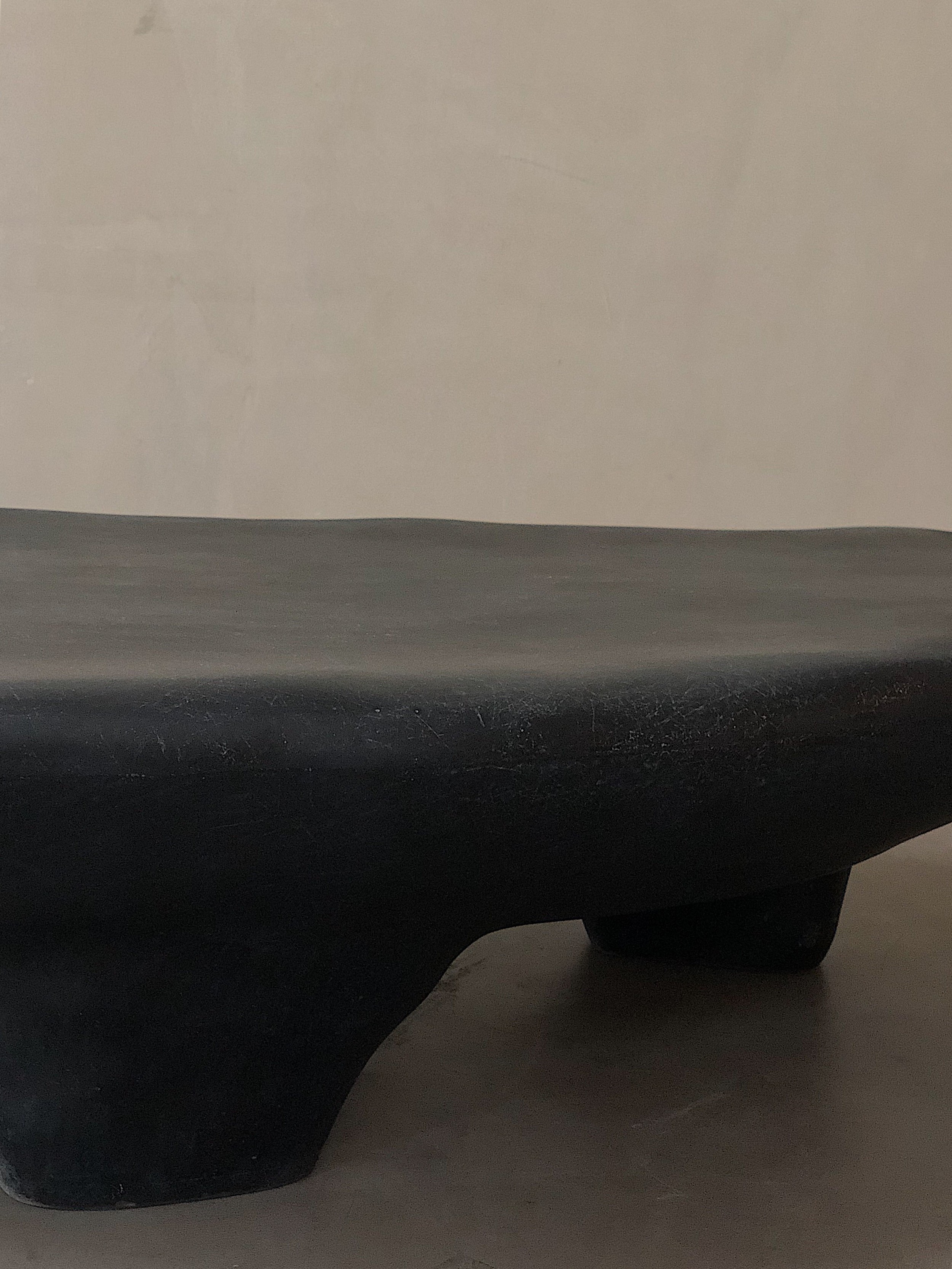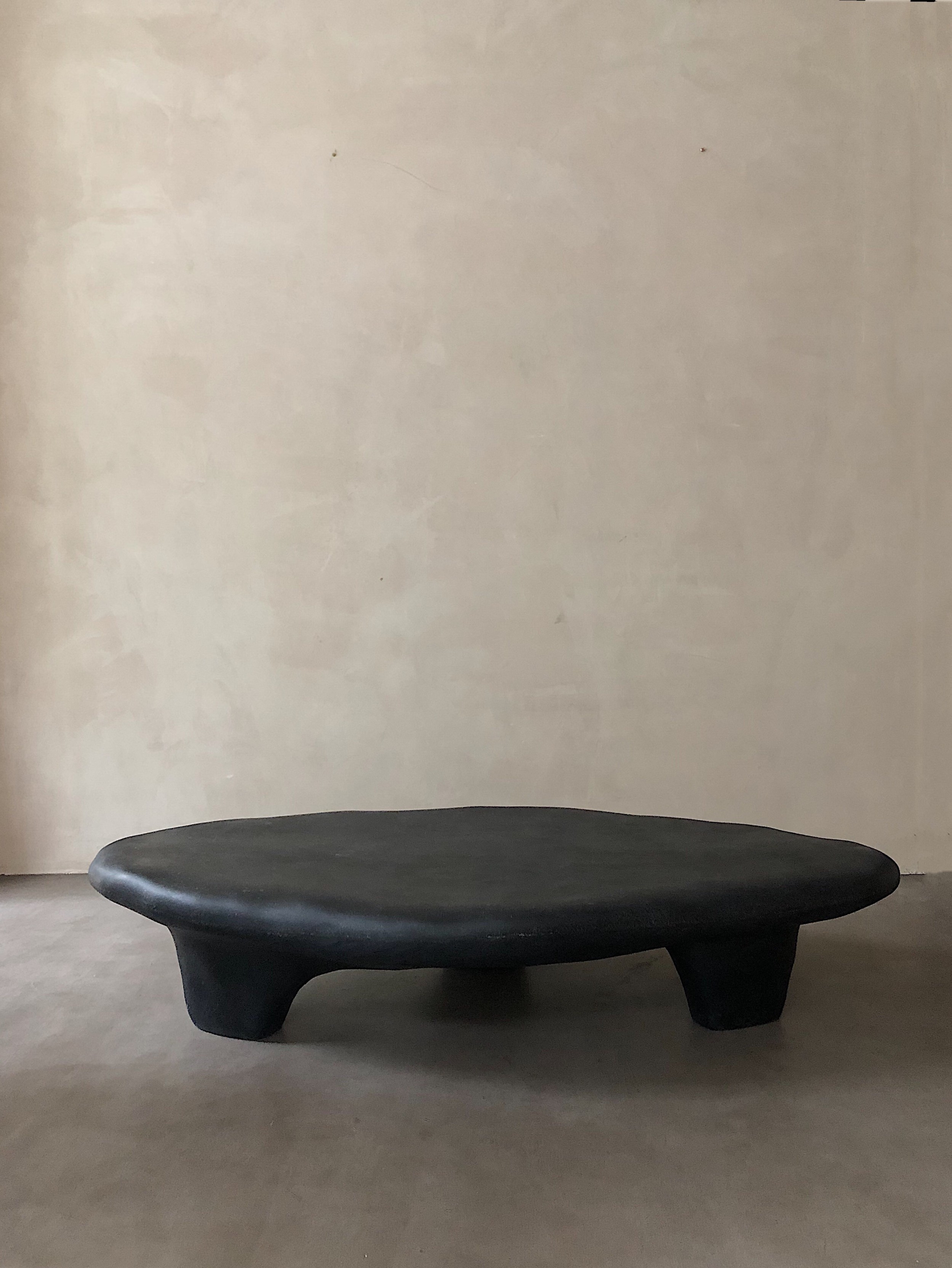 Contemporary Black Tripod fiberglass coffee table featuring subtly undulating edges, ending on three legs