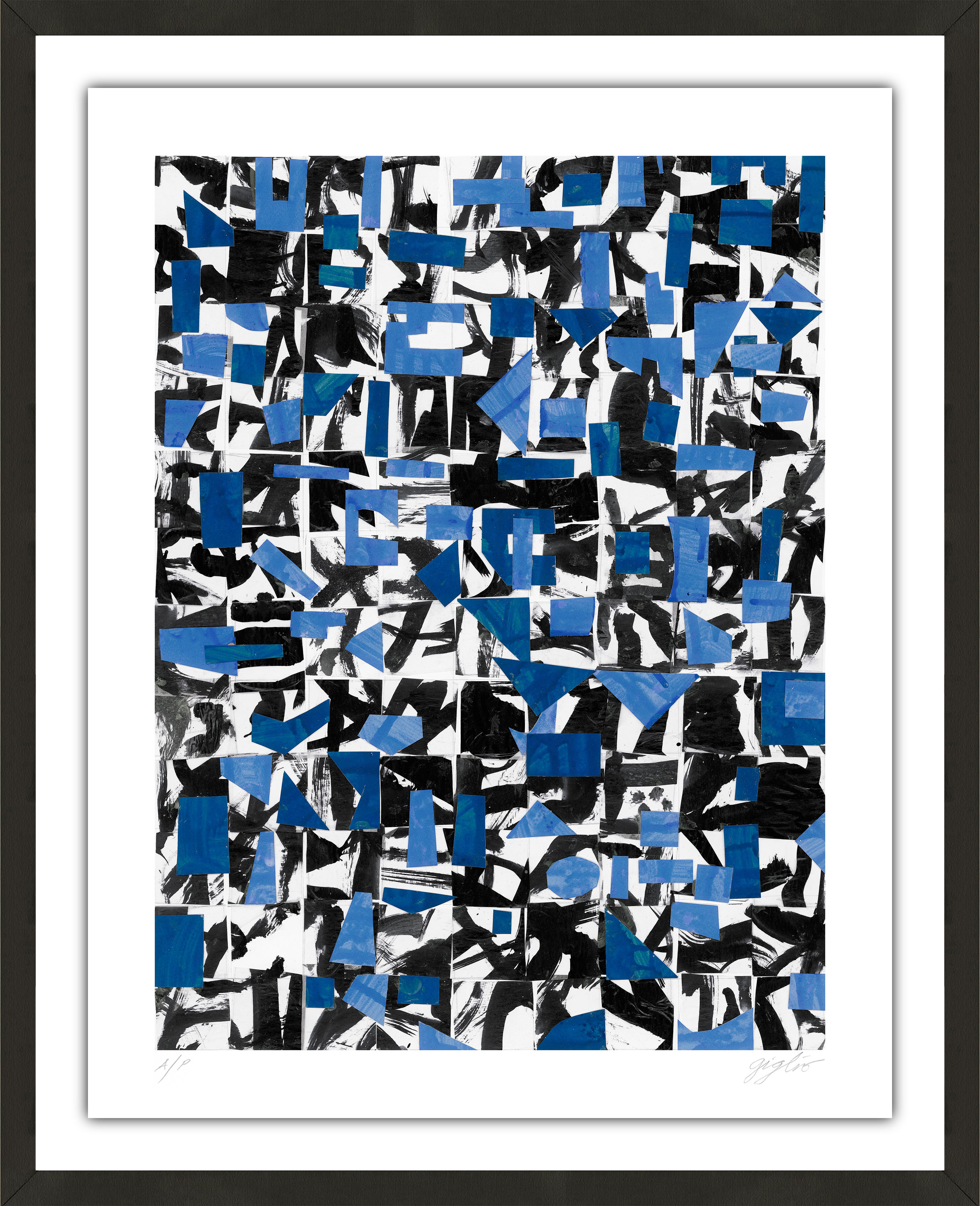 Contemporary abstract print in blue, black and white in white matting and a black rectangular frame
