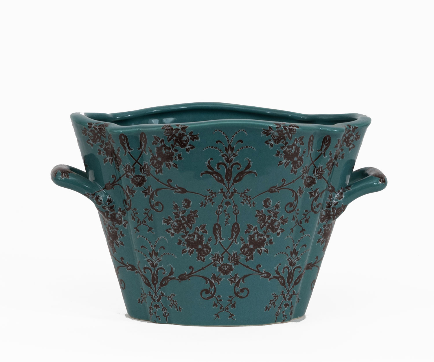 Contemporary ceramic cachepot with a blue glaze, brown floral pattern, scalloped rim, and two handles (Related item: MP2213)