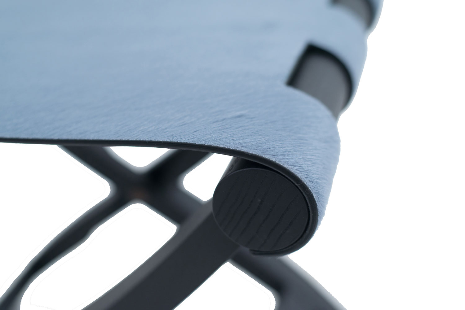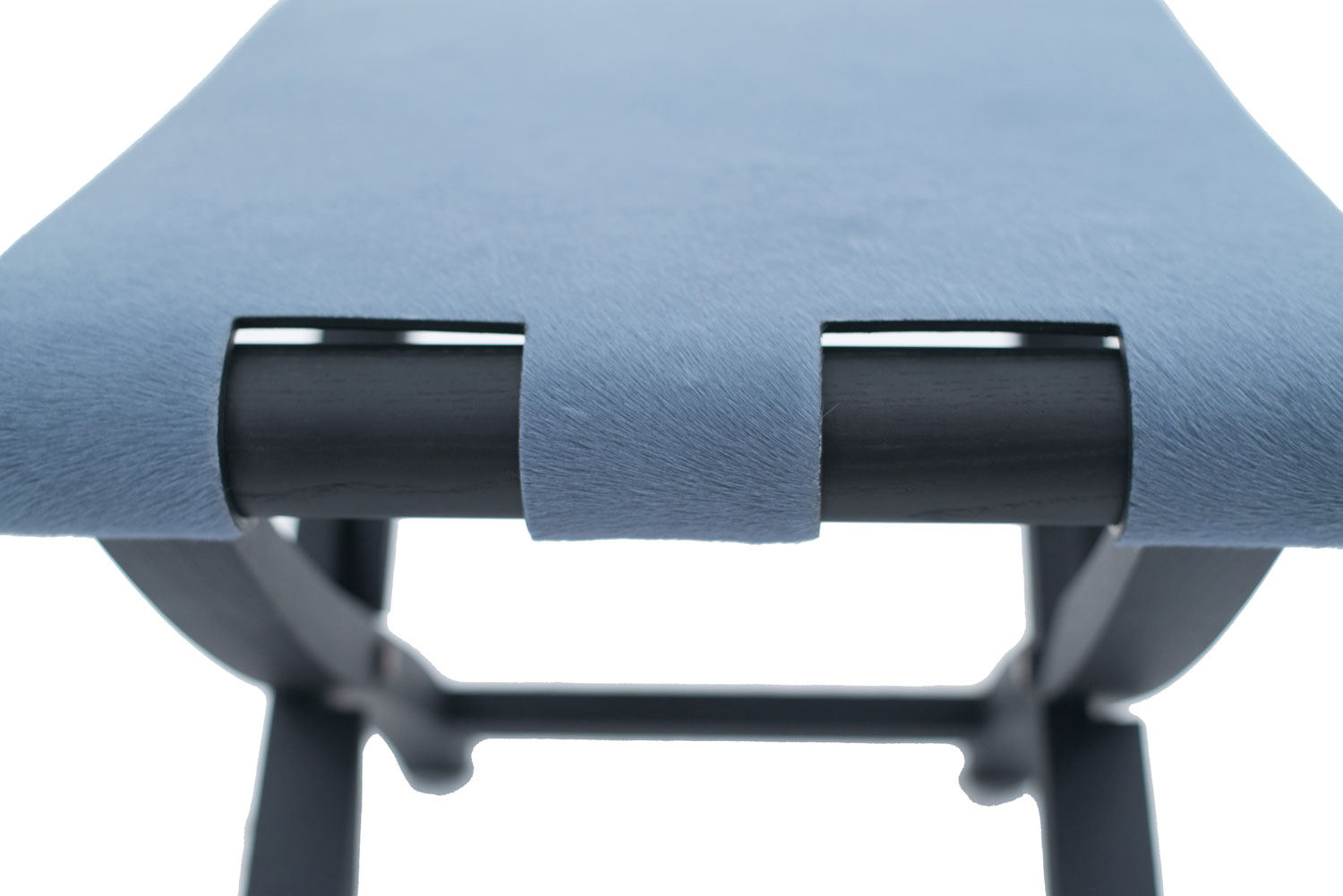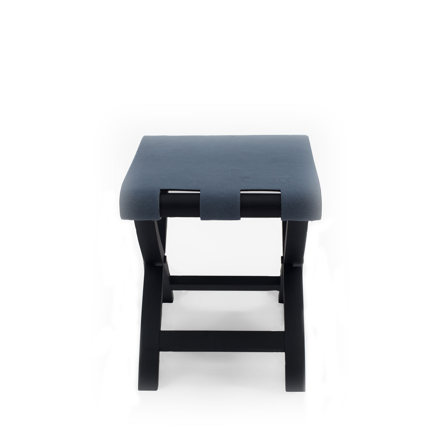 Contemporary Italian folding stool / luggage rack with a black base and cornflower blue pony hair seat.