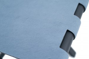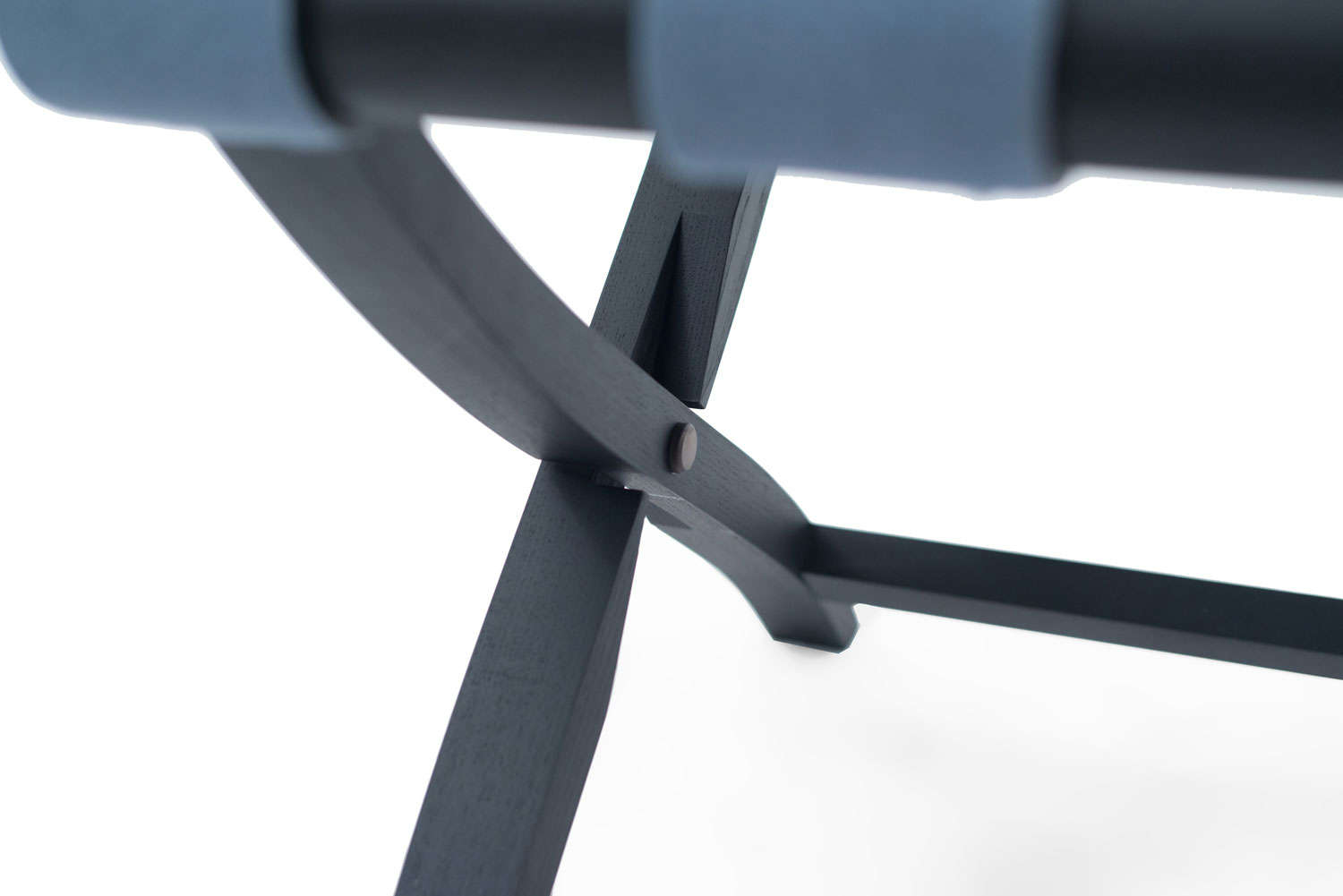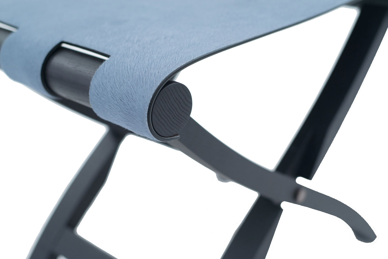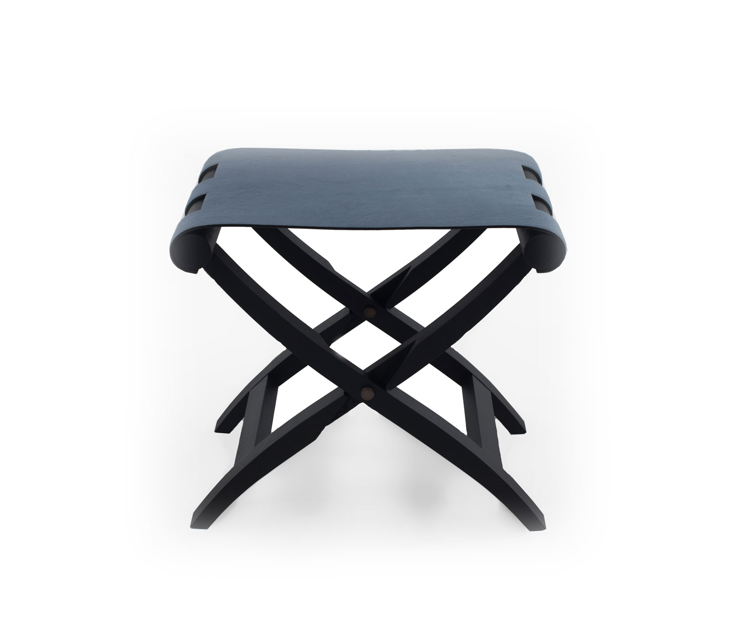 Contemporary Italian folding stool / luggage rack with a black base and cornflower blue pony hair seat.
