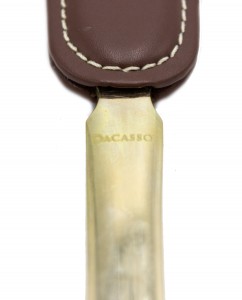 Contemporary brass letter opener with a stitched brown leather handle (DACASSO)
