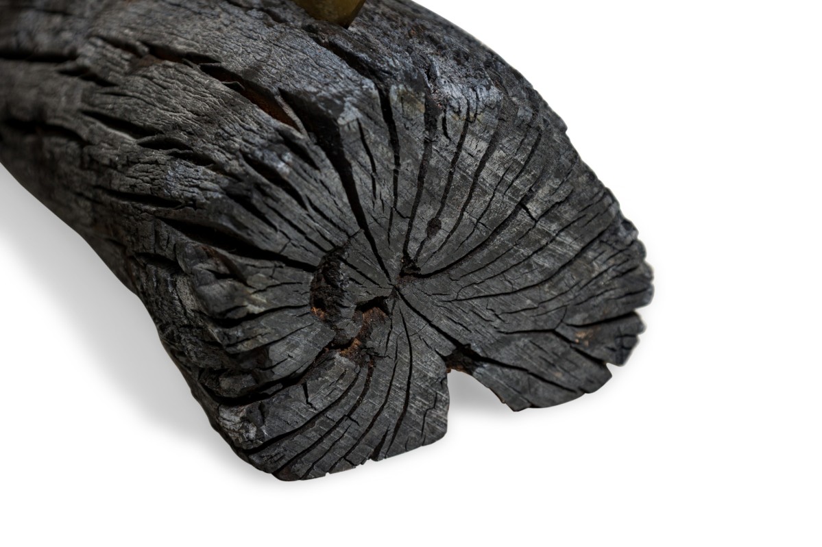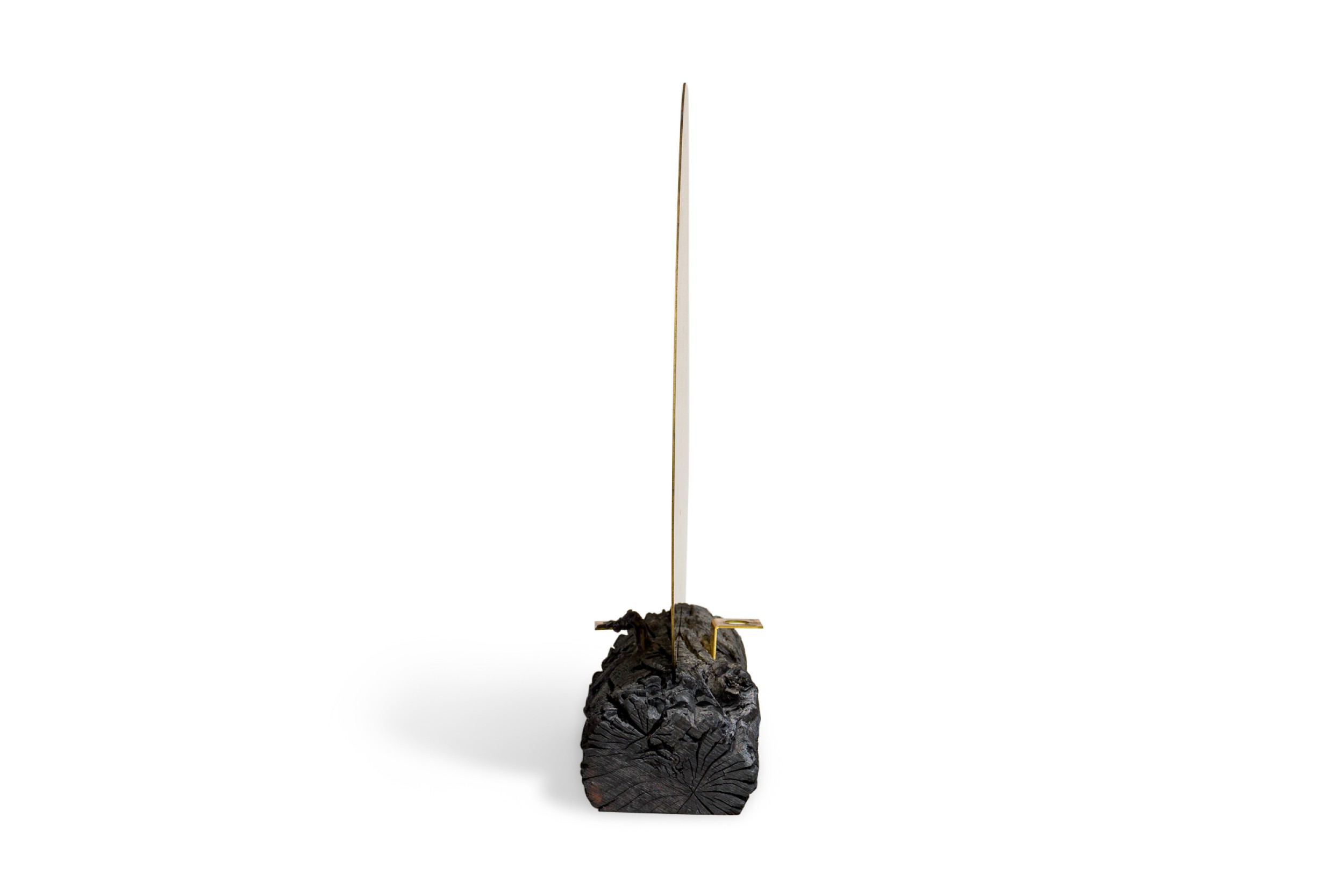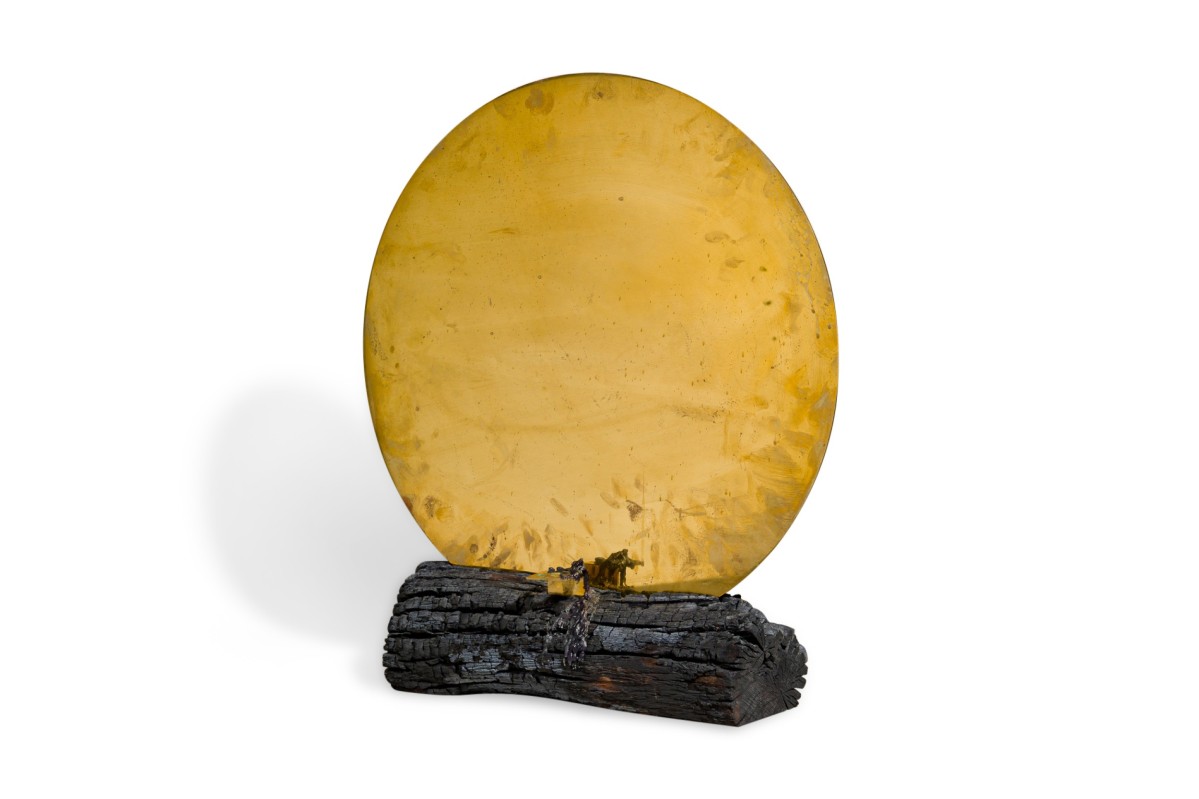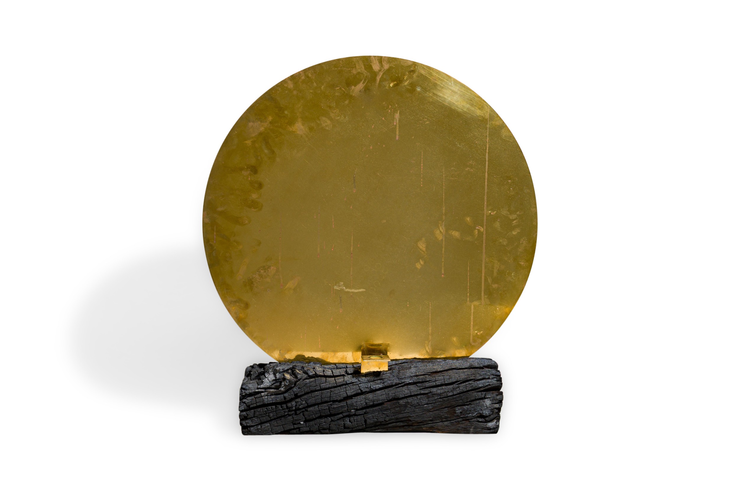Contemporary candle holder with a burned plum wood base featuring a brass candlestick juxtaposed with a polished brass mirror