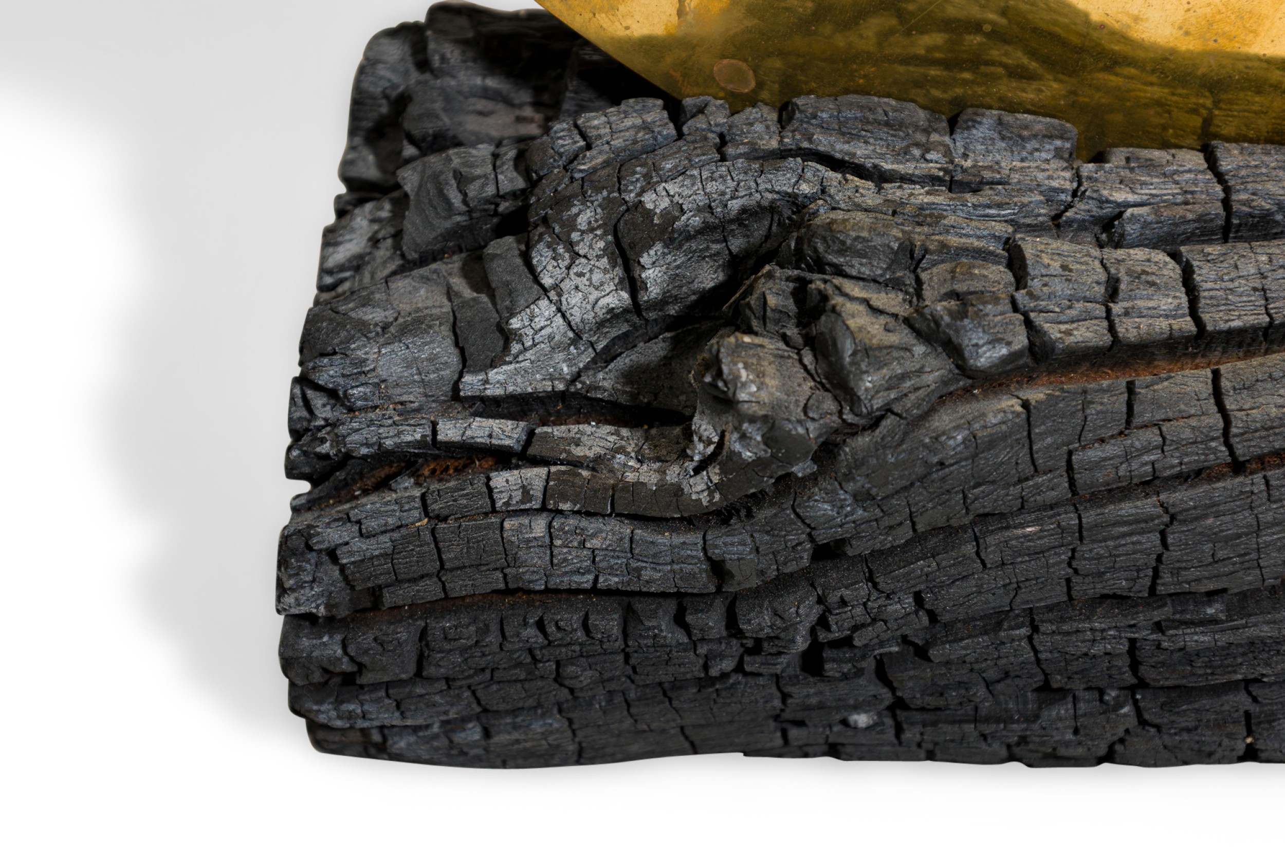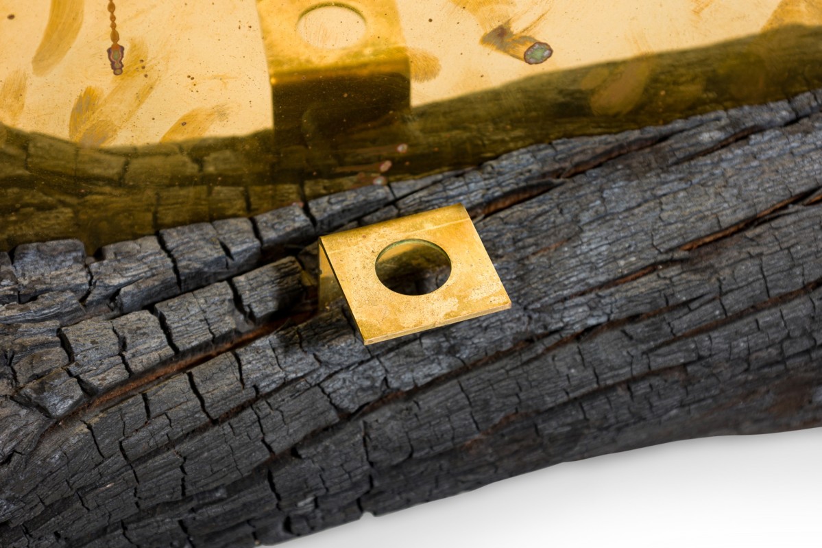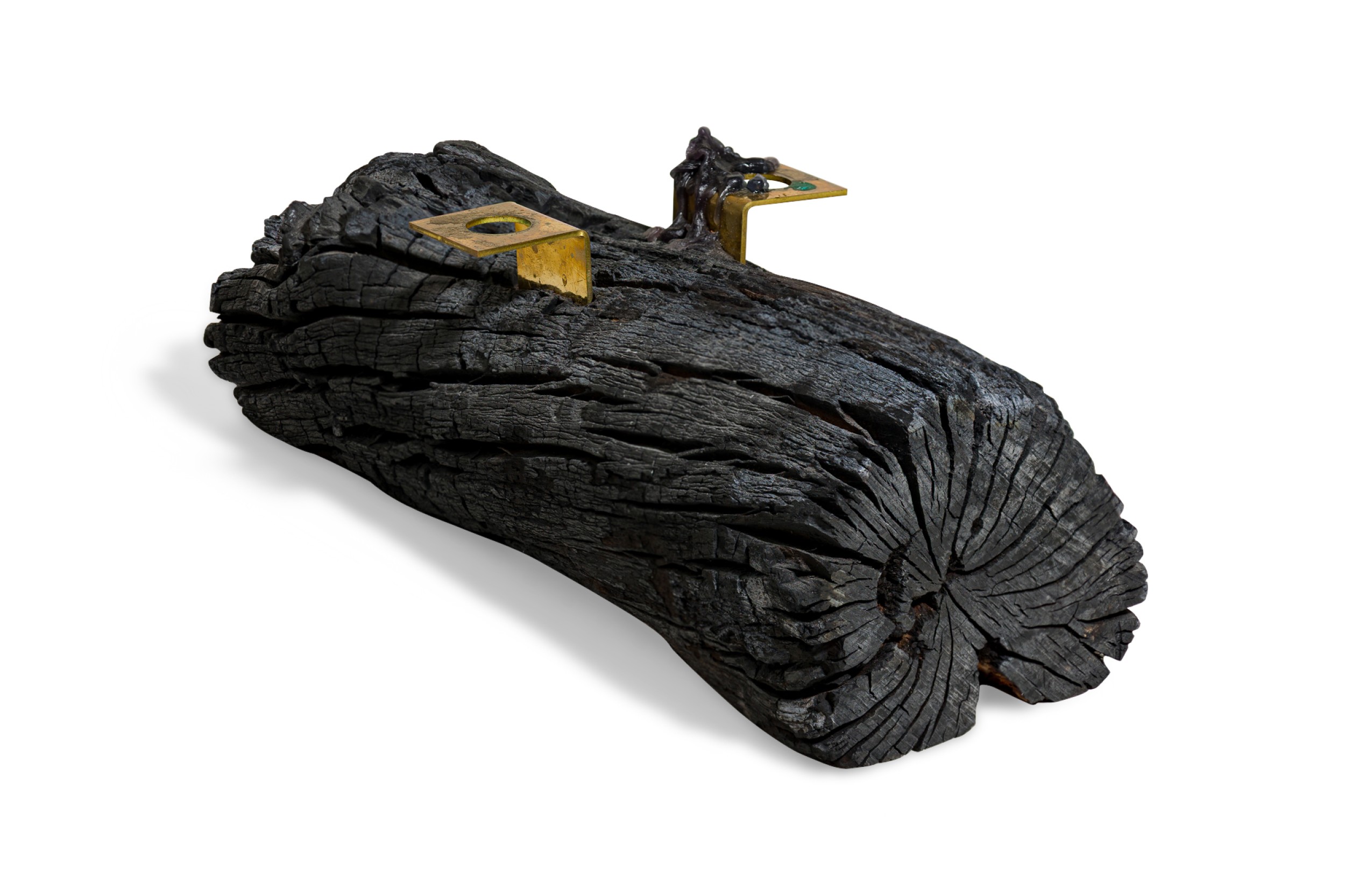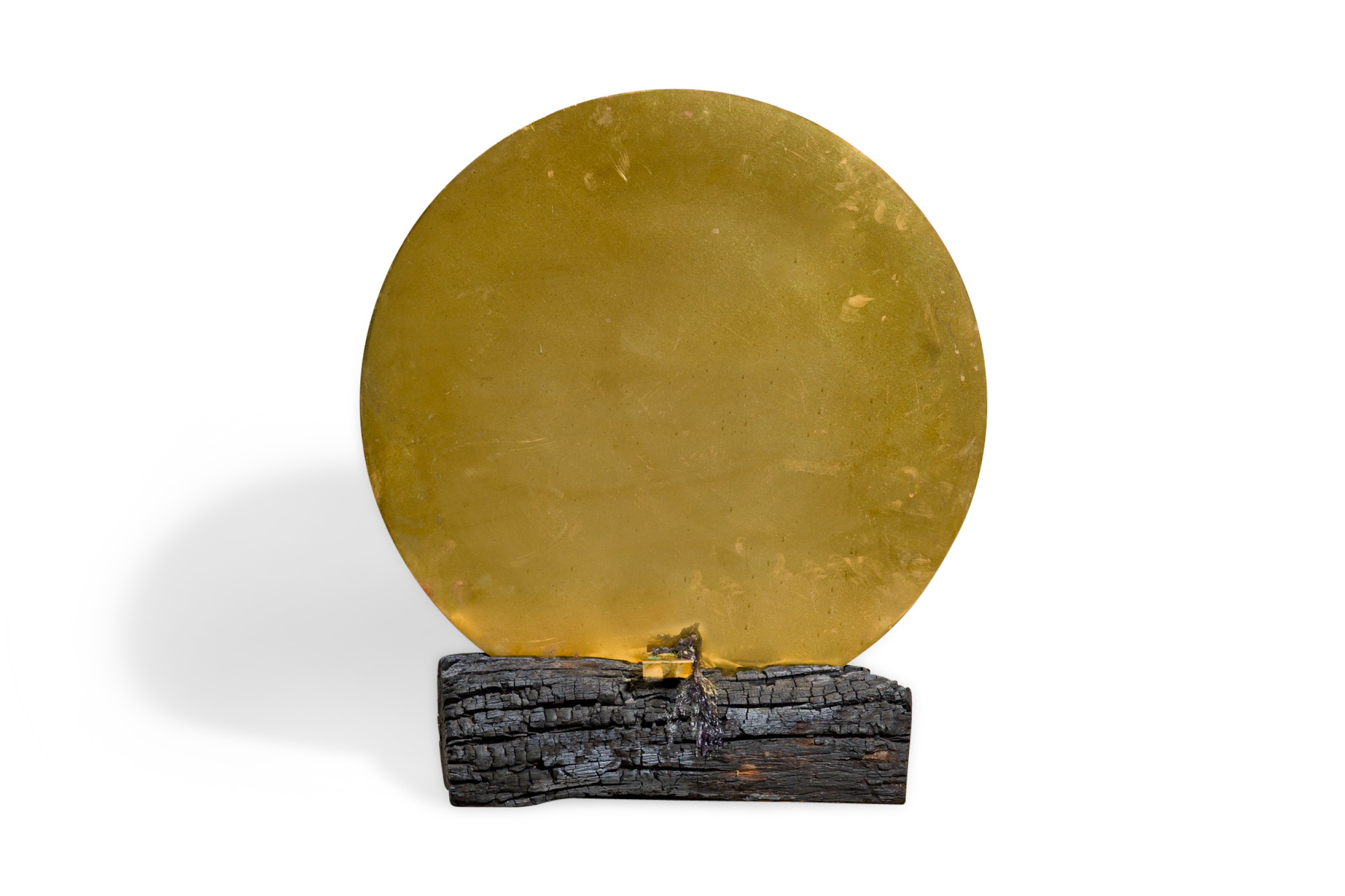 Contemporary candle holder with a burned plum wood base featuring a brass candlestick juxtaposed with a polished brass mirror