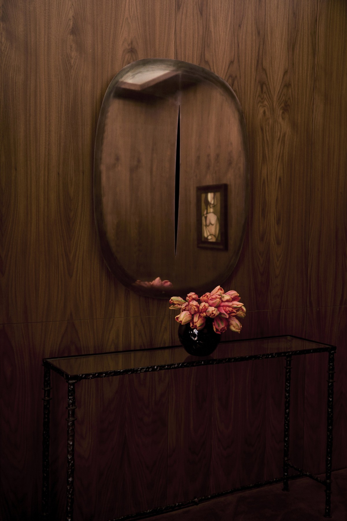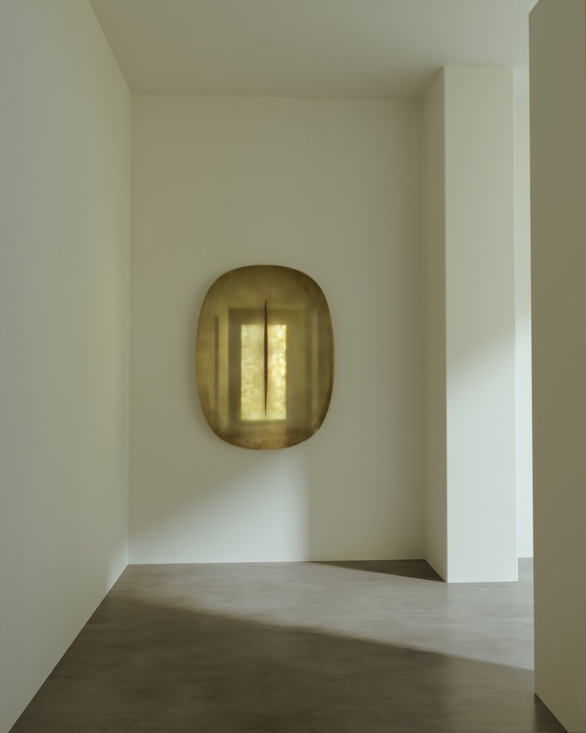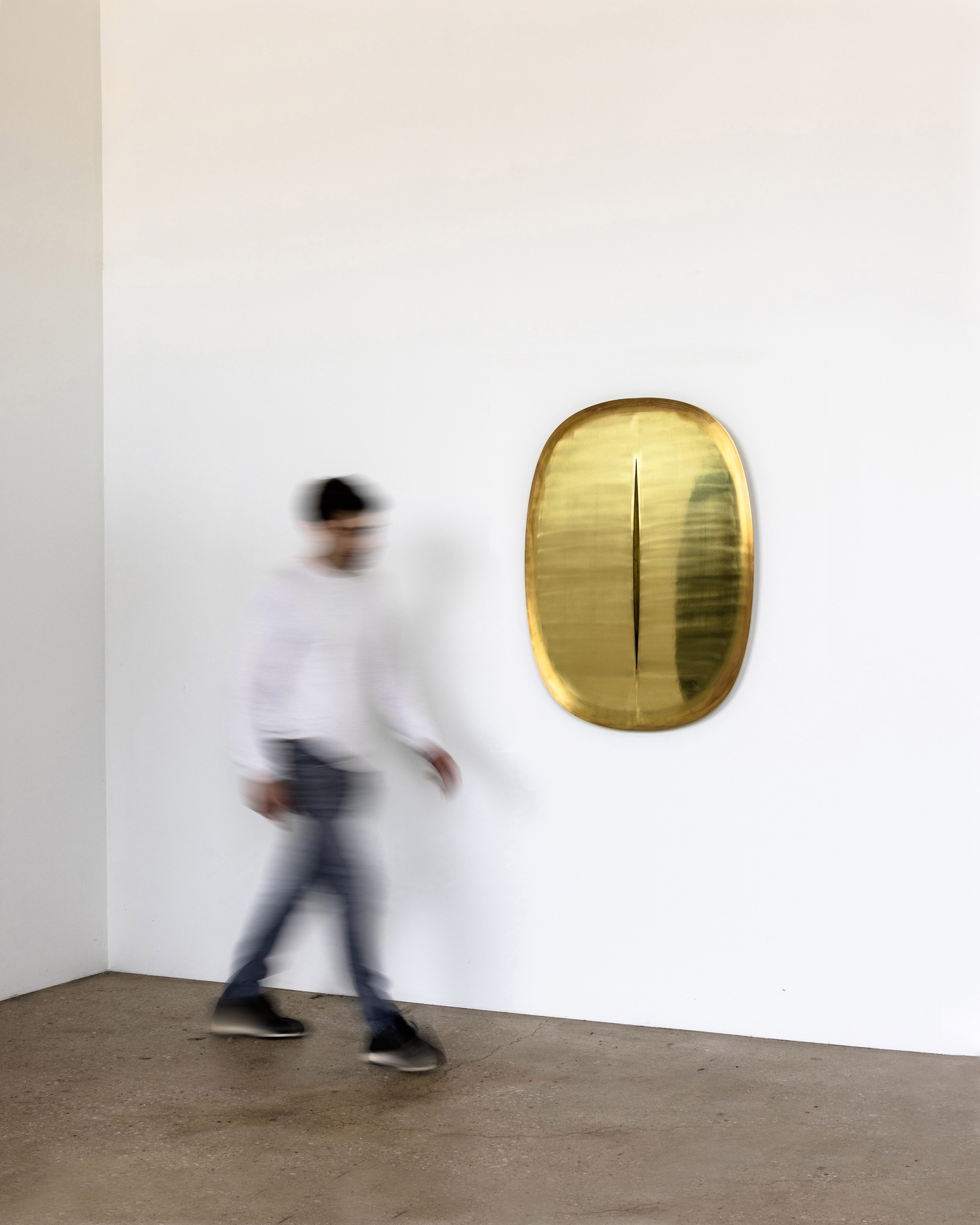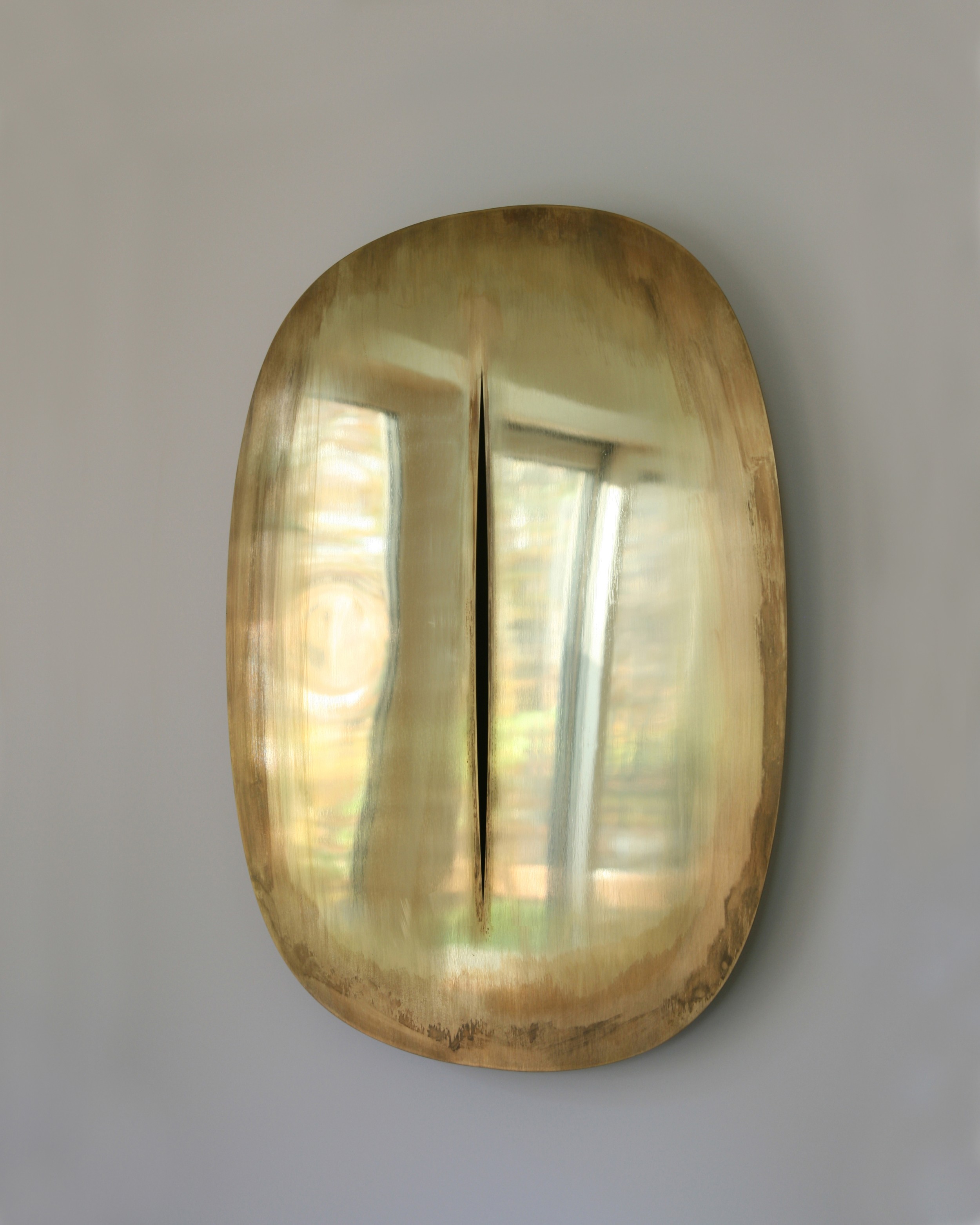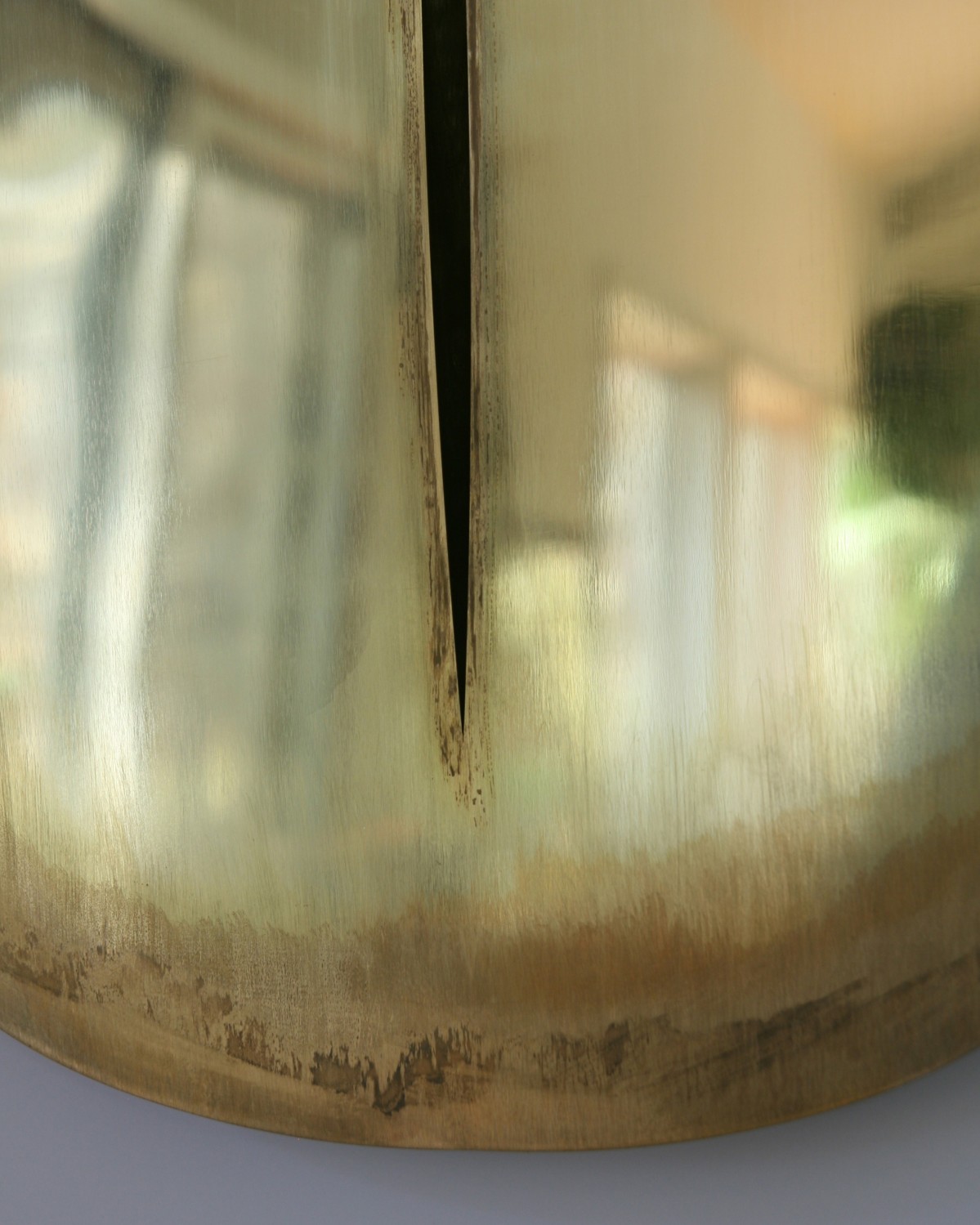 Contemporary mirror with a polished brass oval body with subtly distressed edges and a narrow slit in the middle
