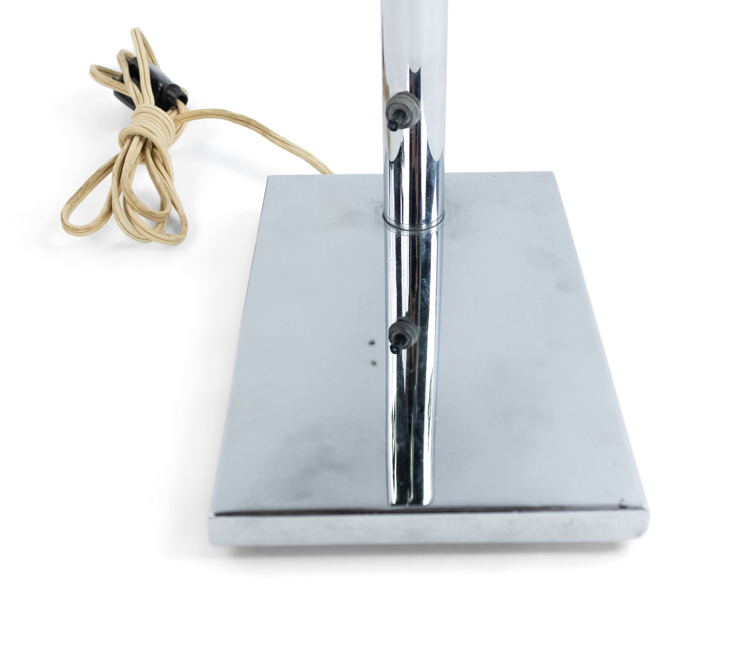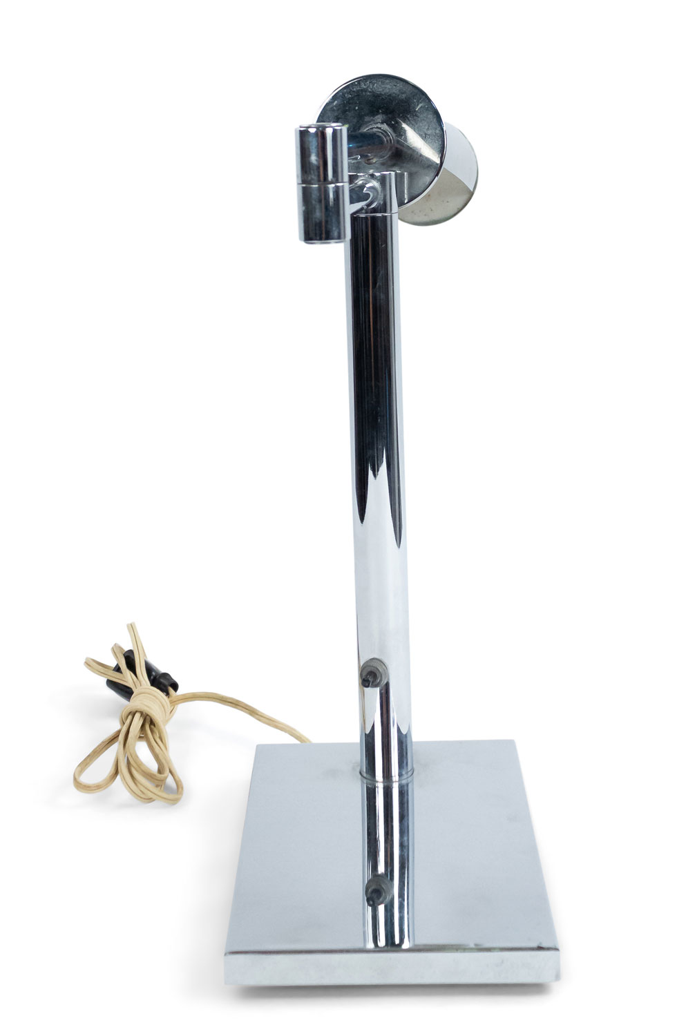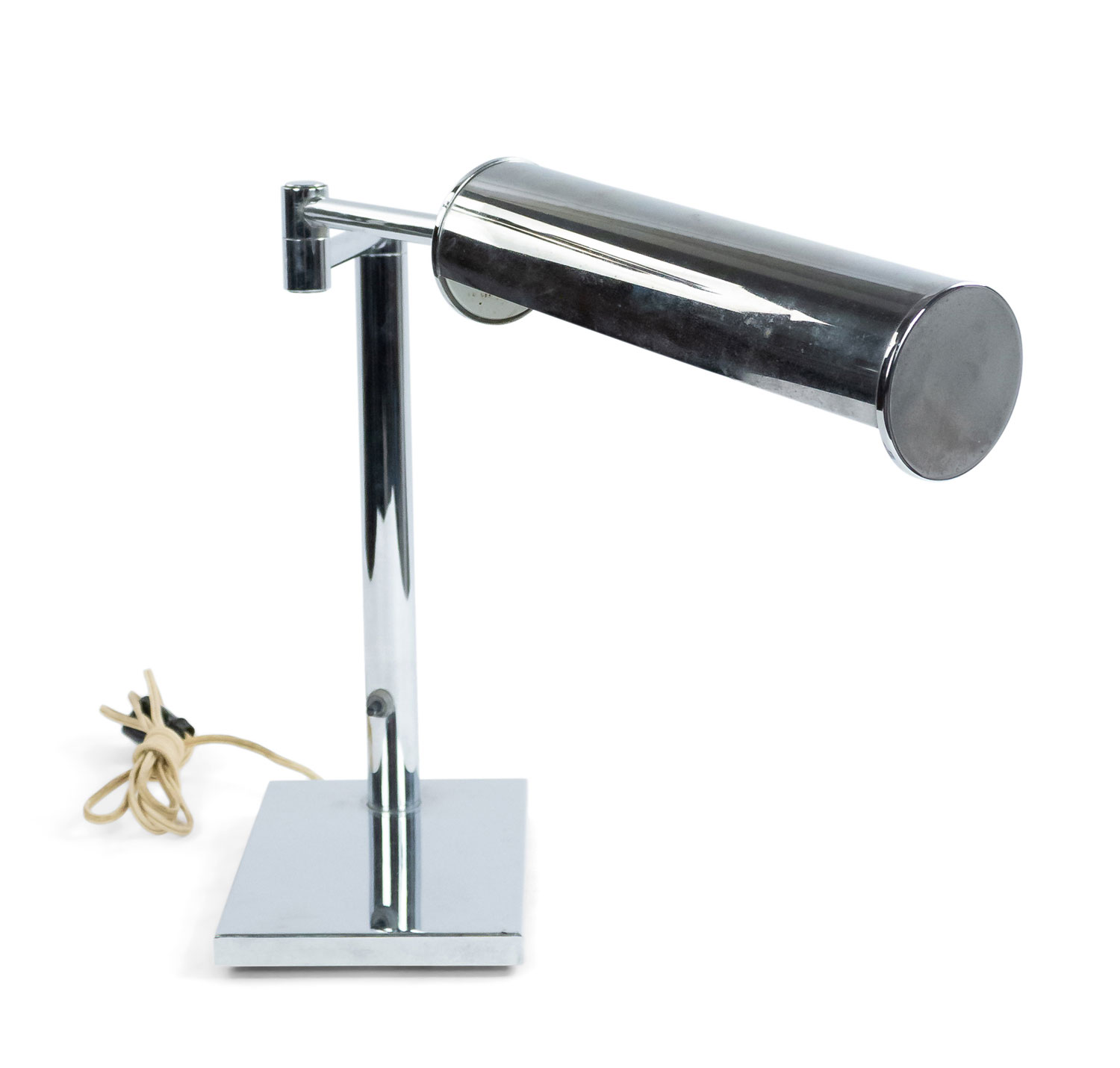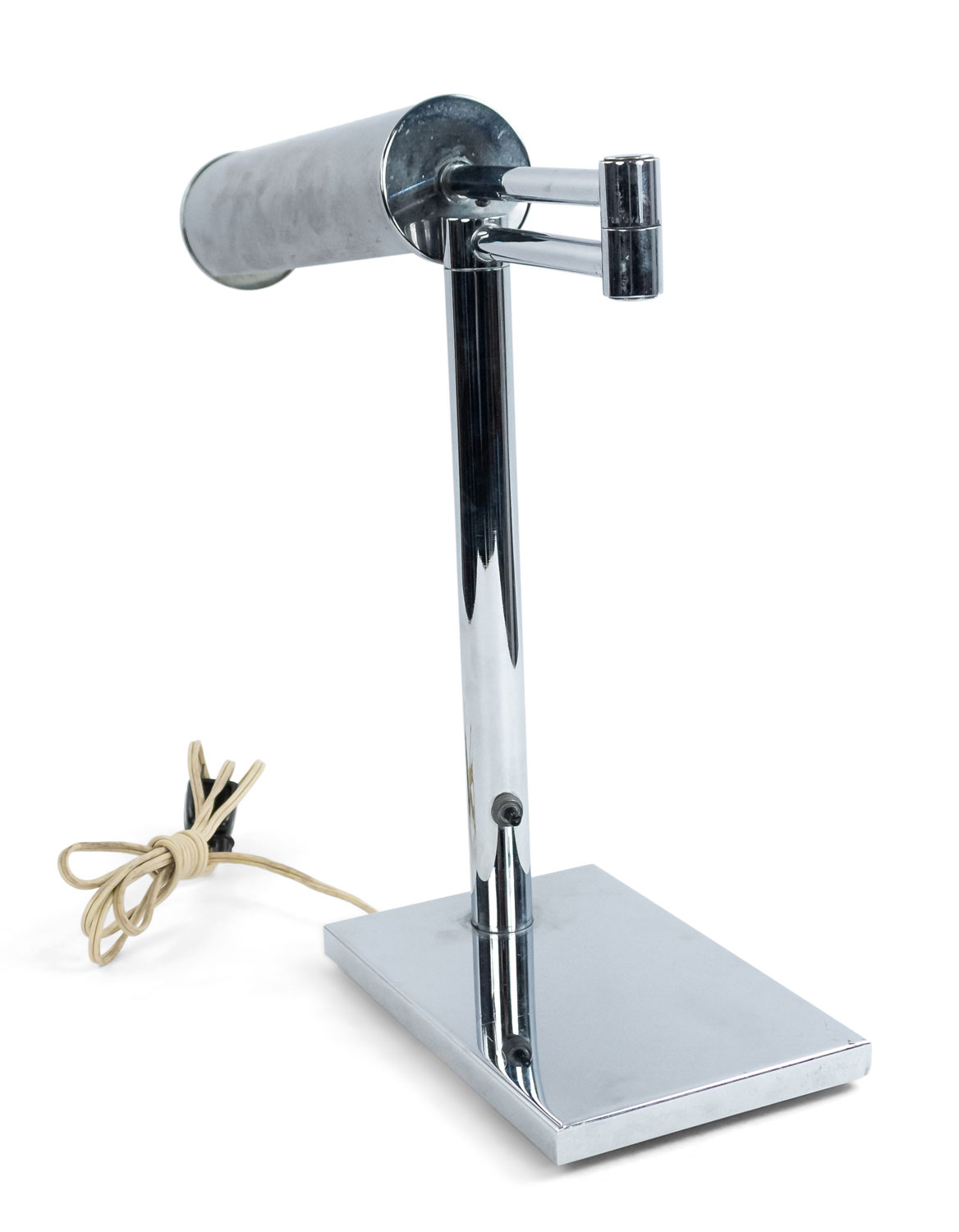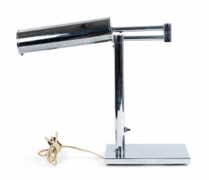 American Post-War Design chrome metal adjustable desk lamp with a rectangular base and tubular light