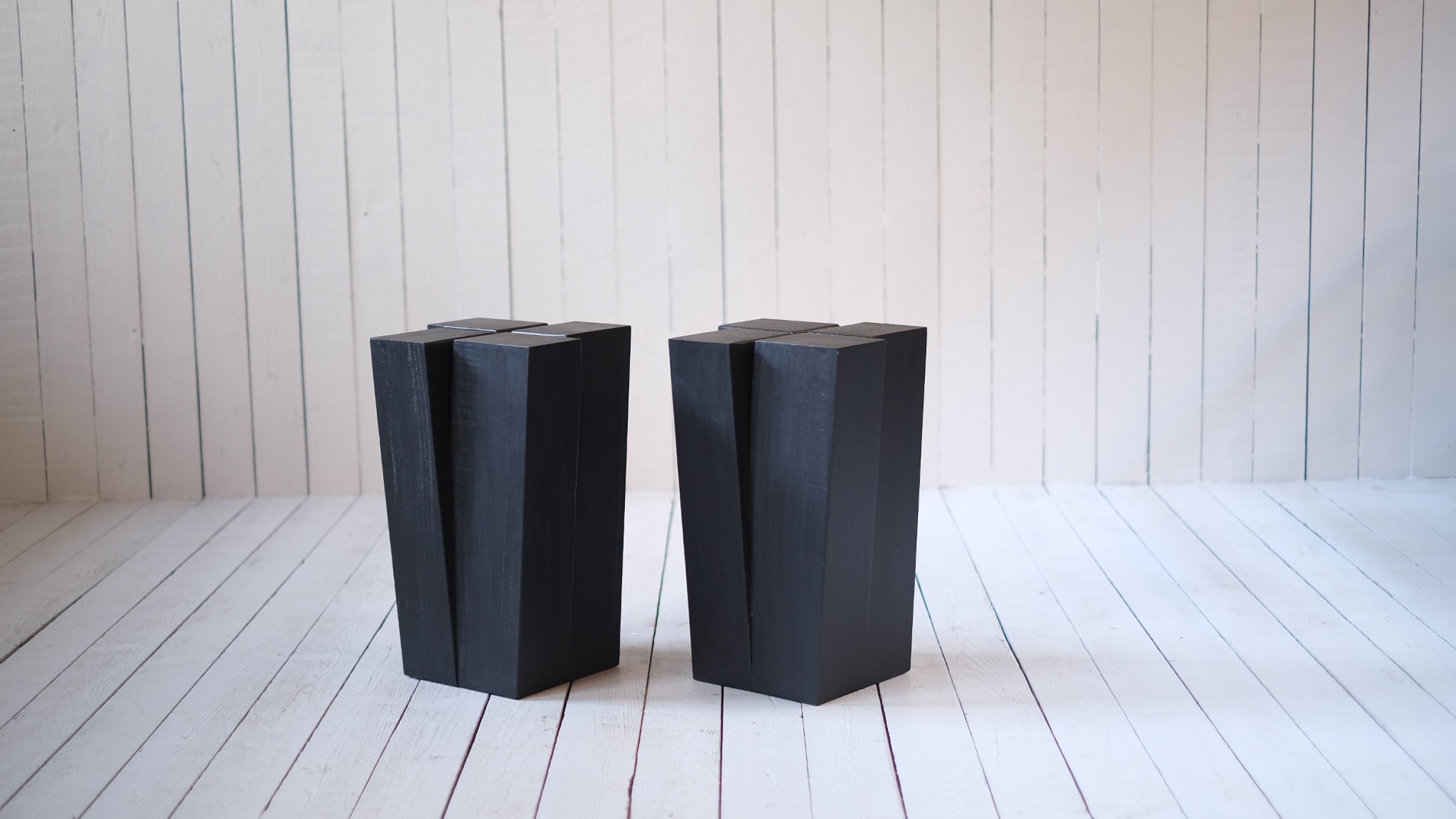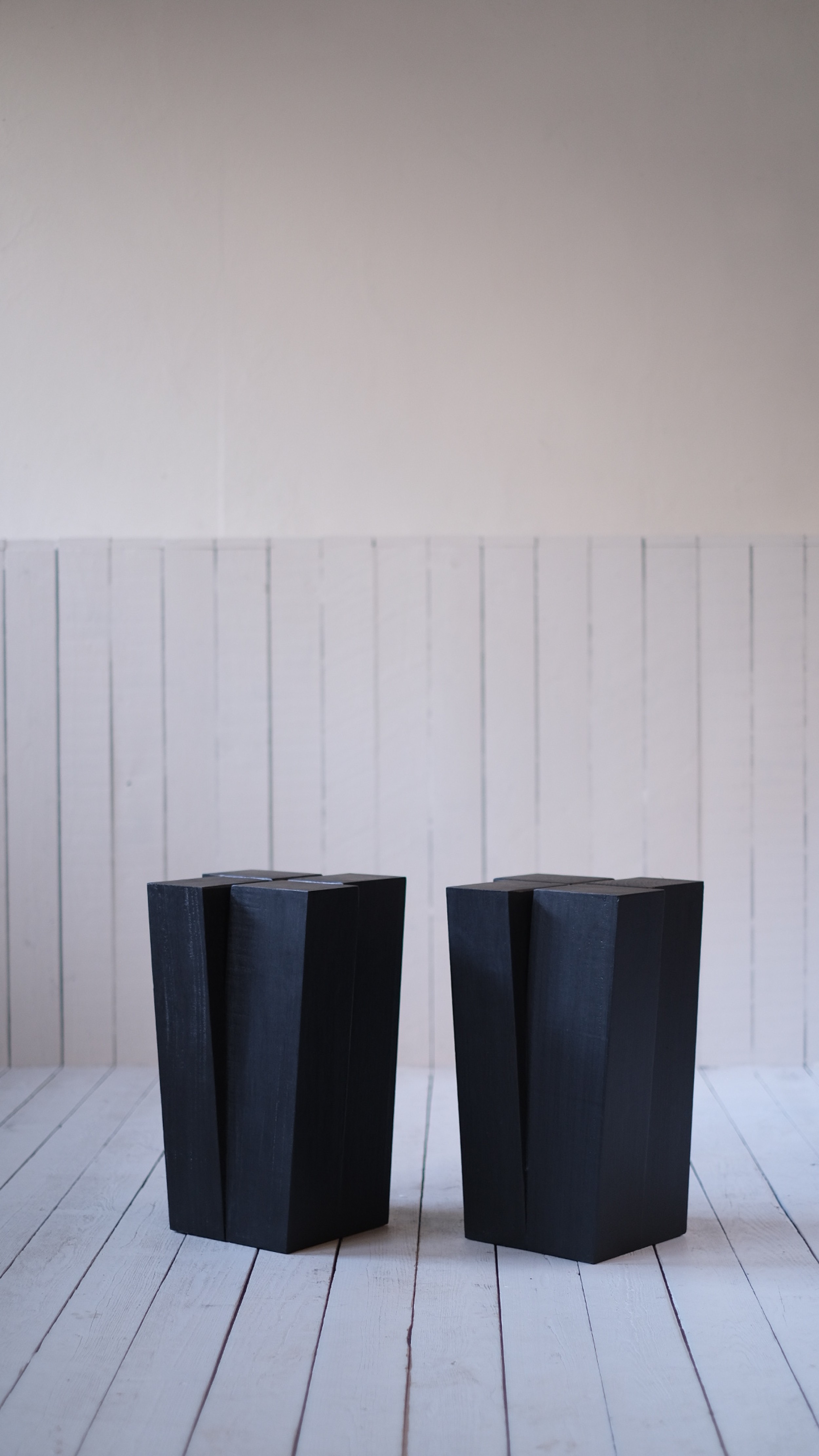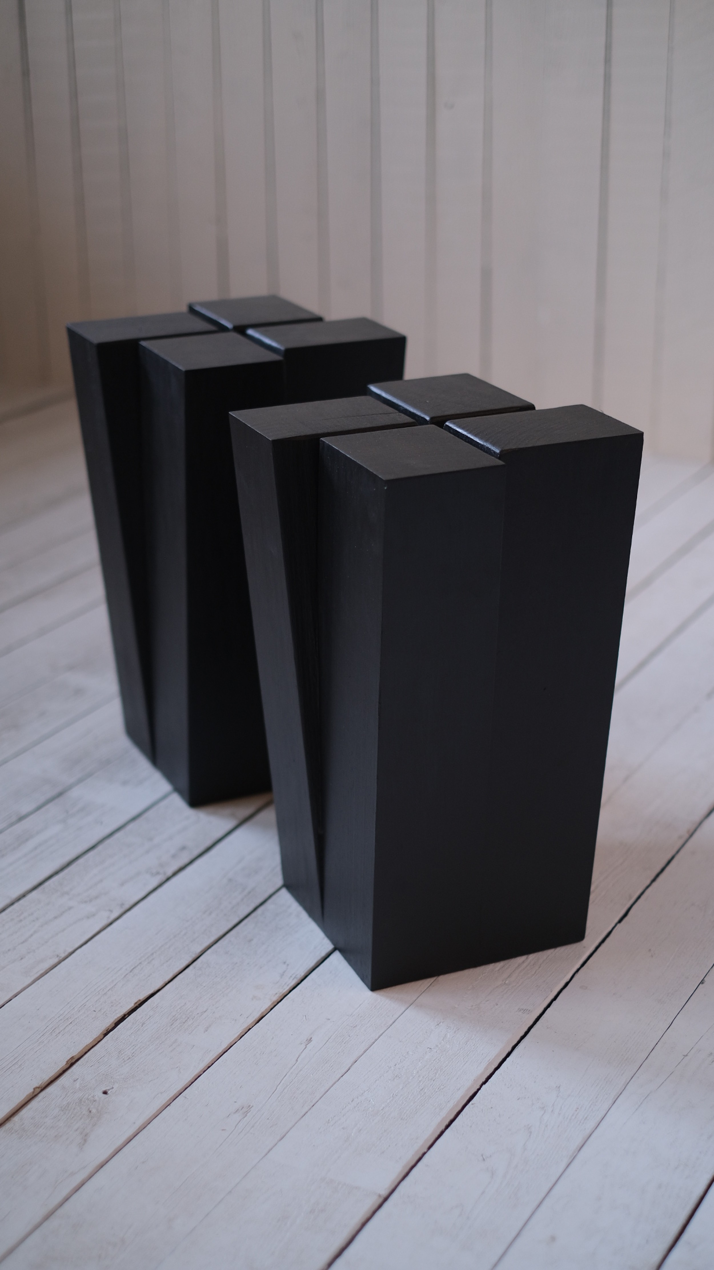 2 Contemporary four leg stools composed with clustered cuboid blocks of burned and waxed Iroko wood