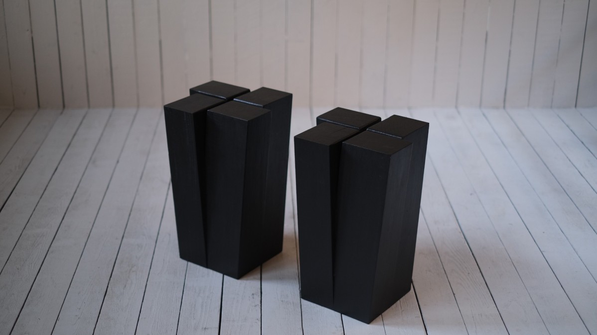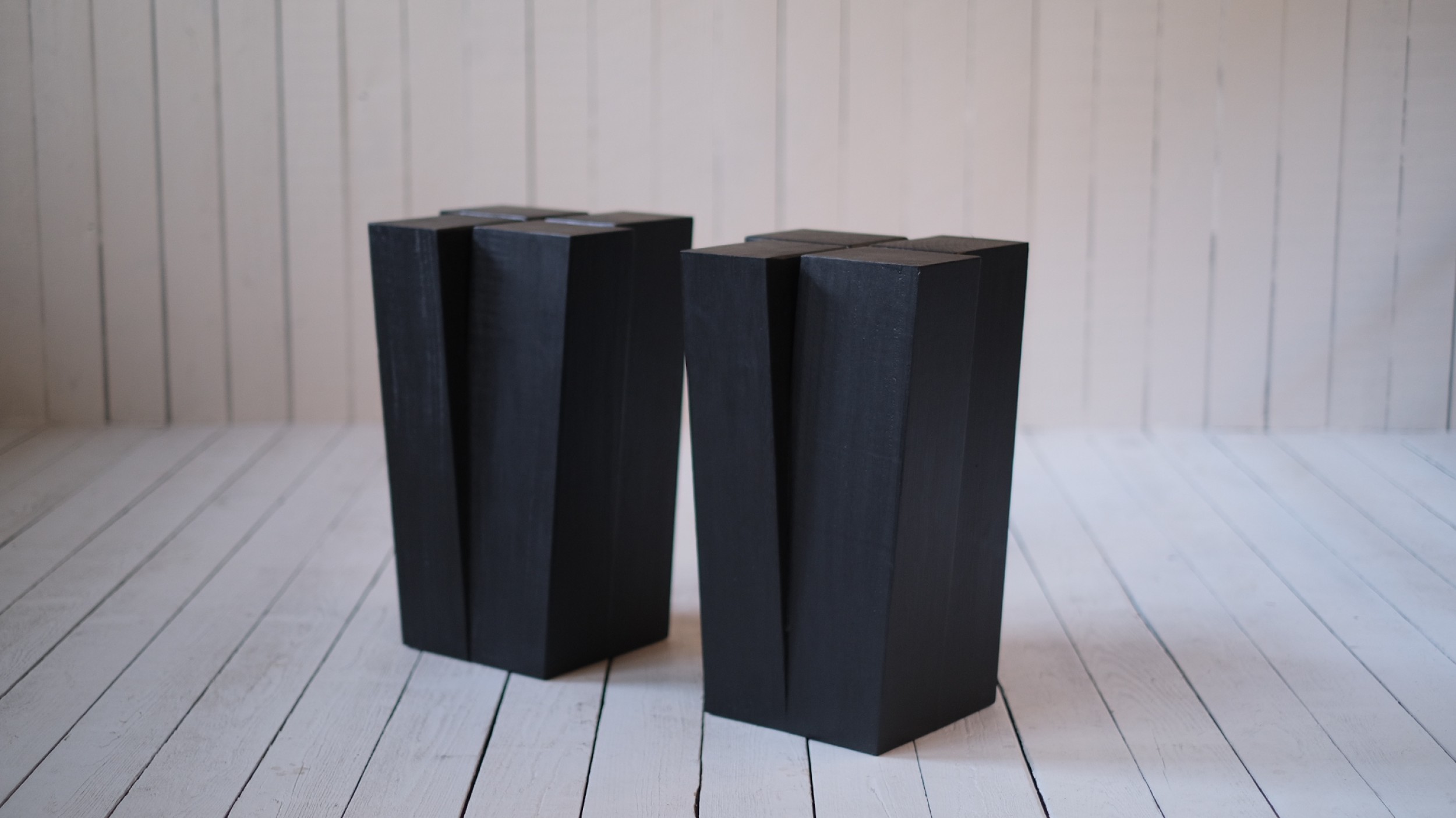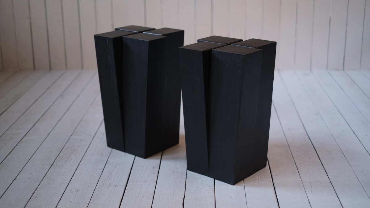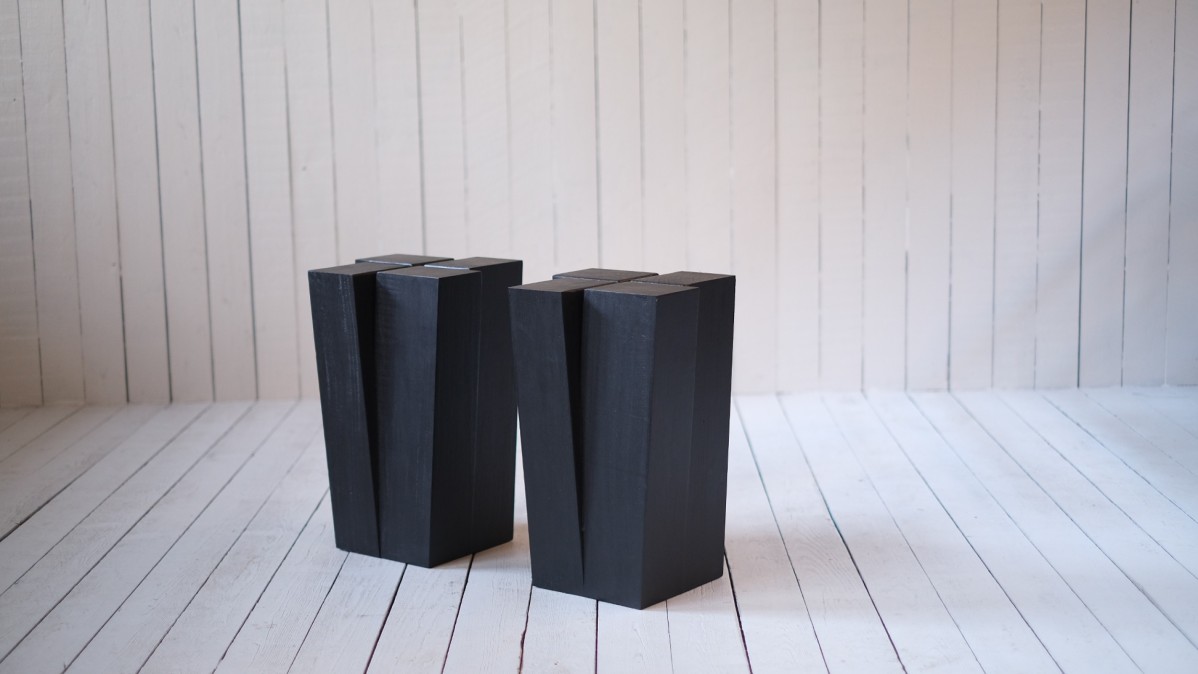 2 Contemporary four leg stools composed with clustered cuboid blocks of burned and waxed Iroko wood