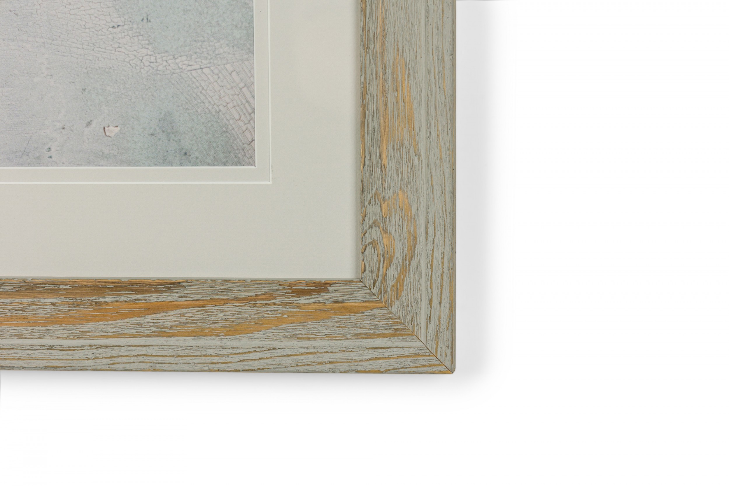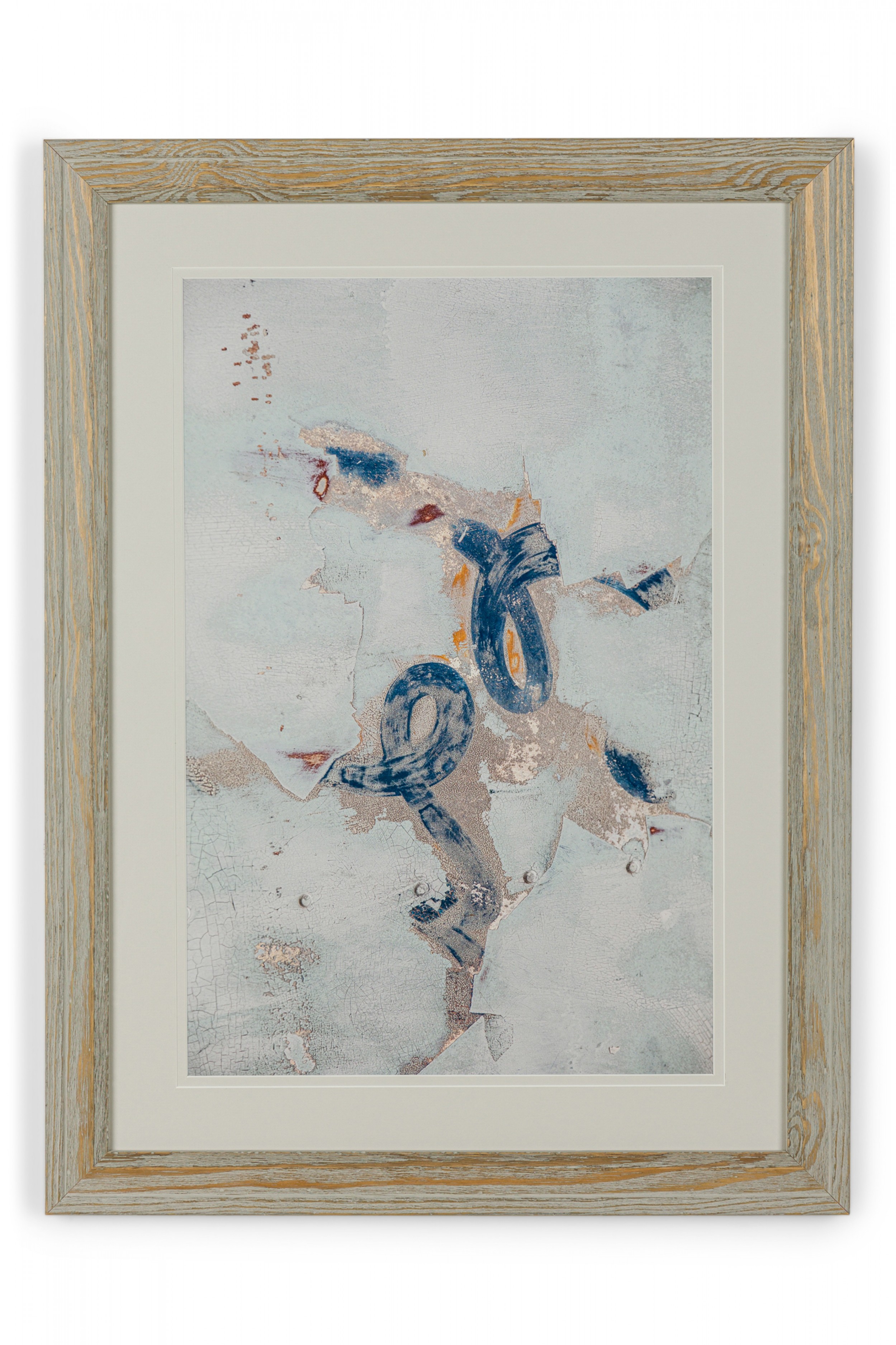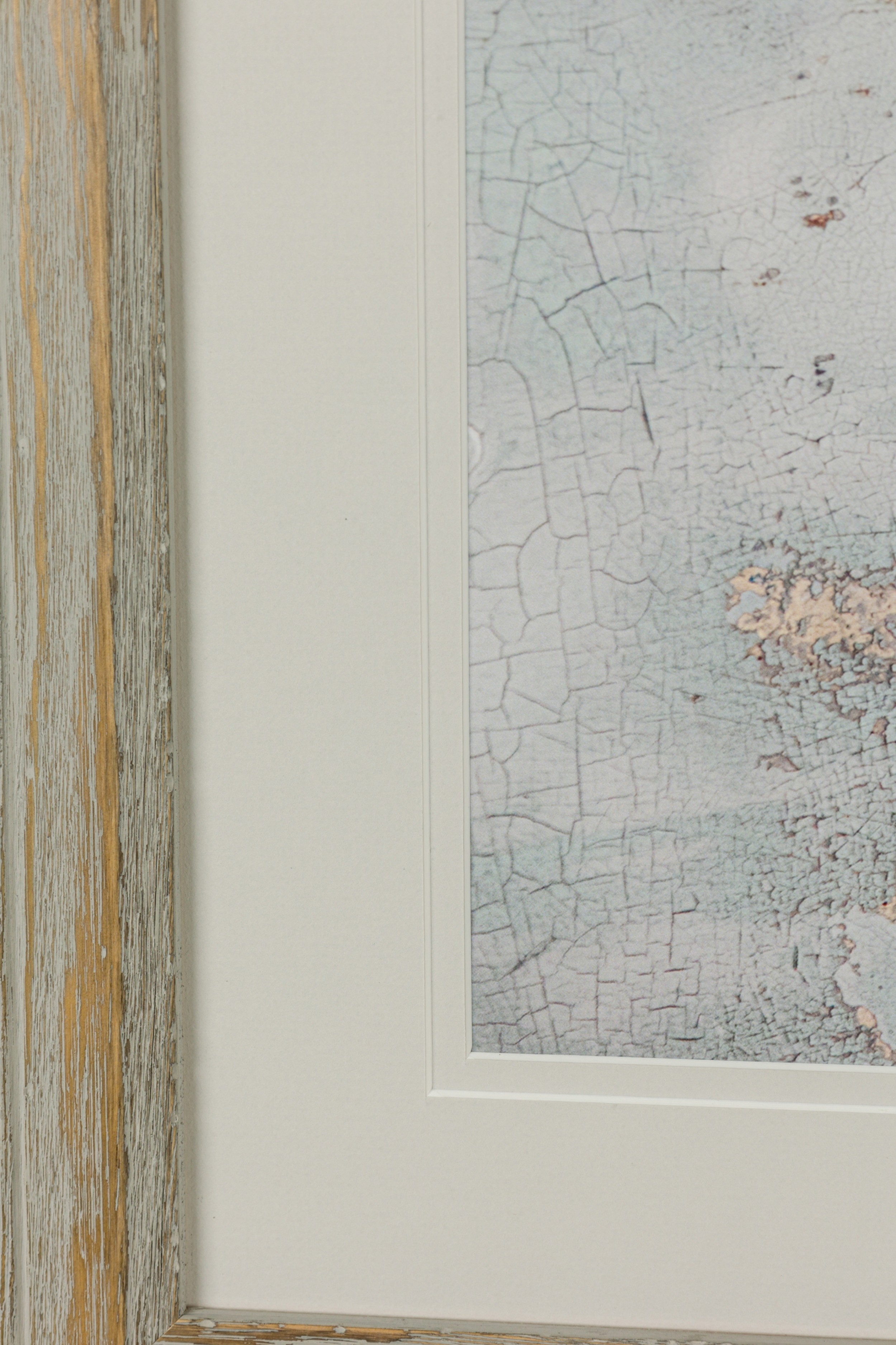 Contemporary American abstract photograph of a textured crumbling plaster surface with a faded painted loop design beneath in beige and blue, printed on paper in a rectangular weathered wood frame and beige double mat. (Companion piece: NWL695)
