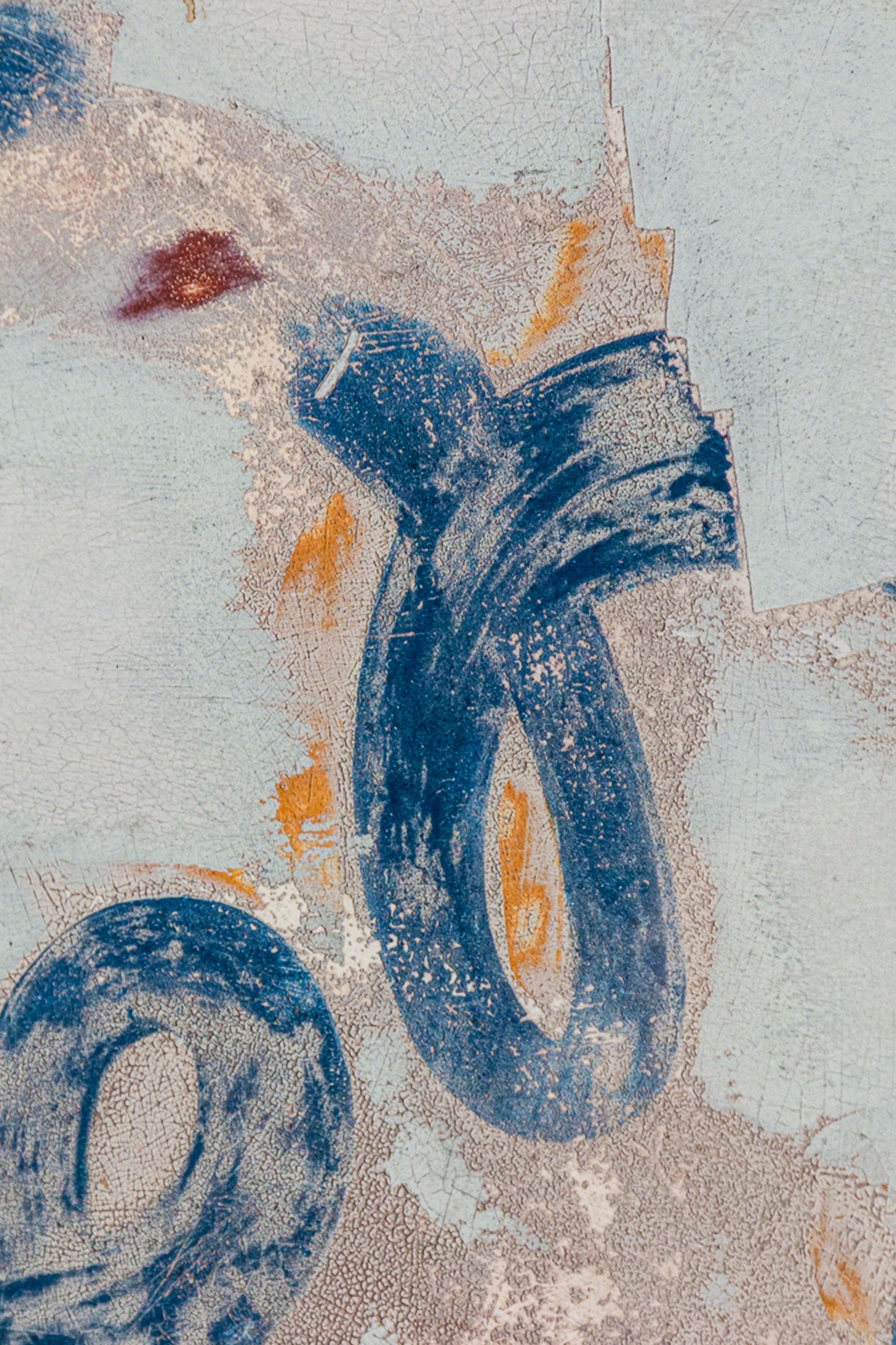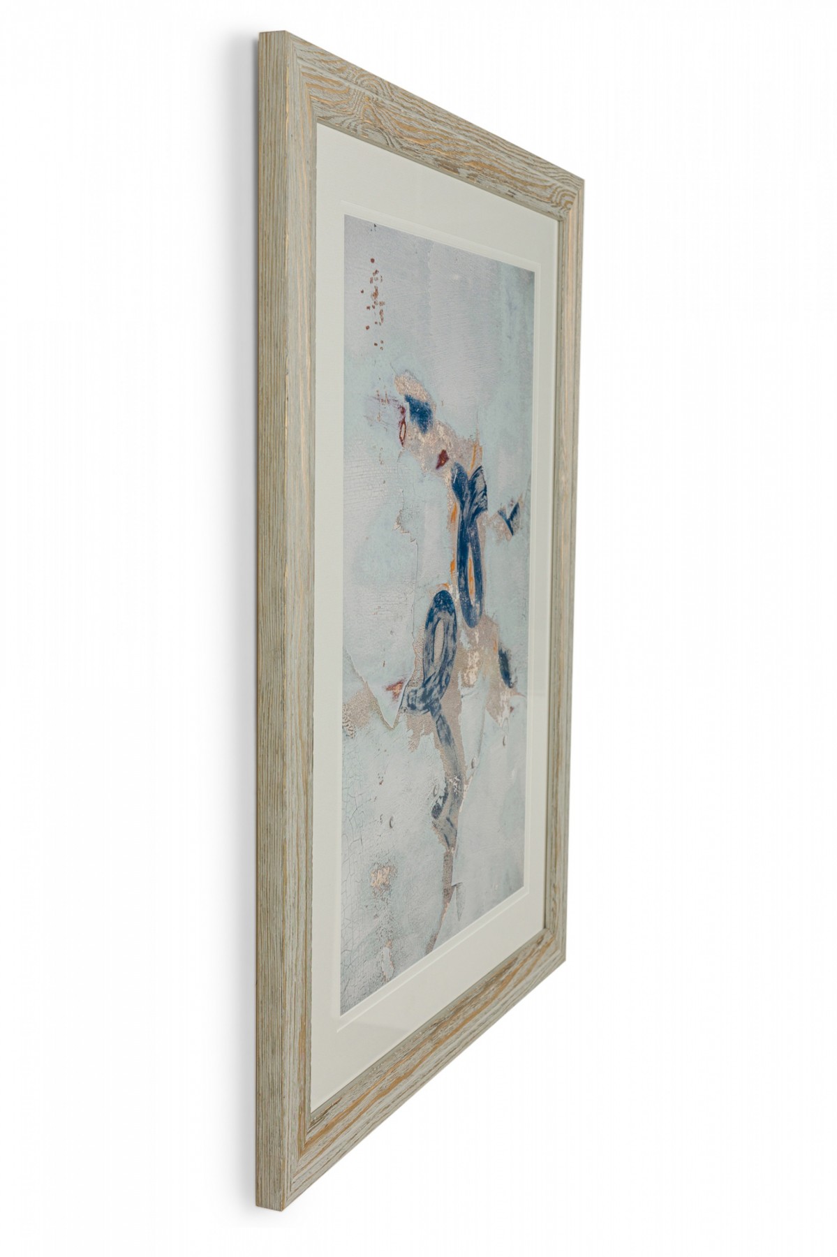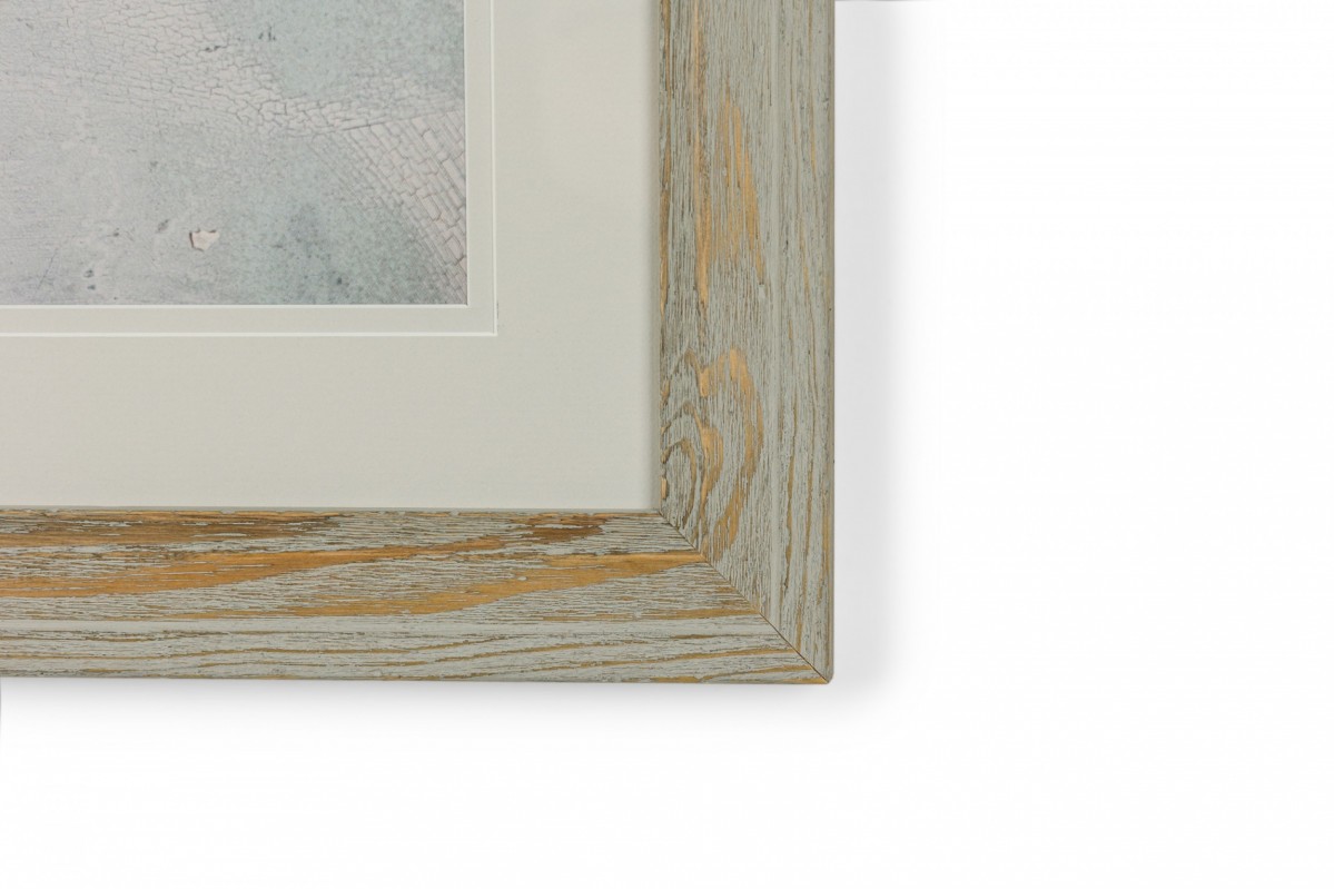 Contemporary American abstract photograph of a textured crumbling plaster surface with a faded painted loop design beneath in beige and blue, printed on paper in a rectangular weathered wood frame and beige double mat. (Companion piece: NWL695)
