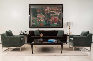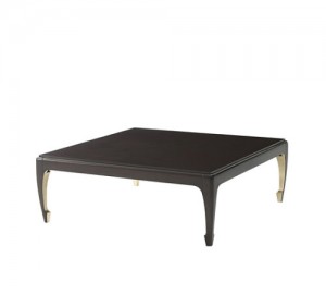 Contemporary coffee table with a ribbon mahogany veneered top and solid mahogany legs with hand-leafed 18K gold interior finishing. (Matching items: 061226)