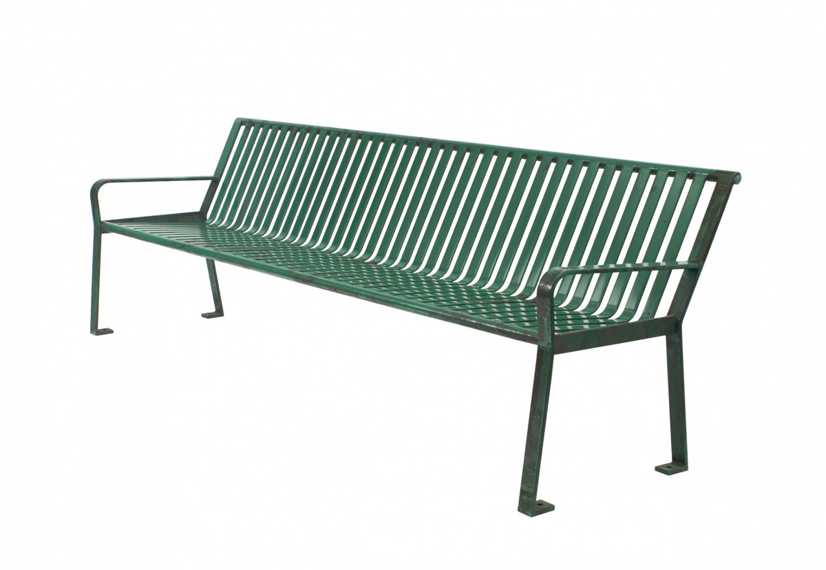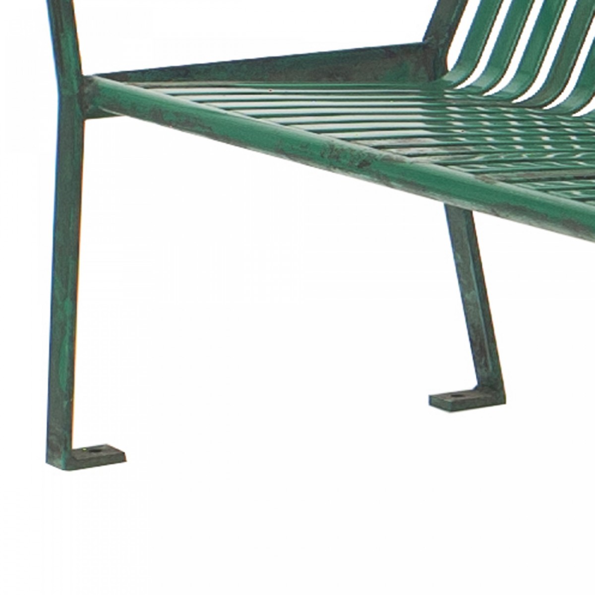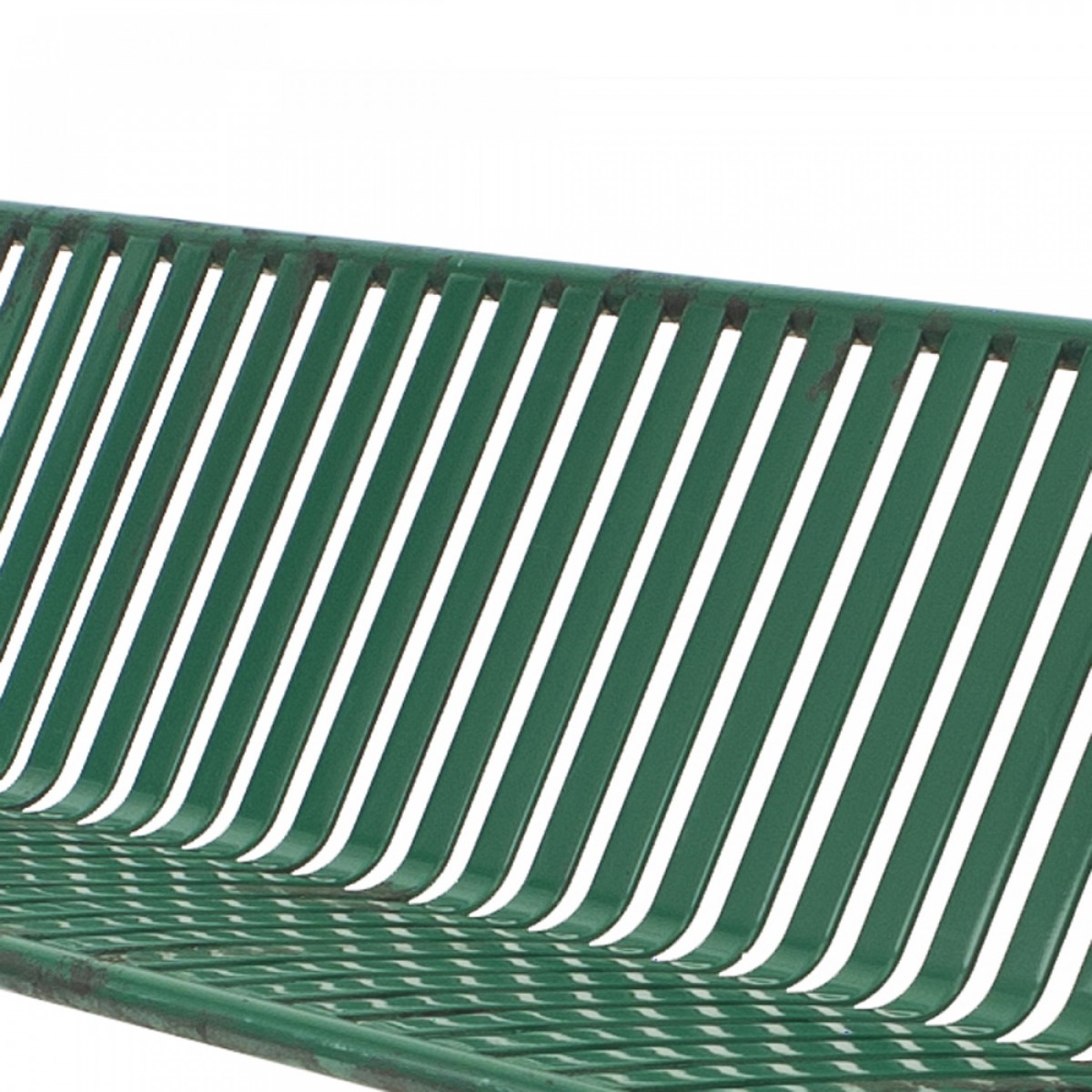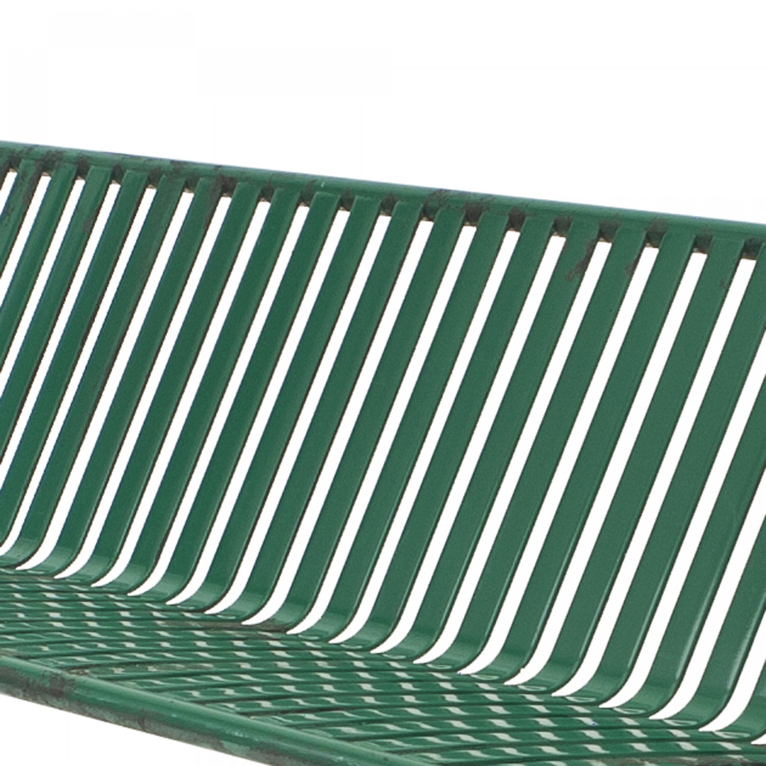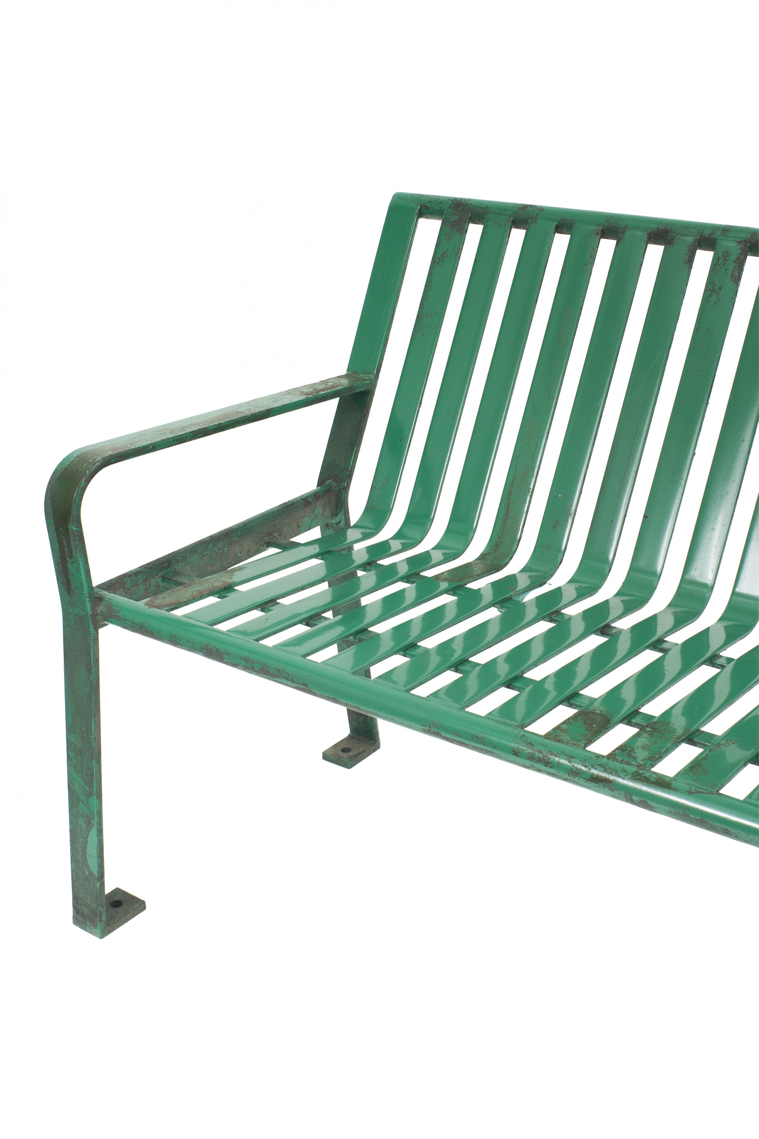 2 Contemporary green painted metal train platform / park outdoor benches with slat backs and seats (PRICED EACH)