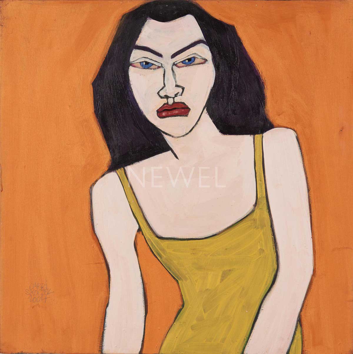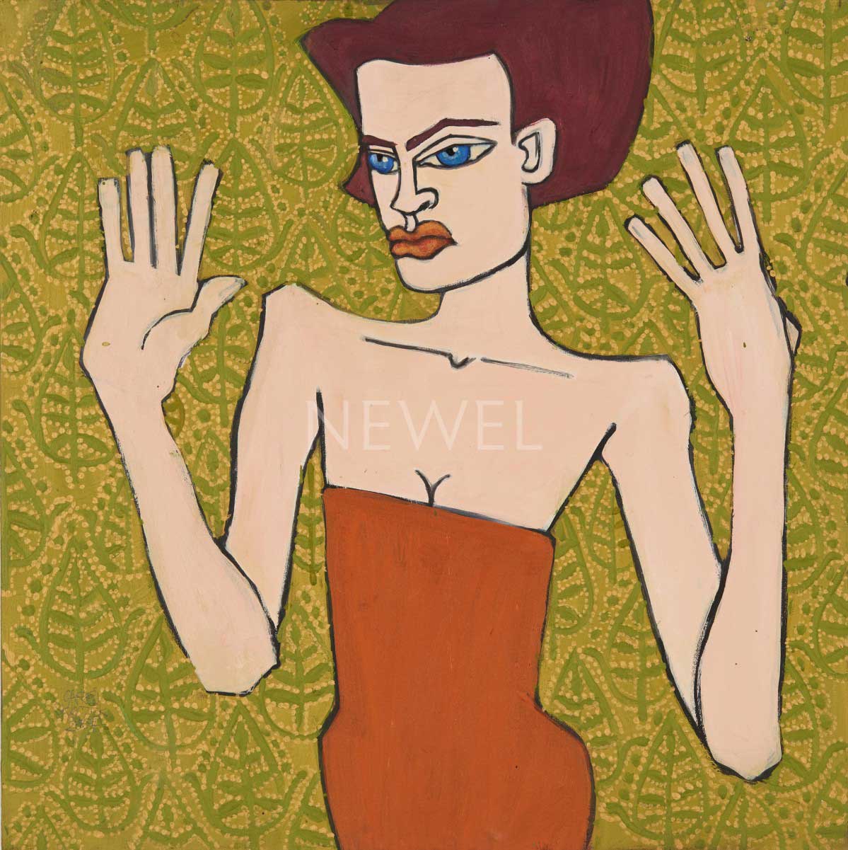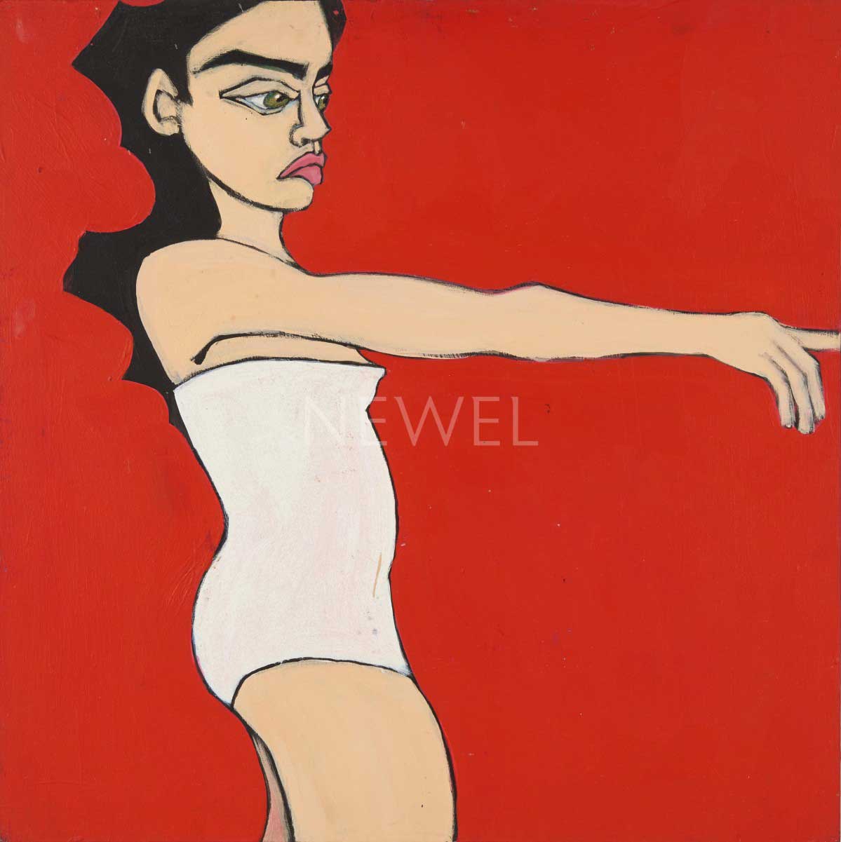 Contemporary painted portrait of a woman on a red background titled, "It's Your Fault" on a square wooden canvas (Companion pieces: AAP146, AAP147, AAP148)