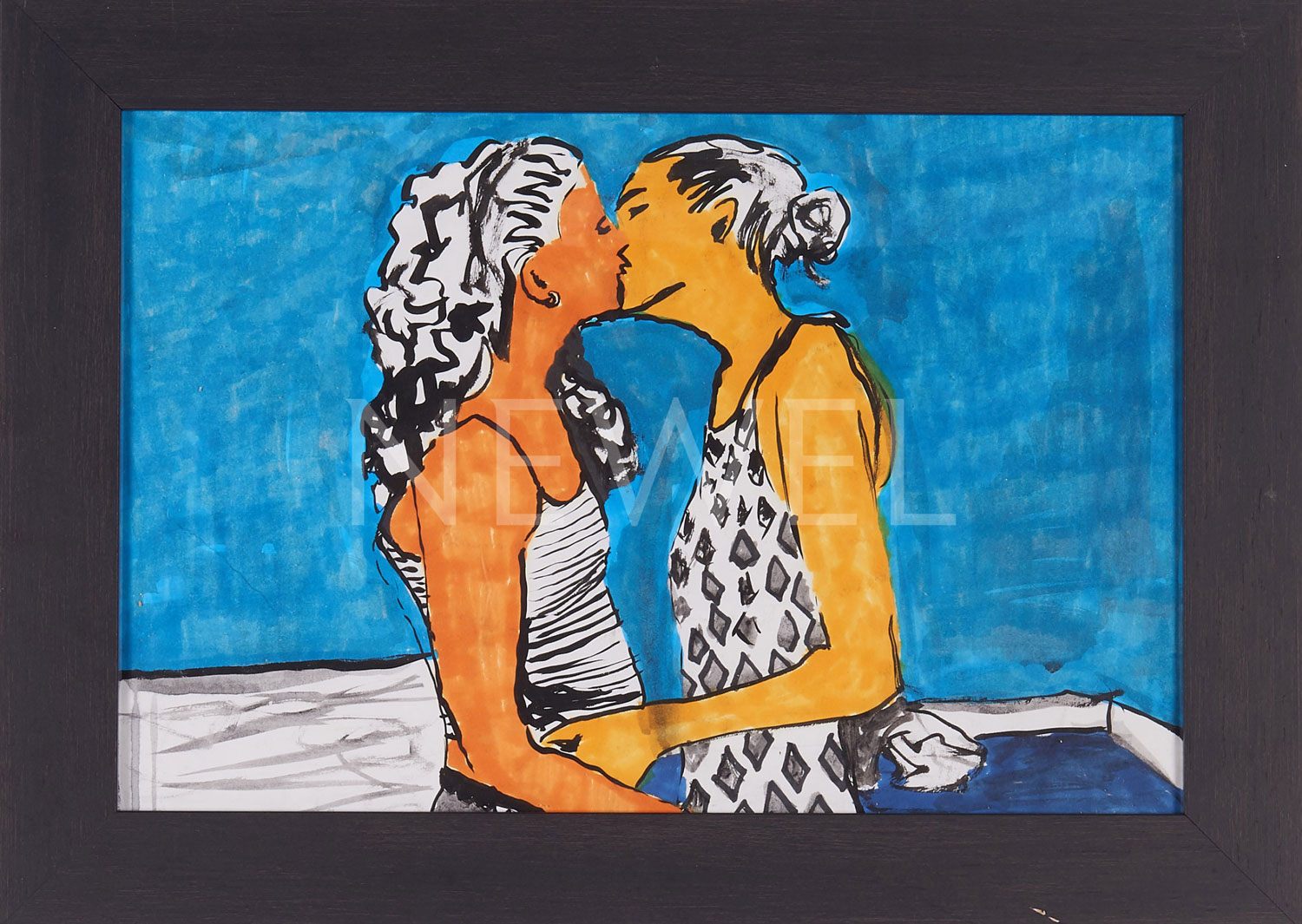 Contemporary marker drawing of two women kissing on a blue background in a rectangular black frame titled "Ladies"
