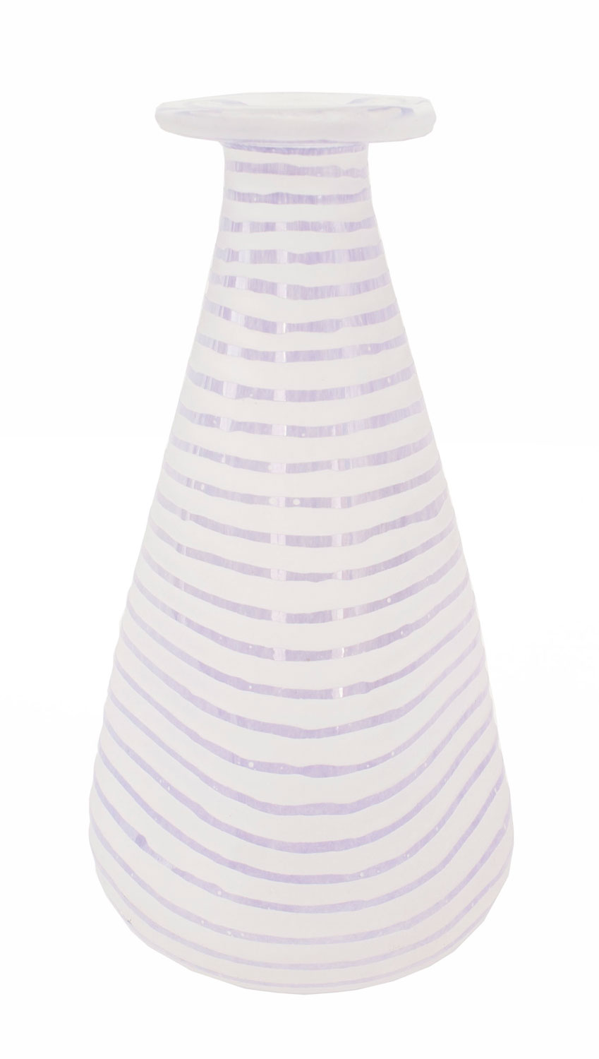 Contemporary art glass vase with a triangular base and a lavender and frosted white stripe design