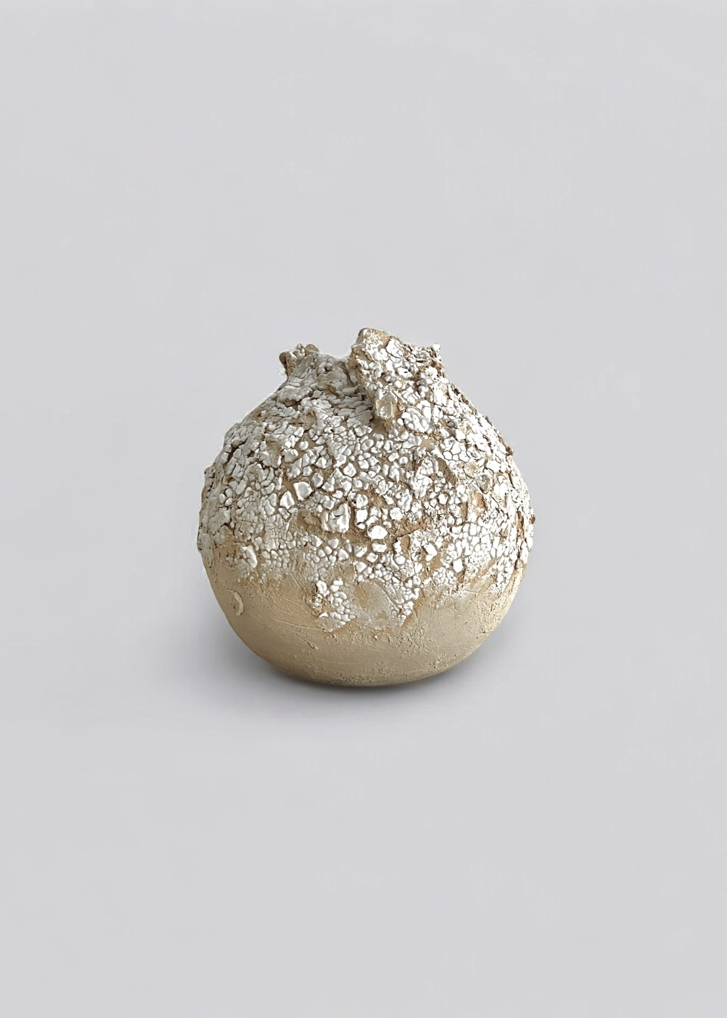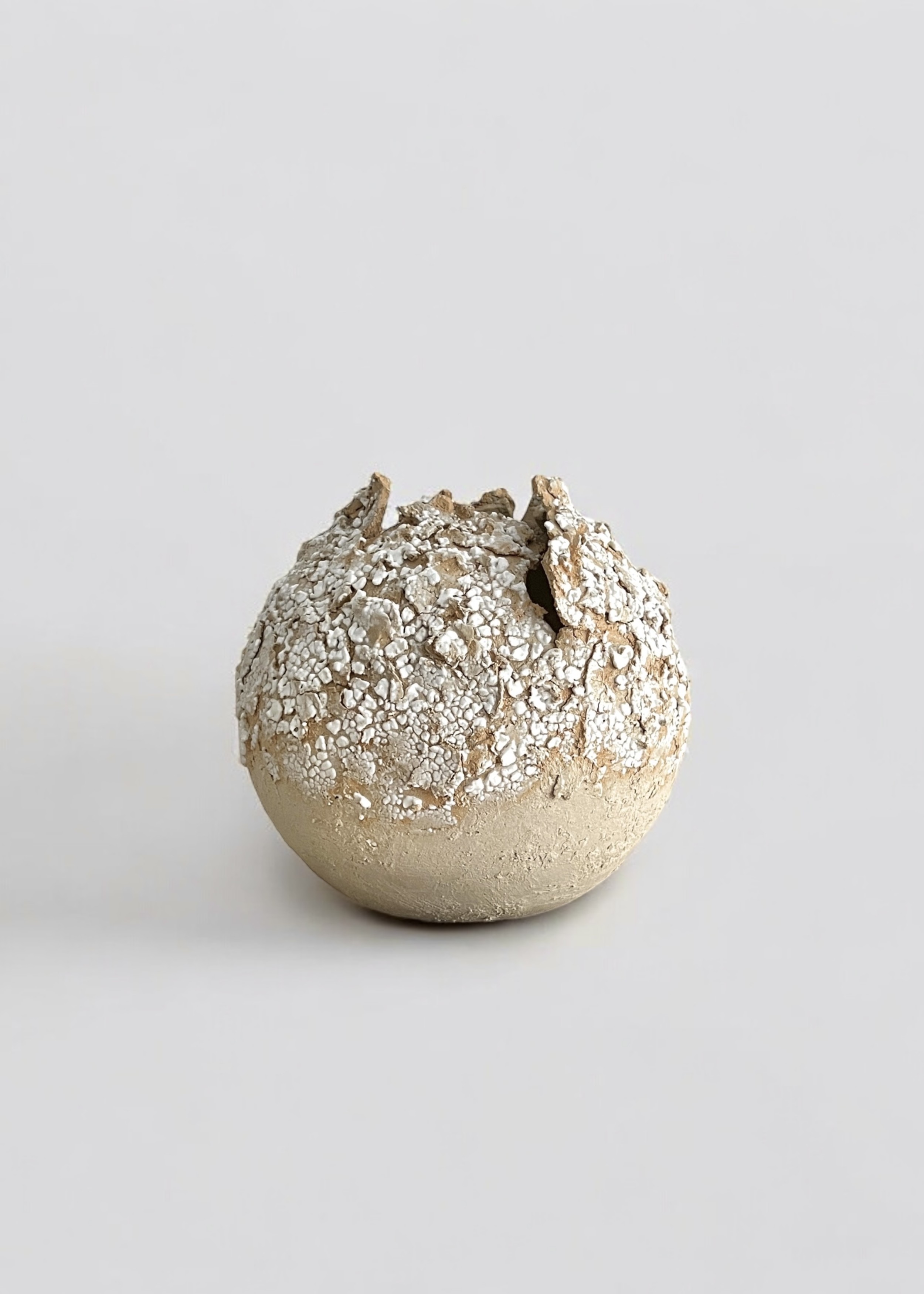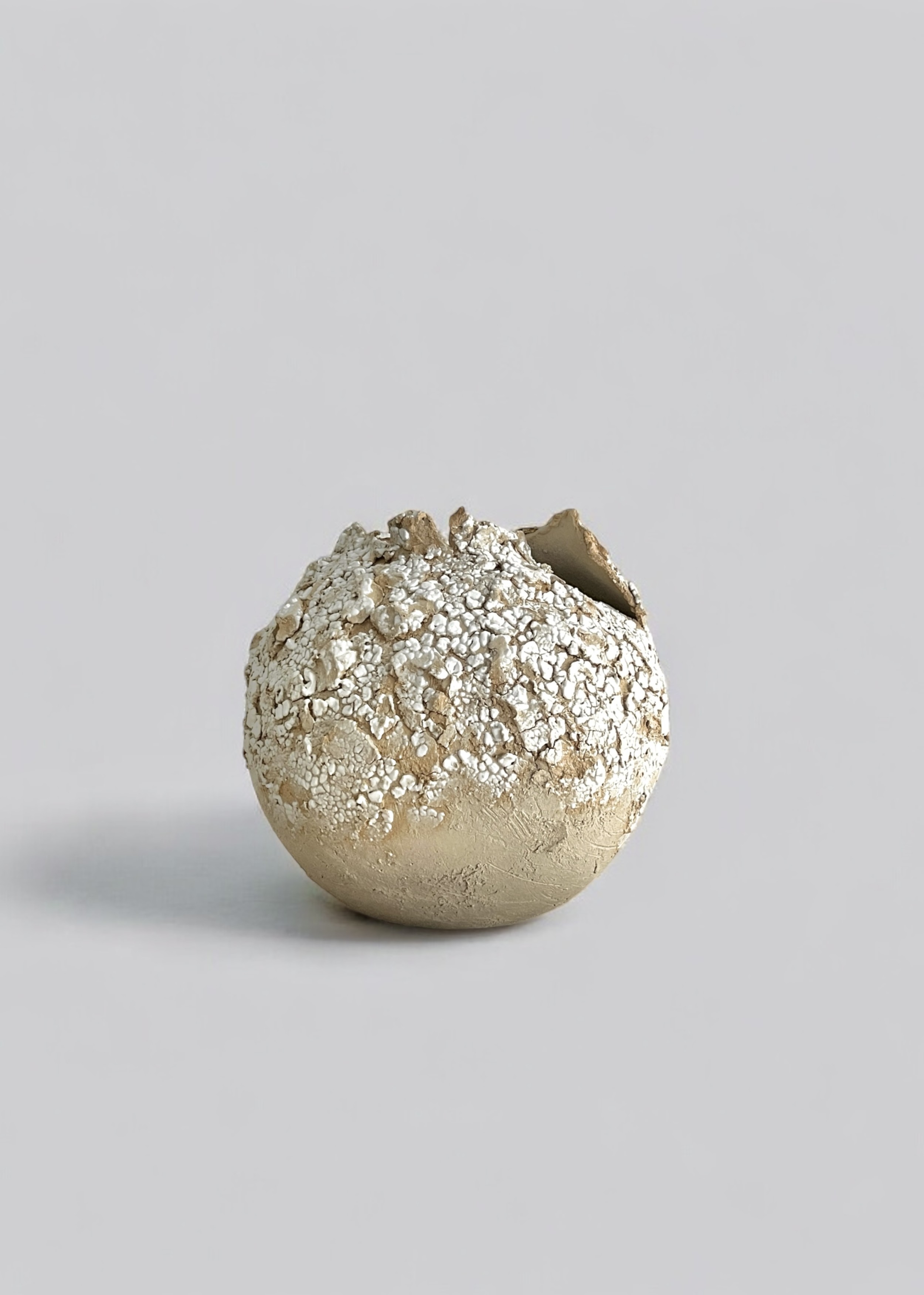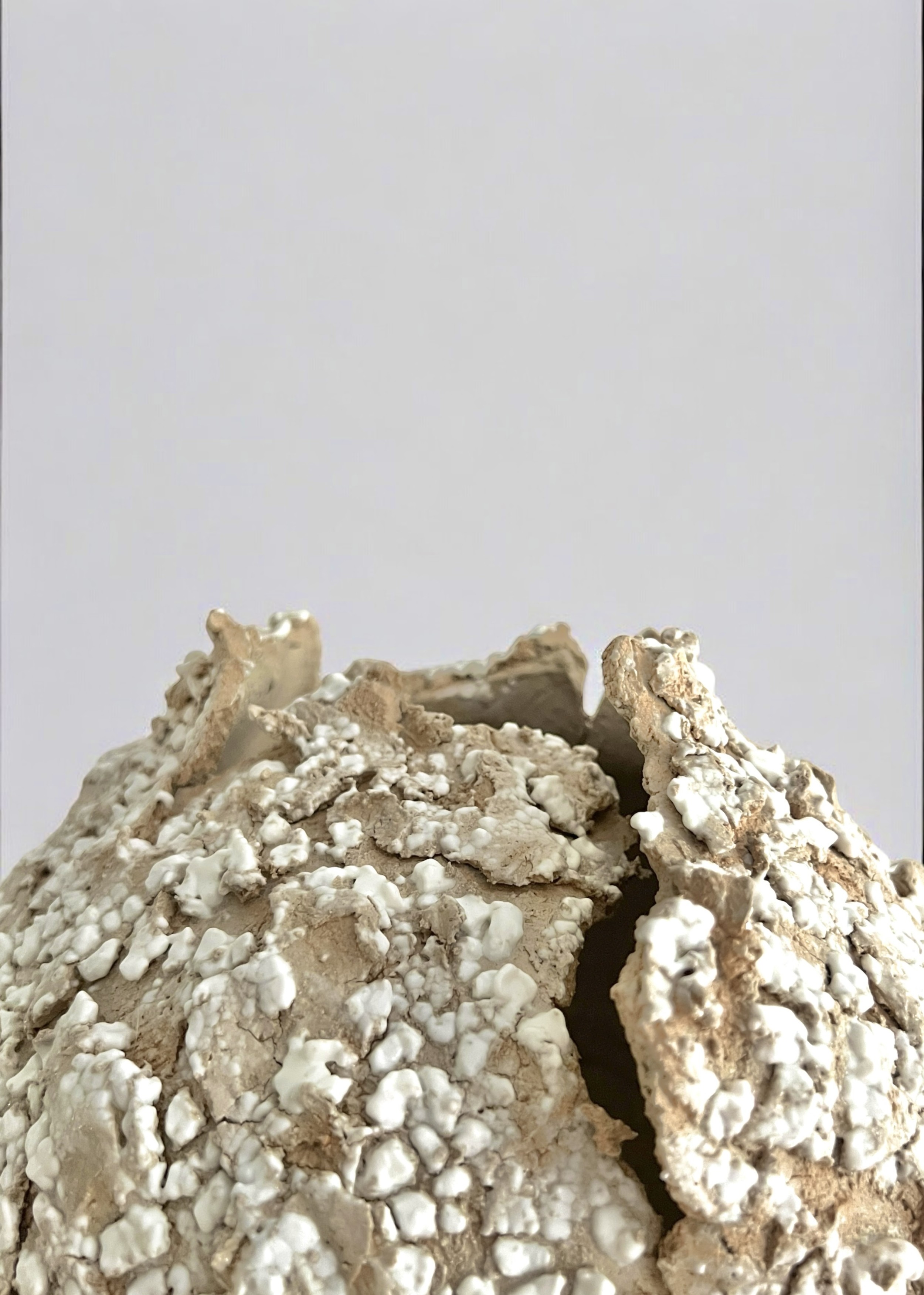 Contemporary stoneware sculptural urn/vase featuring a beige and white rounded organic form with a heavily textured surface bearing an irregular opening at the top