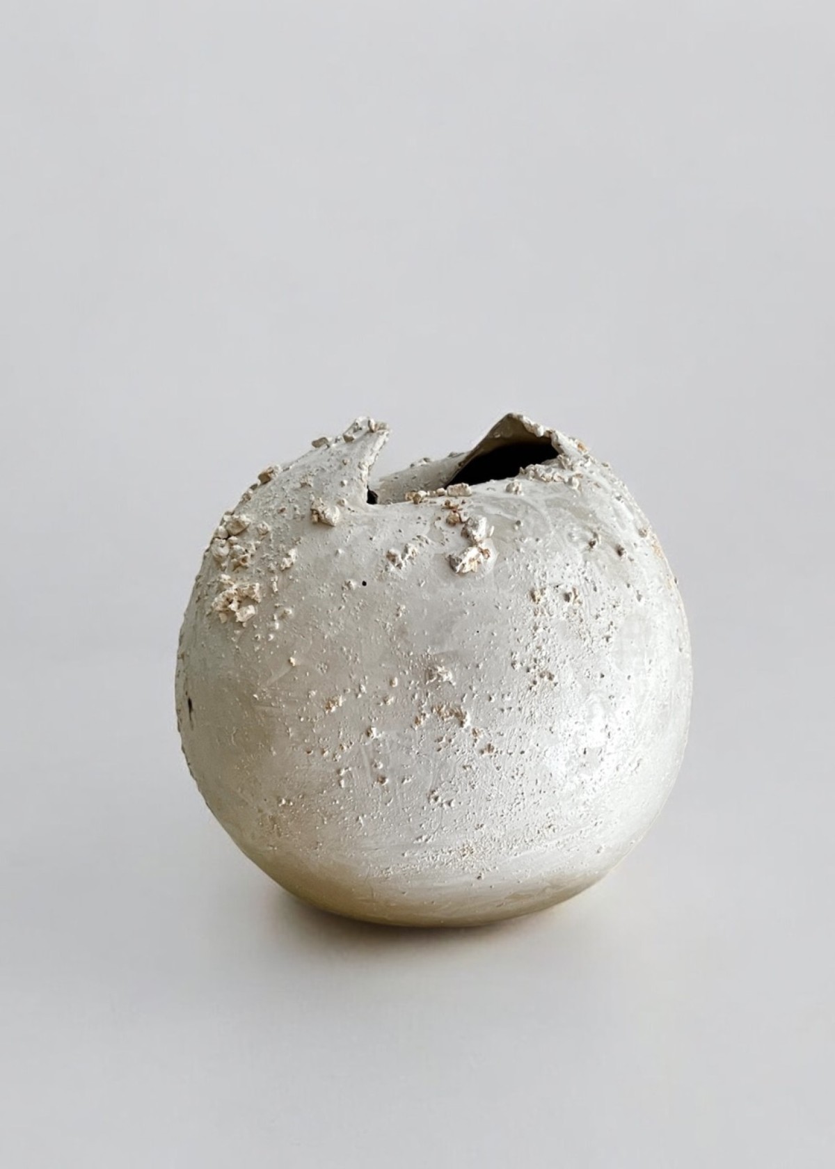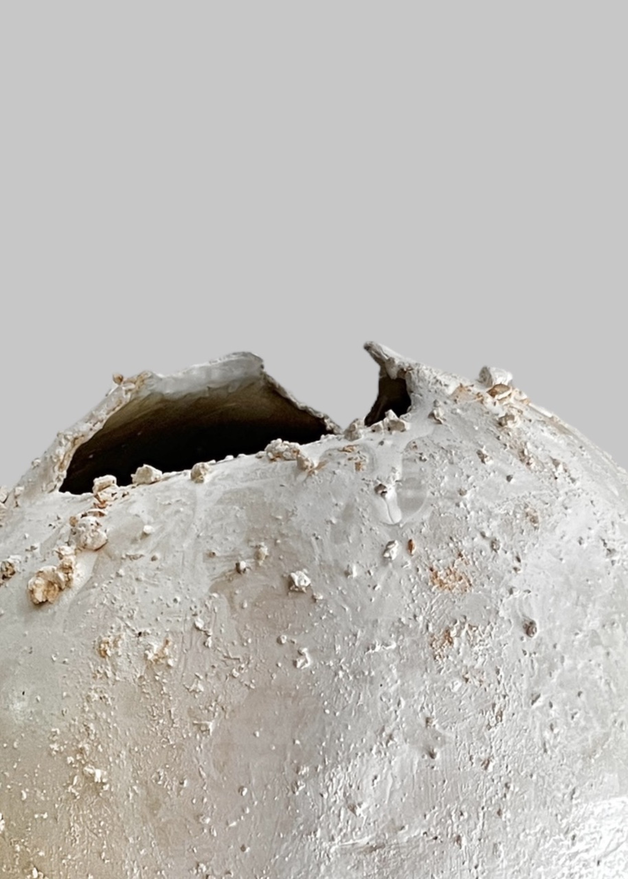 2 Contemporary stoneware sculptural urns/vases featuring beige and white rounded, organic forms with subtly textured surfaces bearing irregular openings