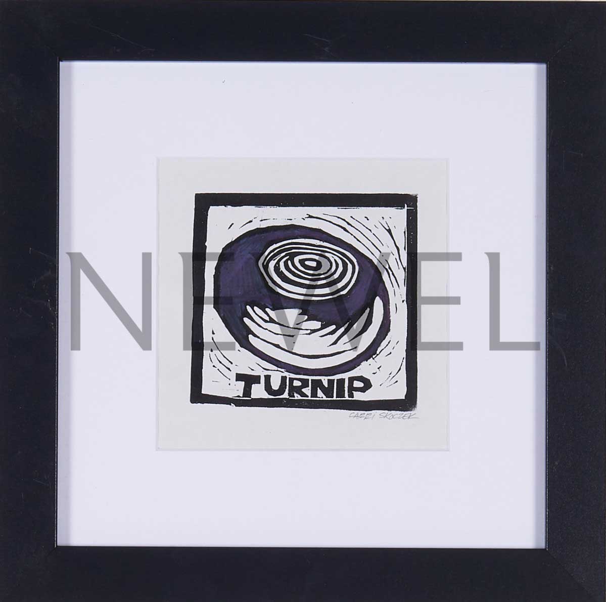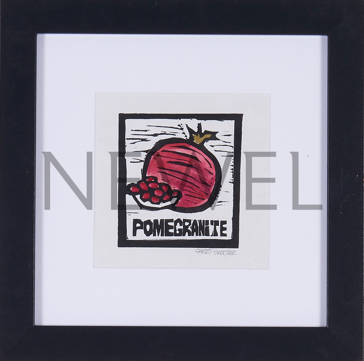 Contemporary linocut of a pomegranate in a black square frame with white matting titled "Pomegranate" (Companion pieces: AAP013, AAP014, AAP015, AAP017)