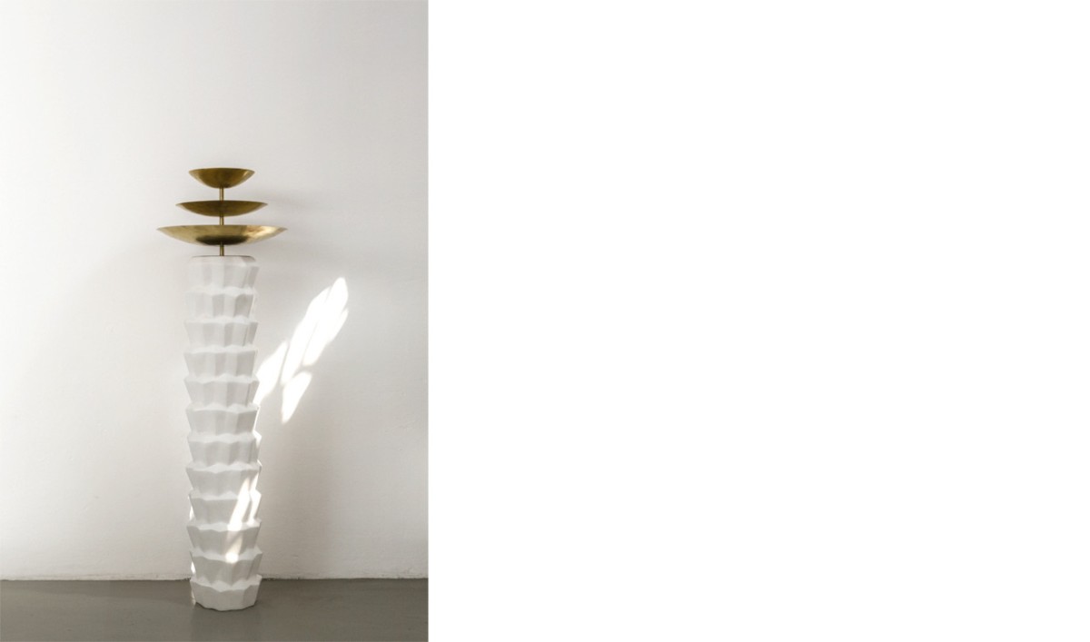 Contemporary floor lamp with circular column made with staggered white terracotta geometric blocks raising a three tiered graduated organically shaped brass canopies