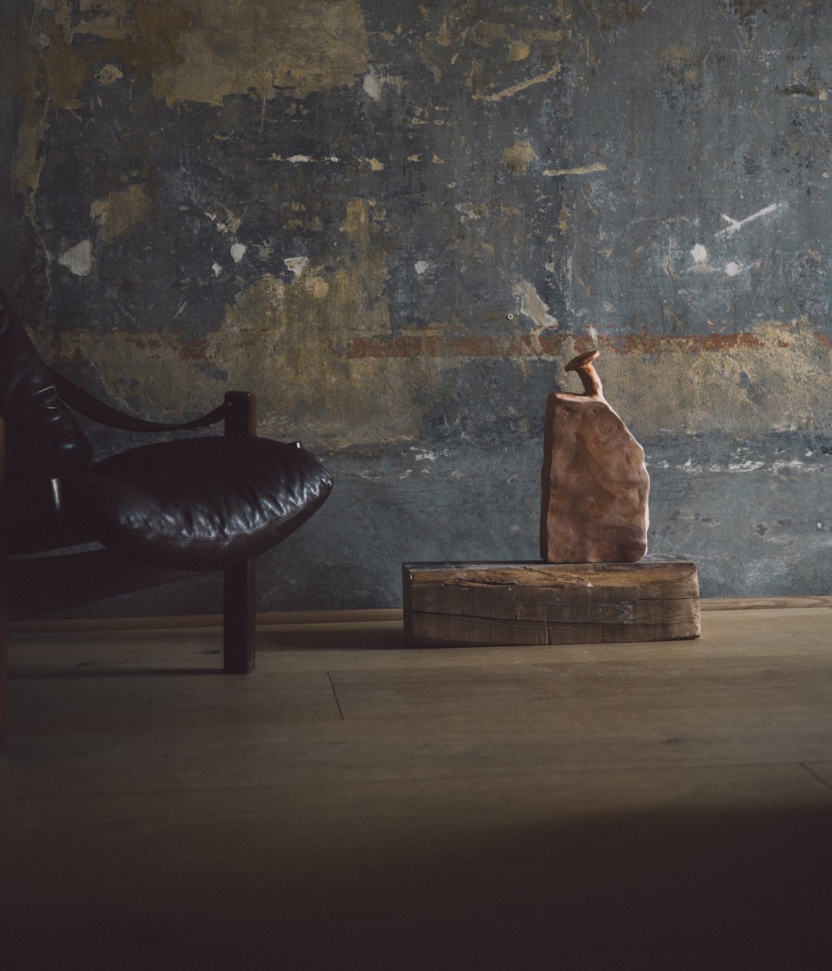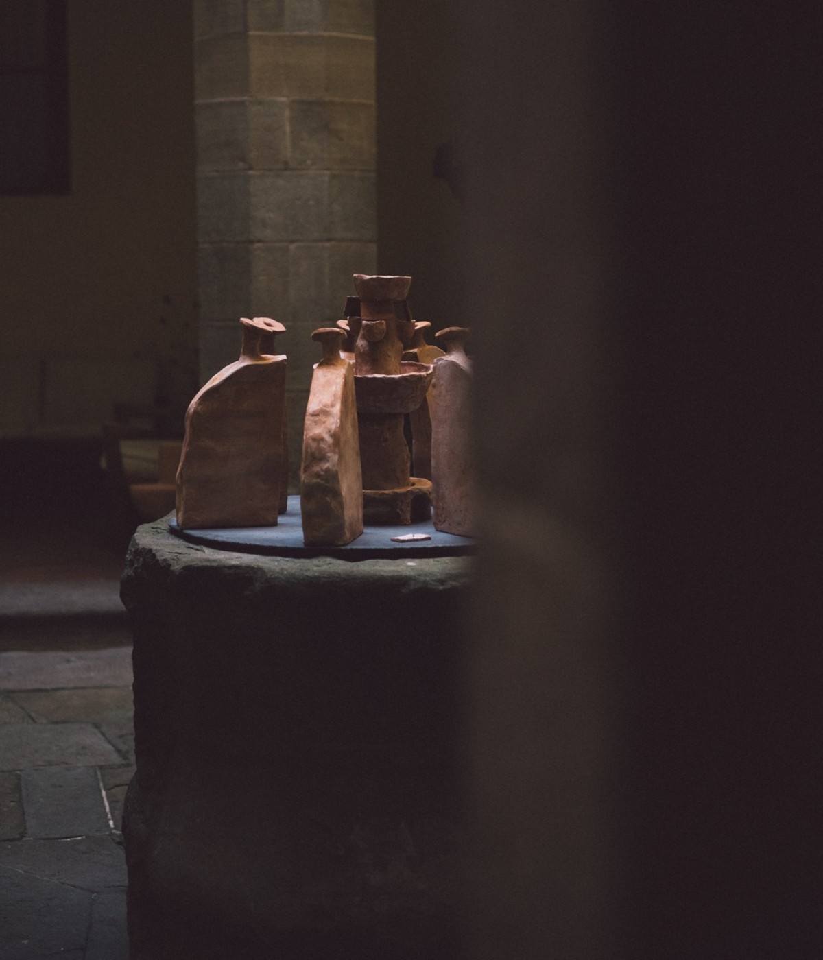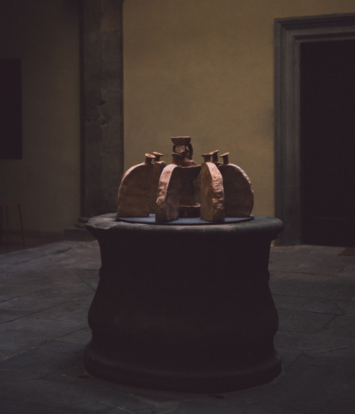 4 Contemporary MMXXI Florence terracotta urns/vases featuring flattened organic forms with raw, tactile, earthy surfaces